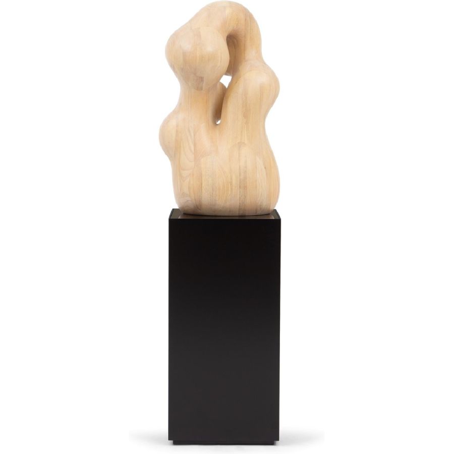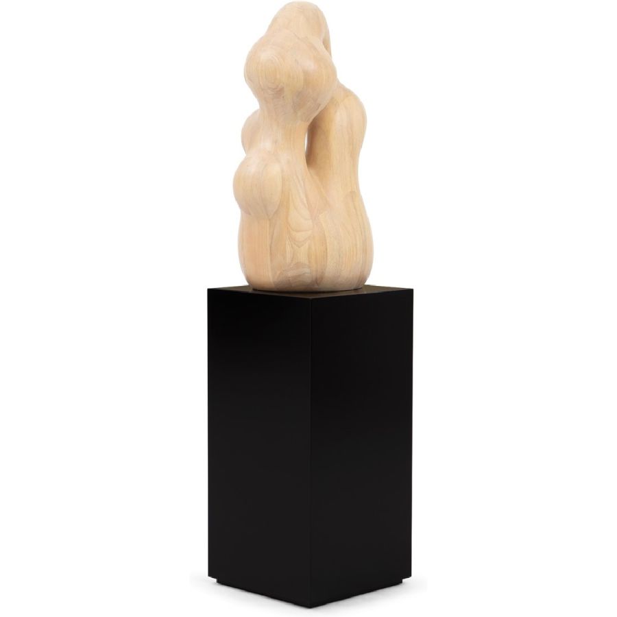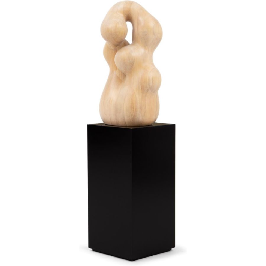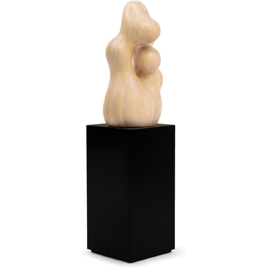 A beautifully handcrafted abstract natural wood sculpture displayed on an elegant black wood pedestal.