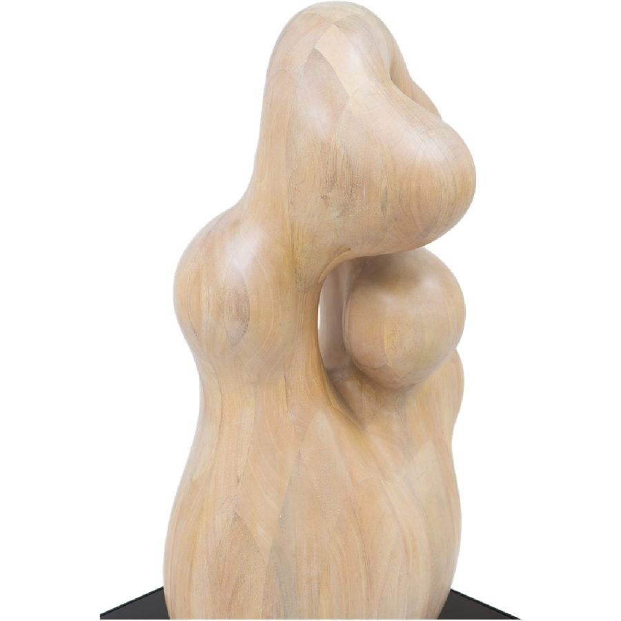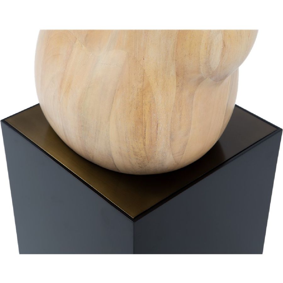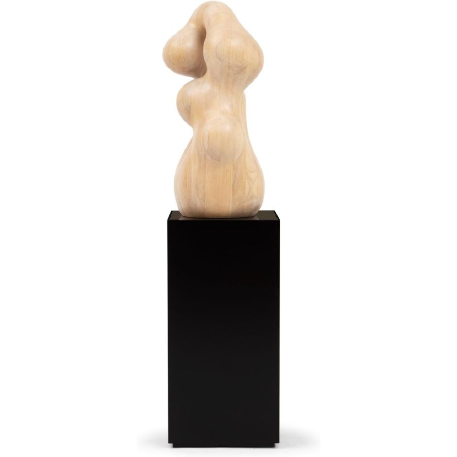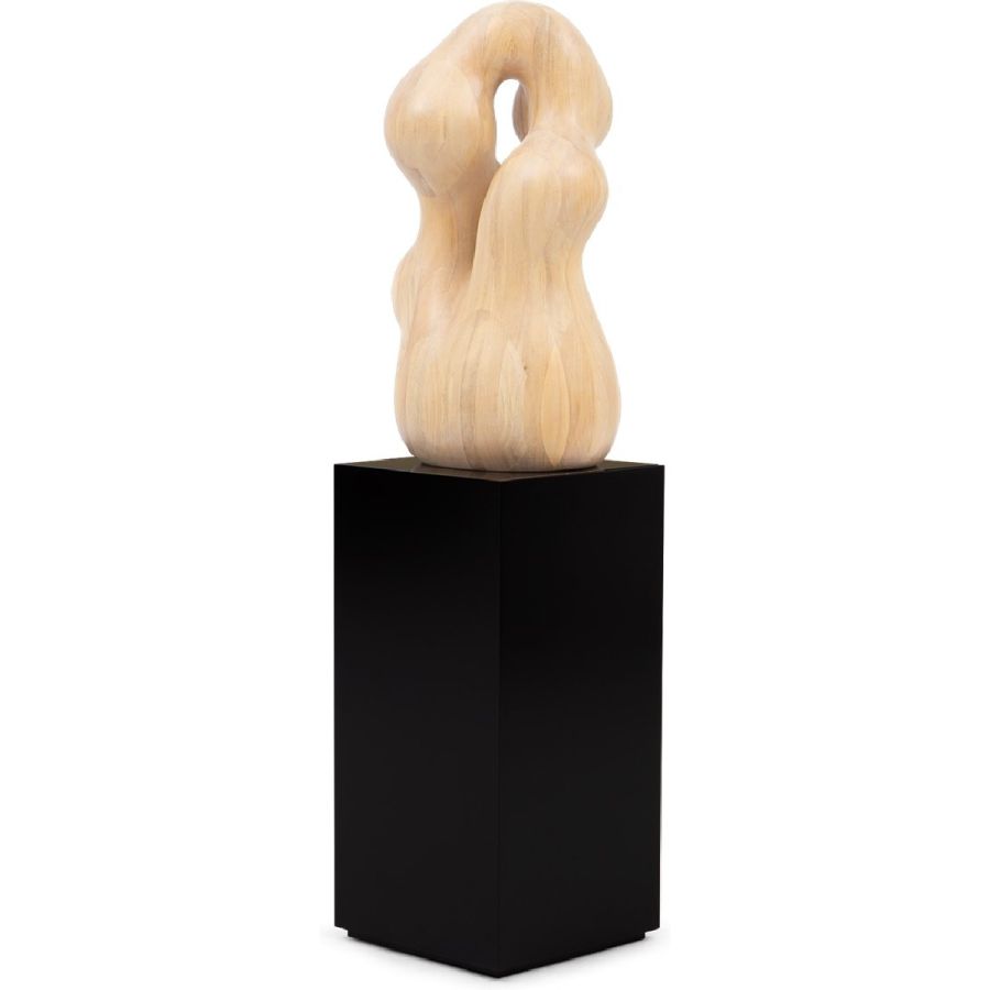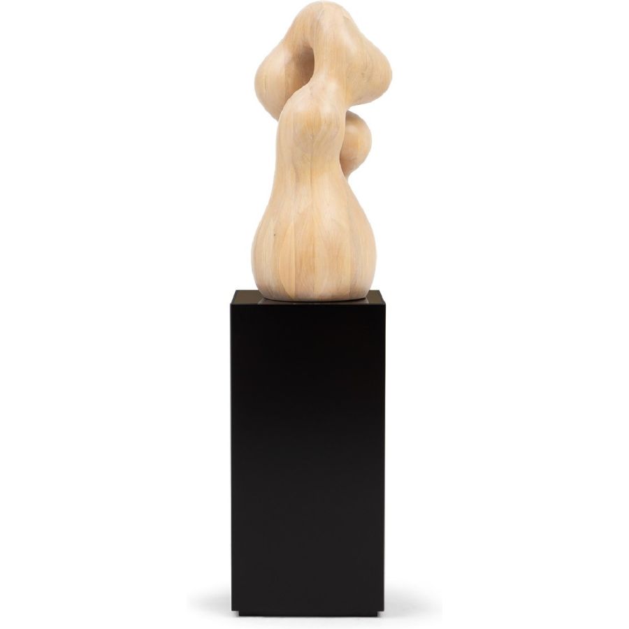A beautifully handcrafted abstract natural wood sculpture displayed on an elegant black wood pedestal.