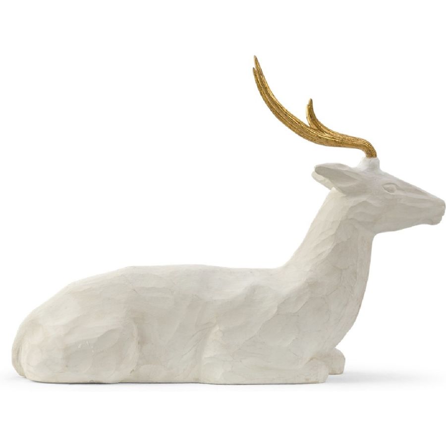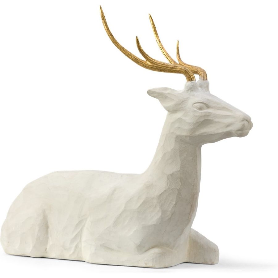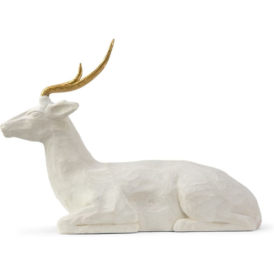 The mere image of this Deer exemplifies a peaceful image... resting and poised. The essence of this beautiful carving is gracefully understated. Carved of stone and adorned with gold leafed antlers to exhibit a true artisans attention to detail. BELLE!