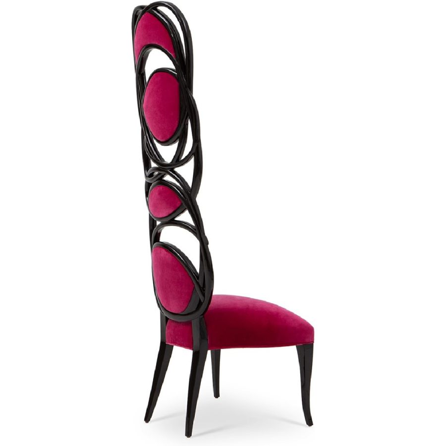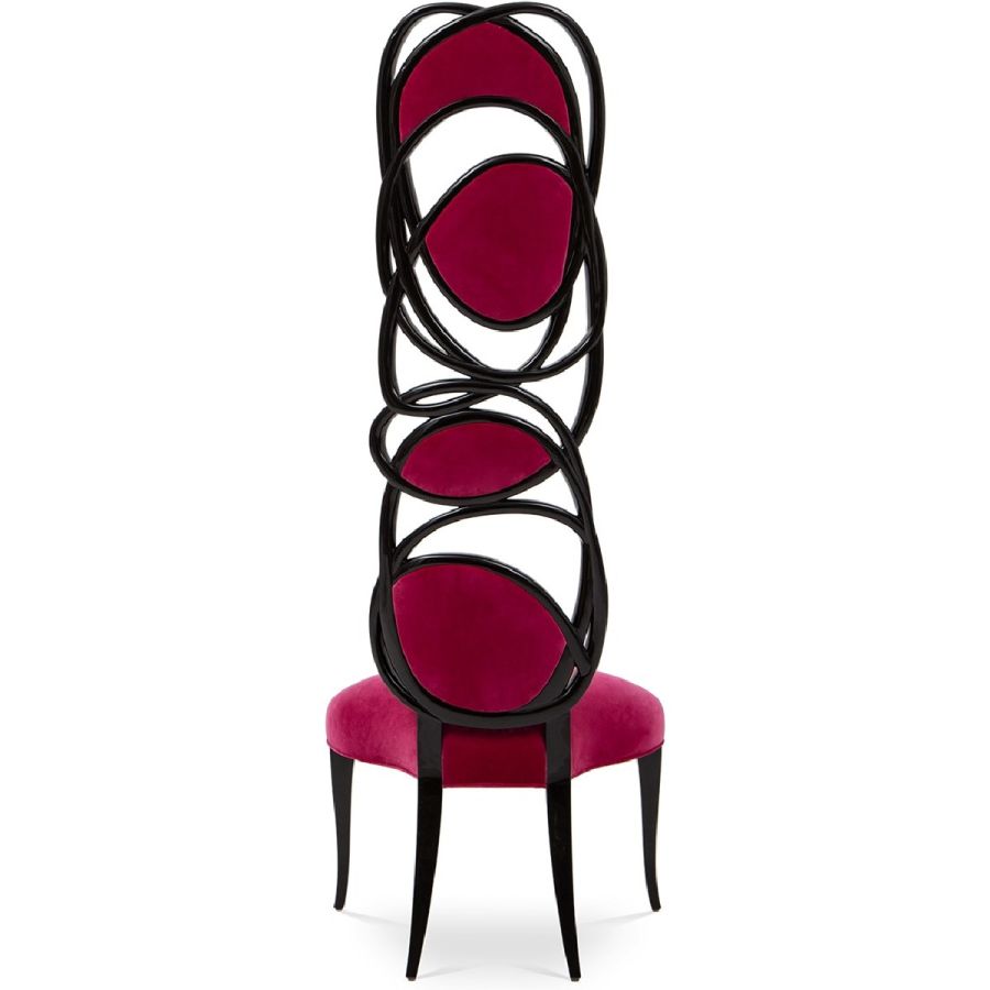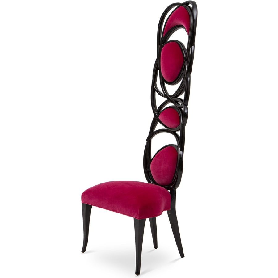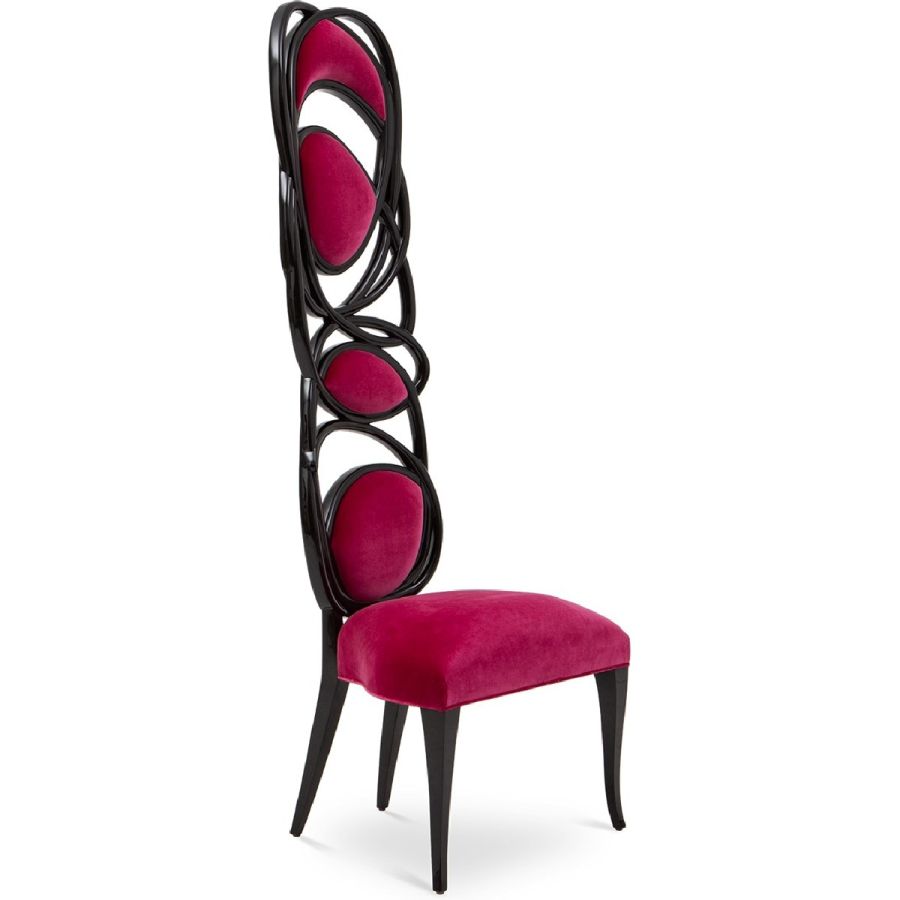 With a high back formed from swirls of concentric and interlocking curves, beautifully hand carved and with inset upholstered pieces, this elegant and original dining chair is set to grace and enhance any dining room setting. Also available with a lower height back (30-0200) and with arms (30-0199).