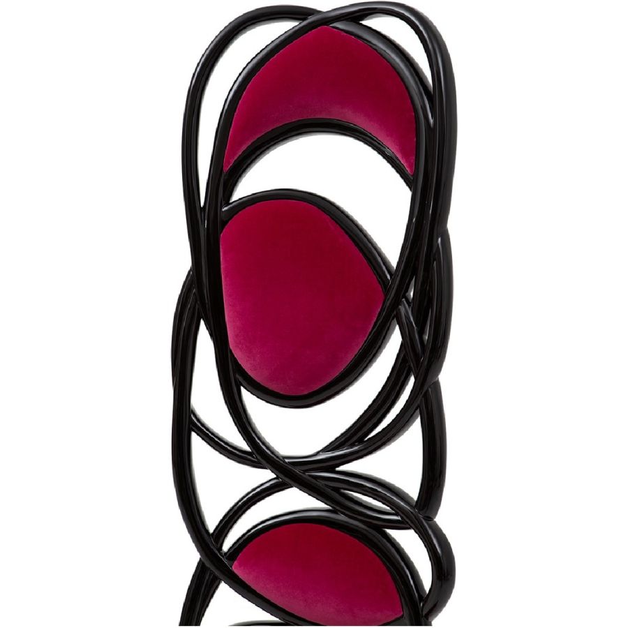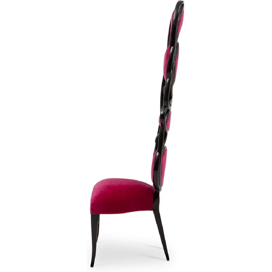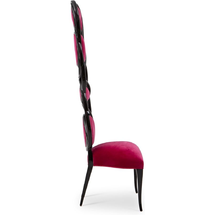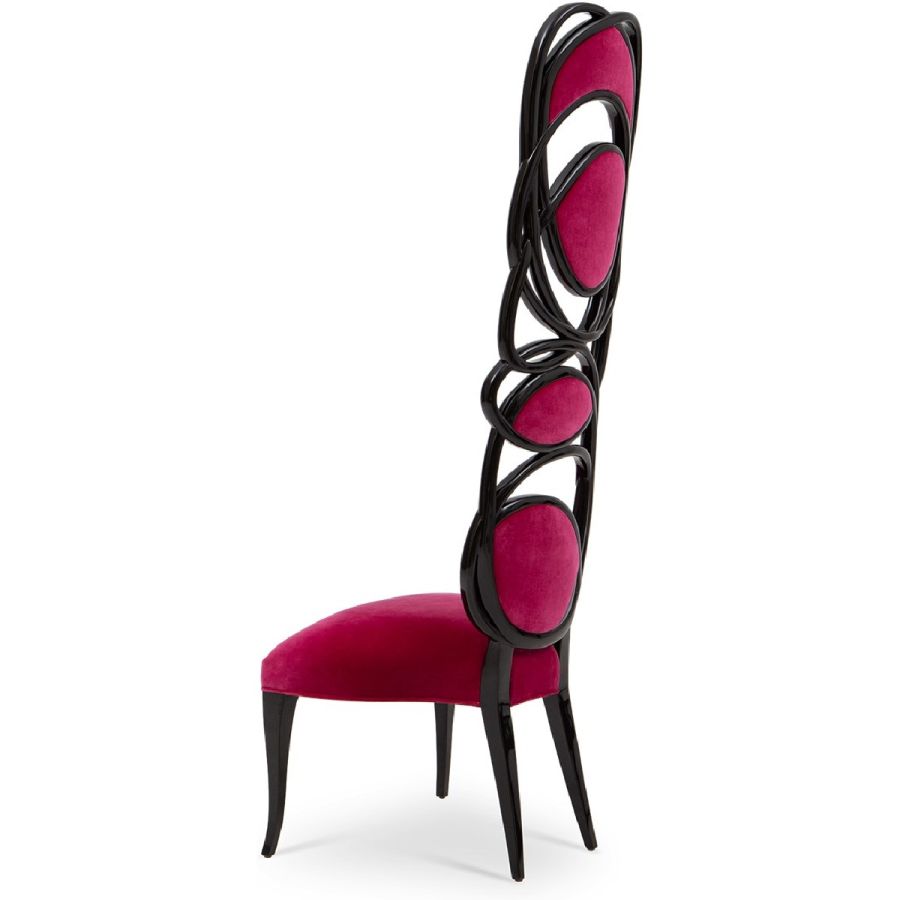 With a high back formed from swirls of concentric and interlocking curves, beautifully hand carved and with inset upholstered pieces, this elegant and original dining chair is set to grace and enhance any dining room setting. Also available with a lower height back (30-0200) and with arms (30-0199).