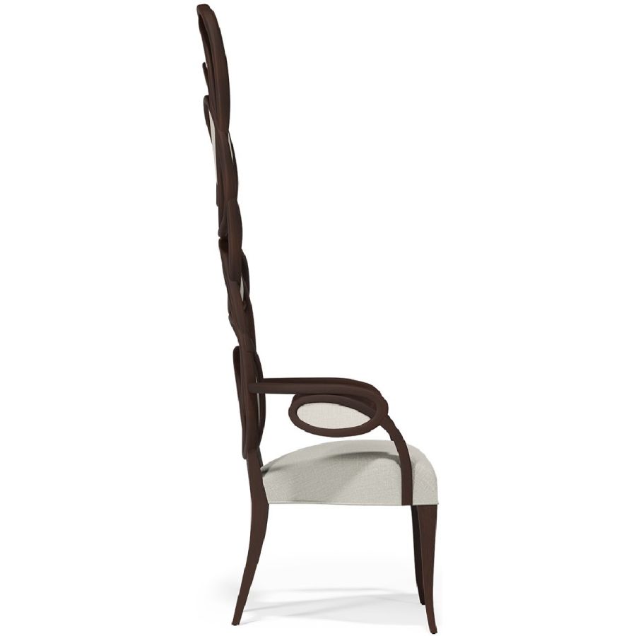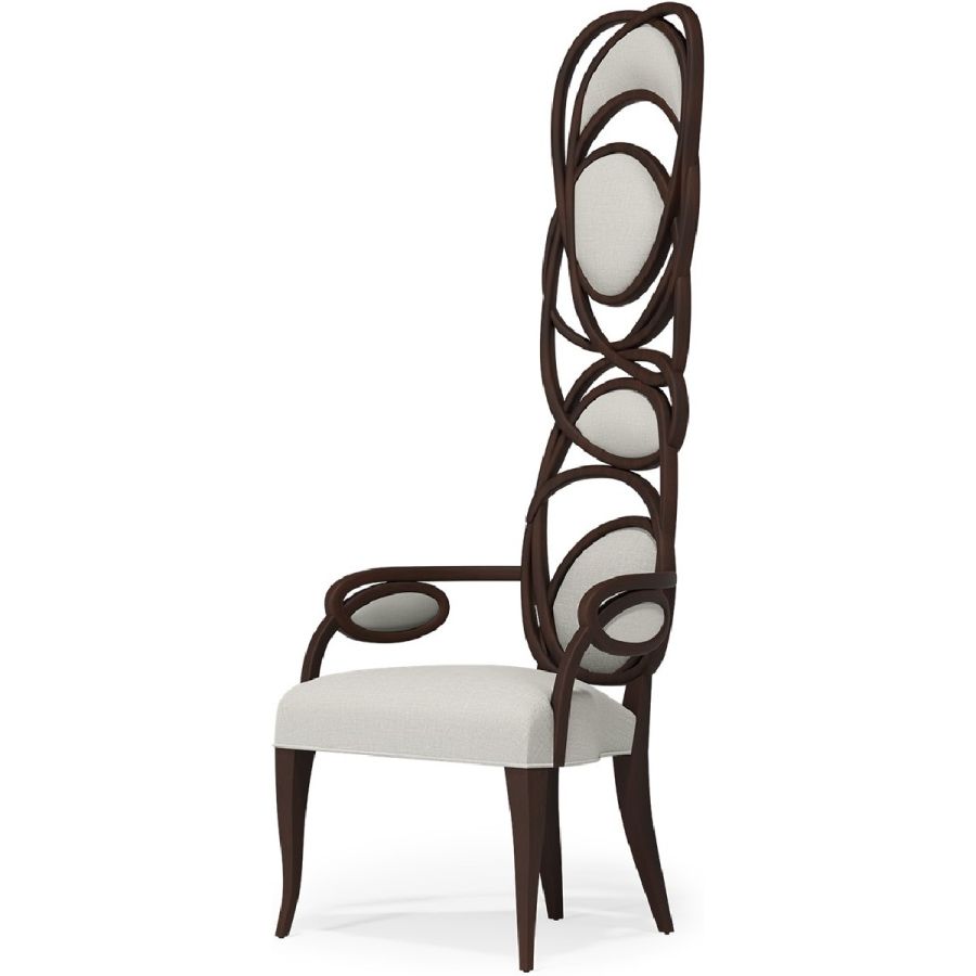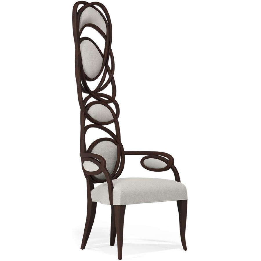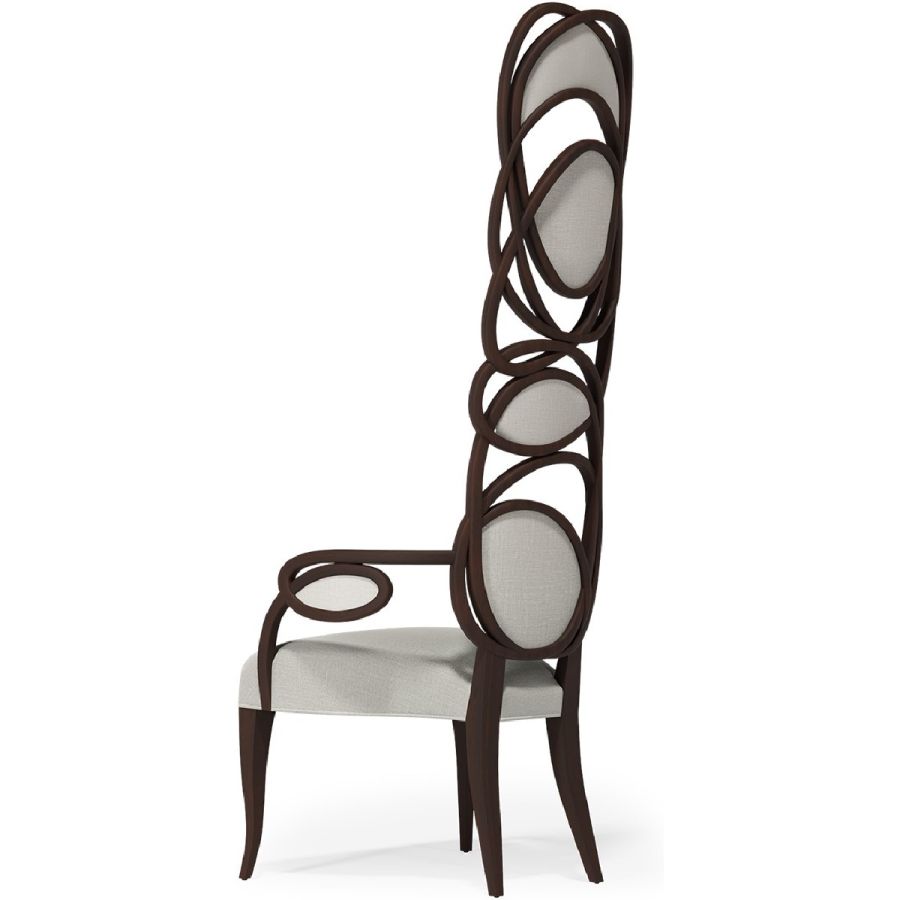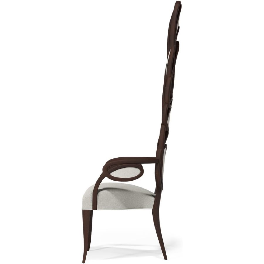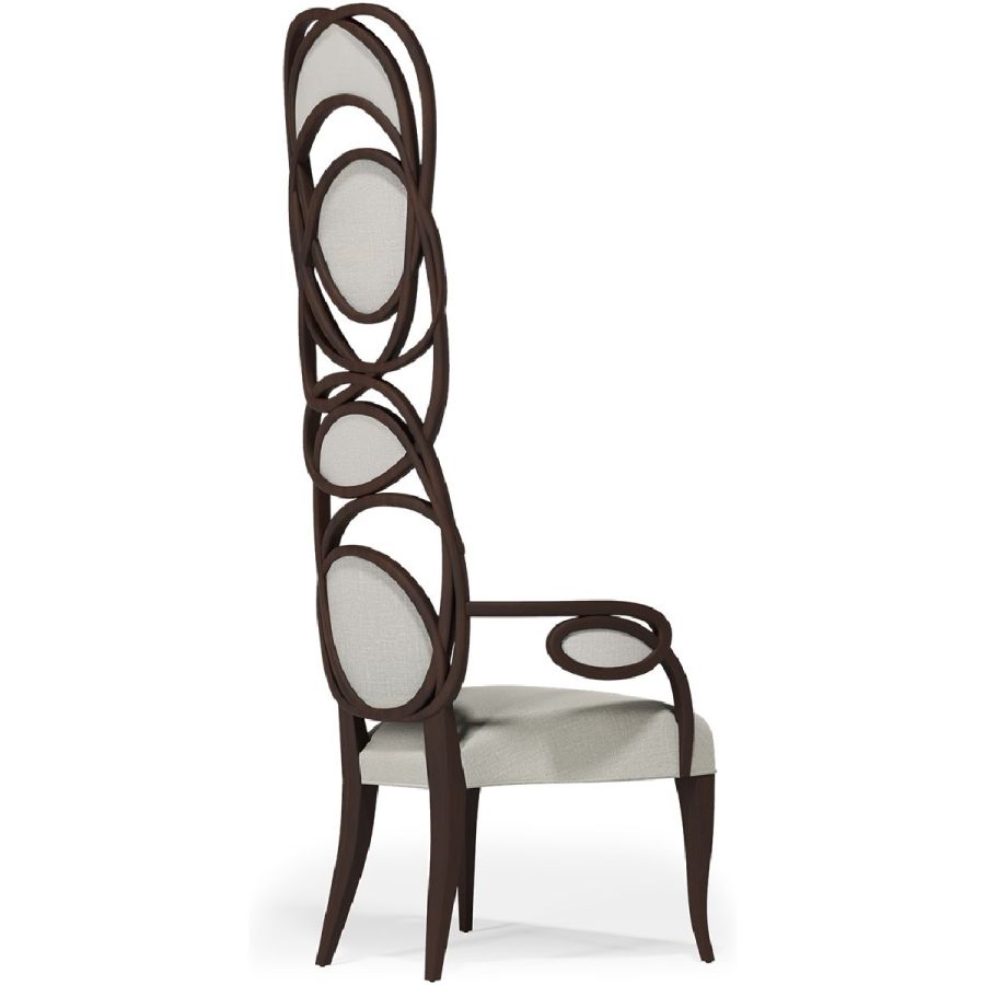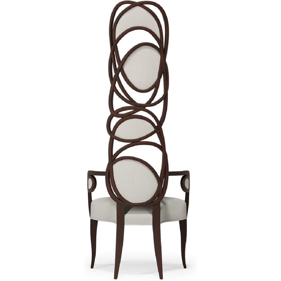 With a high back formed from swirls of concentric and interlocking curves, beautifully hand carved and with inset upholstered pieces and arm rests, this elegant and original dining chair is set to grace and enhance any dining room setting. Also available with a lower back (30-0201) and without arms (30-0198).