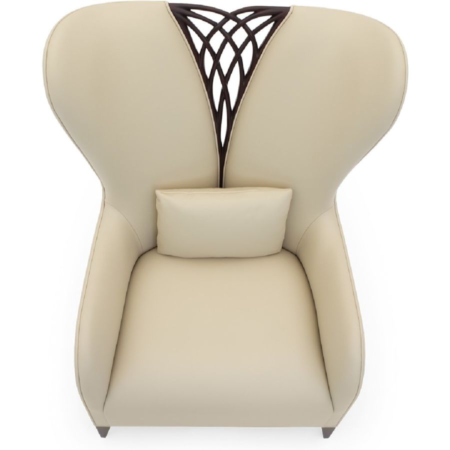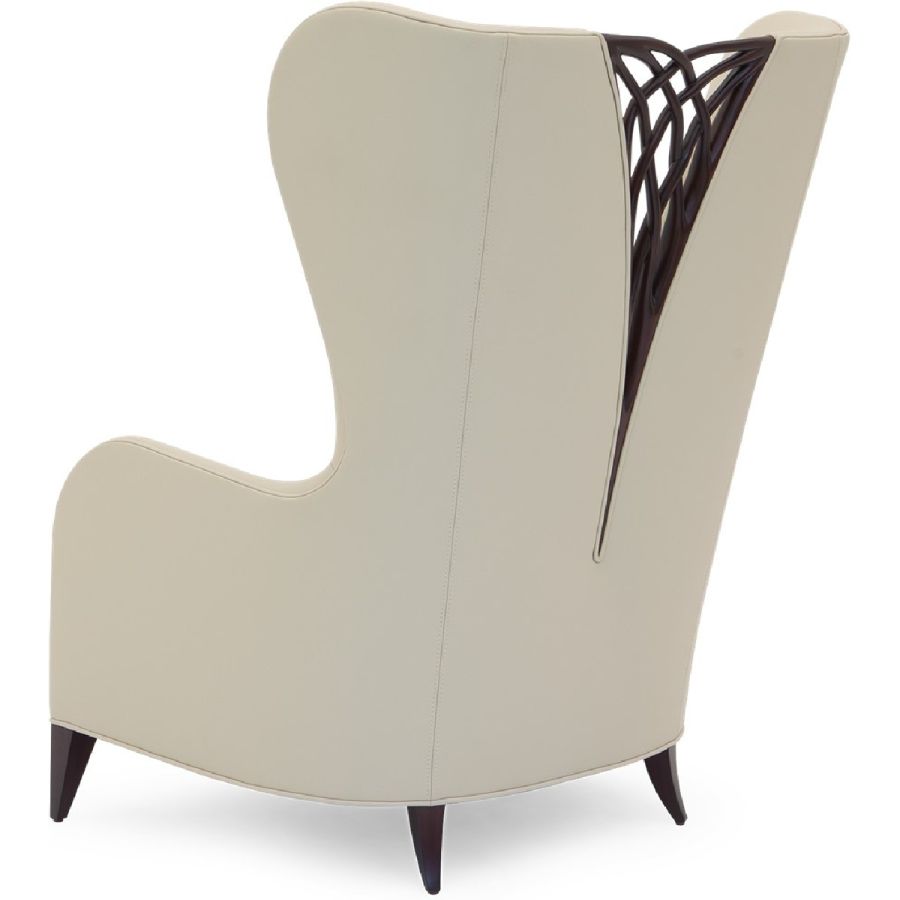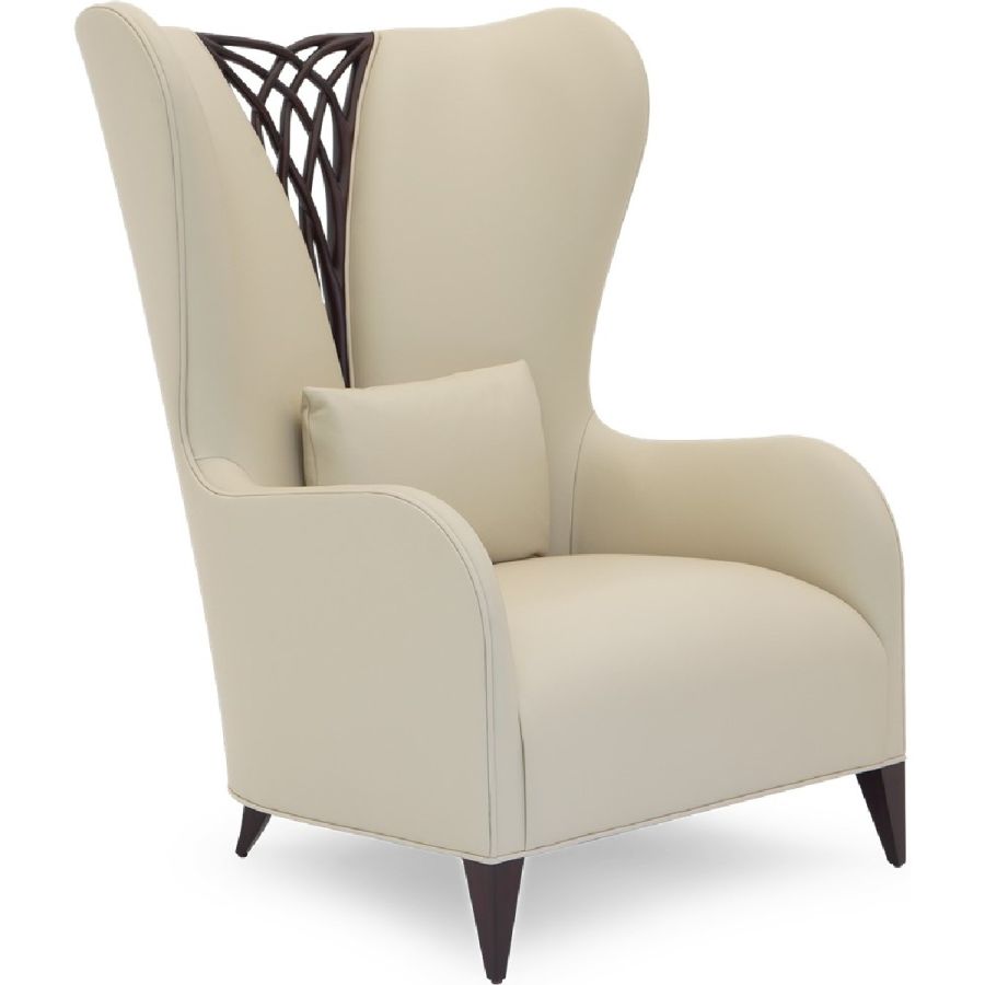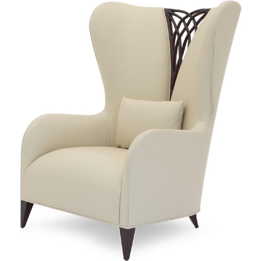 This magnificent armchair features a symmetrical carved twine, accompanied with a winged backrest and flowing armrests.