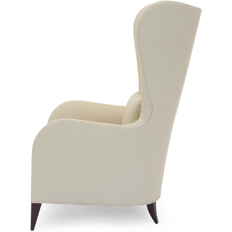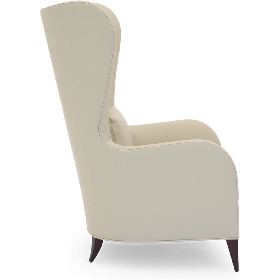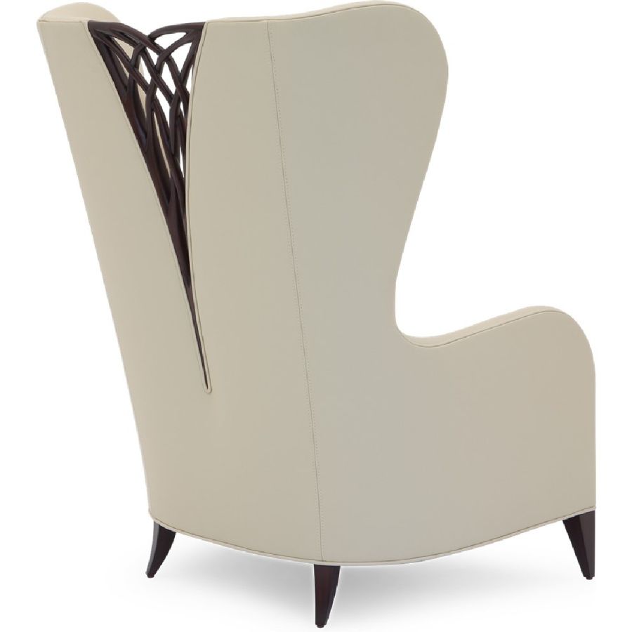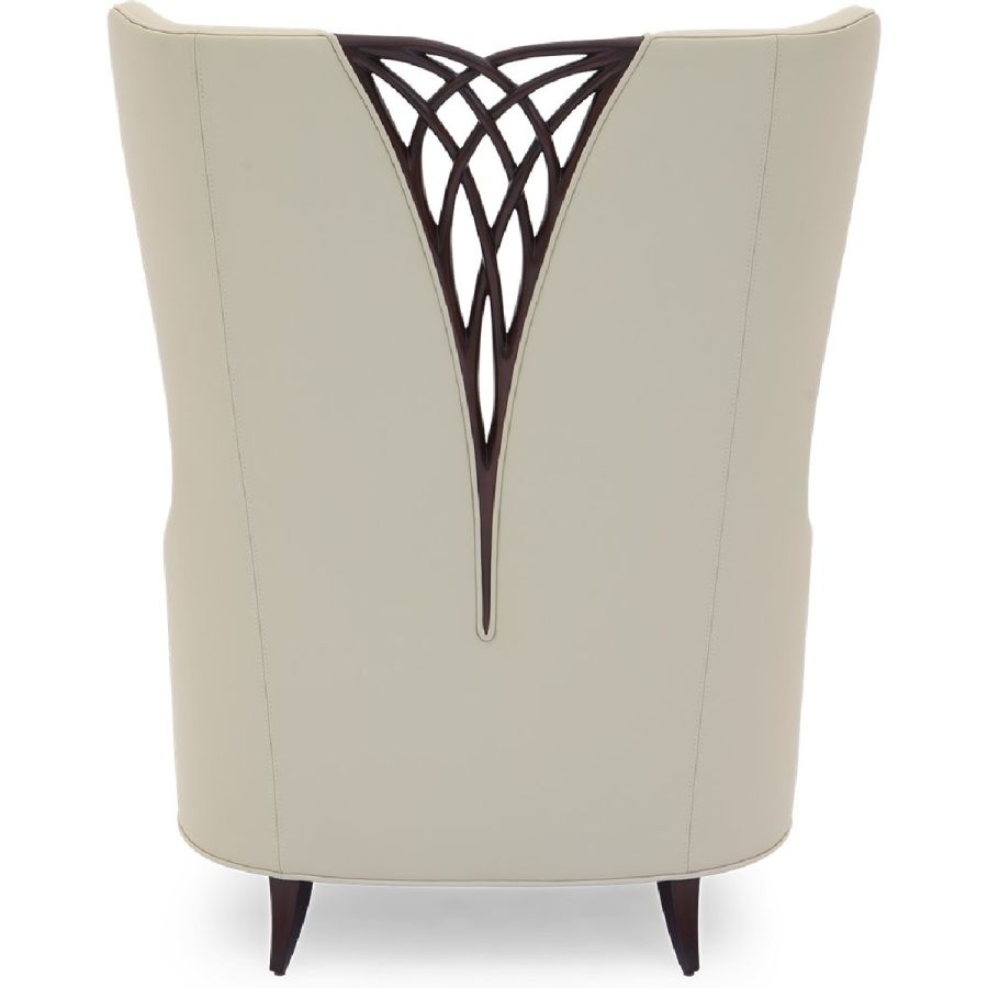 This magnificent armchair features a symmetrical carved twine, accompanied with a winged backrest and flowing armrests.