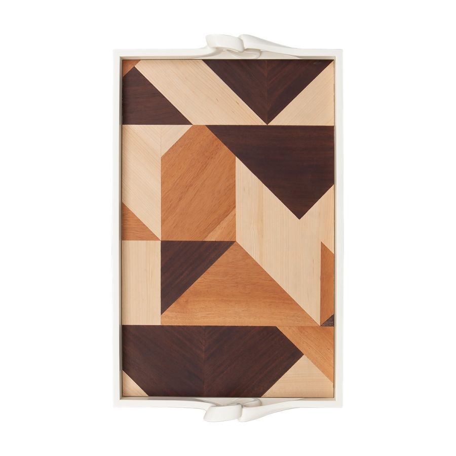Defined by bold geometry, this mahogany tray features a dynamic veneer pattern and hand-carved ribbon handles. Its striking angular form is available in a range of rich tone combinations and two sizes—ideal for serving, styling, or display.