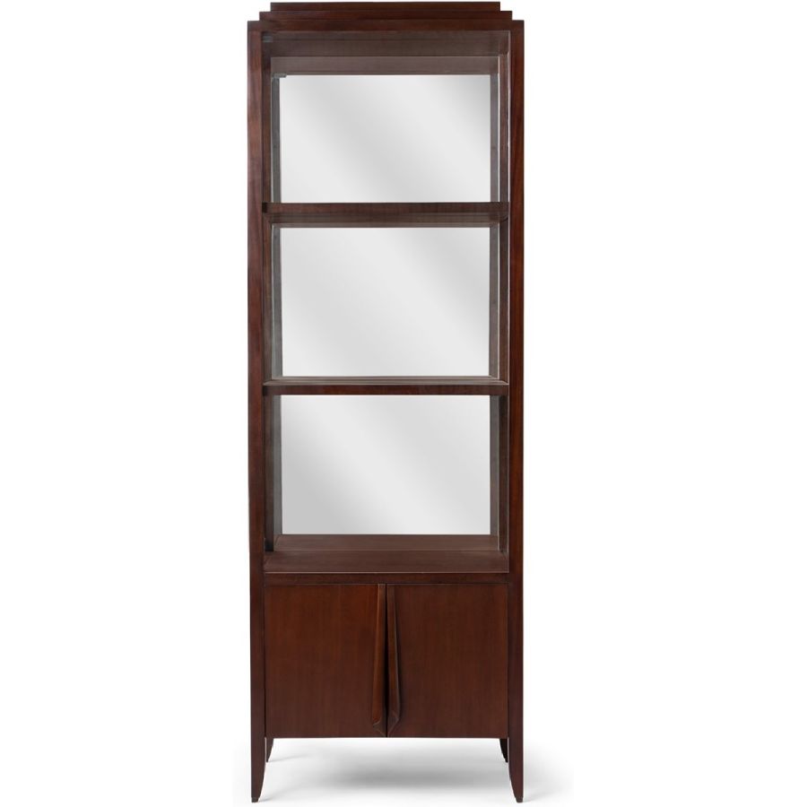 Supreme elegance is epitomized in this tall vitrine, featuring a stepped top, four-sided glass display with side-hinged access, three shelves and a double-doored lower cabinet with beautiful hand carved signature scrollwork handles. Also available as a bookcase or display case (88-0035).