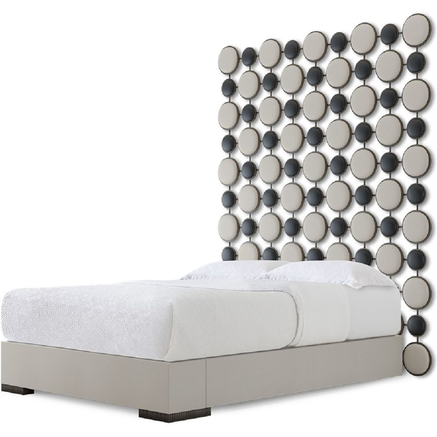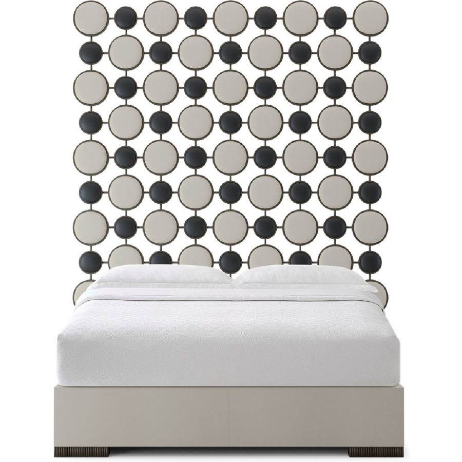 Inspired by the famous game, this stunning contemporary bed is made up of rows with alternating larger and smaller upholstered discs encircled in wood and joined together by a metal frame. A spectacular, eye-catching statement piece!