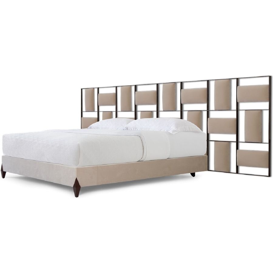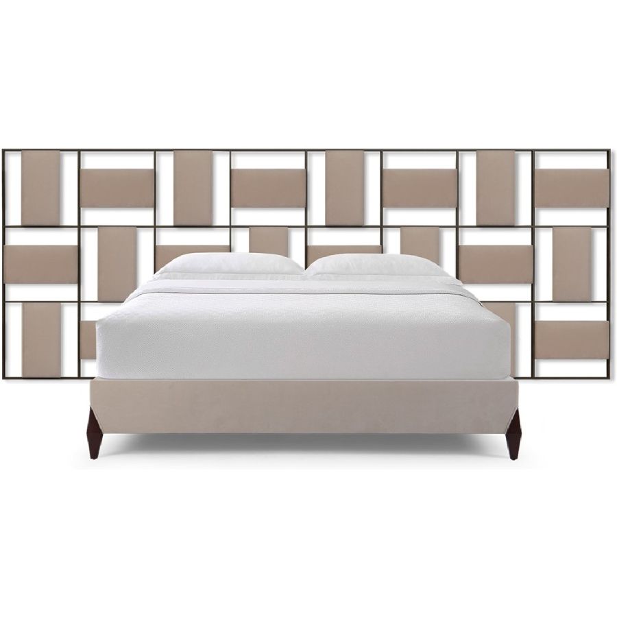 This contemporary styled bed features a headboard designed with perpendicular upholstered panels within a forged steel frame. A true statement piece.