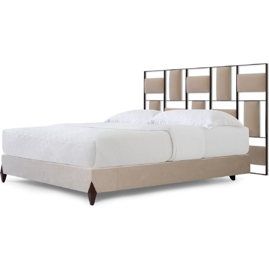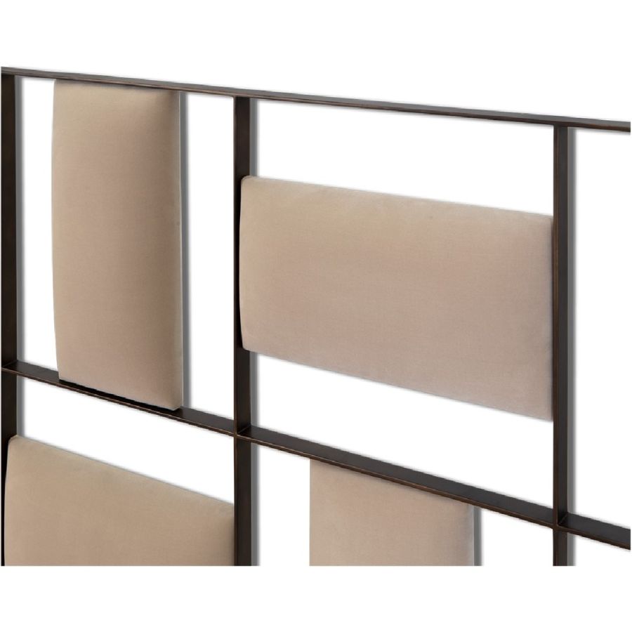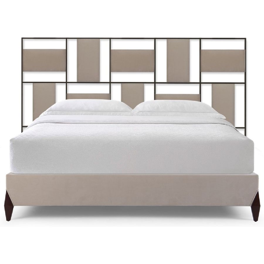 This contemporary styled bed features a headboard designed with perpendicular upholstered panels within a forged steel frame. A true statement piece.