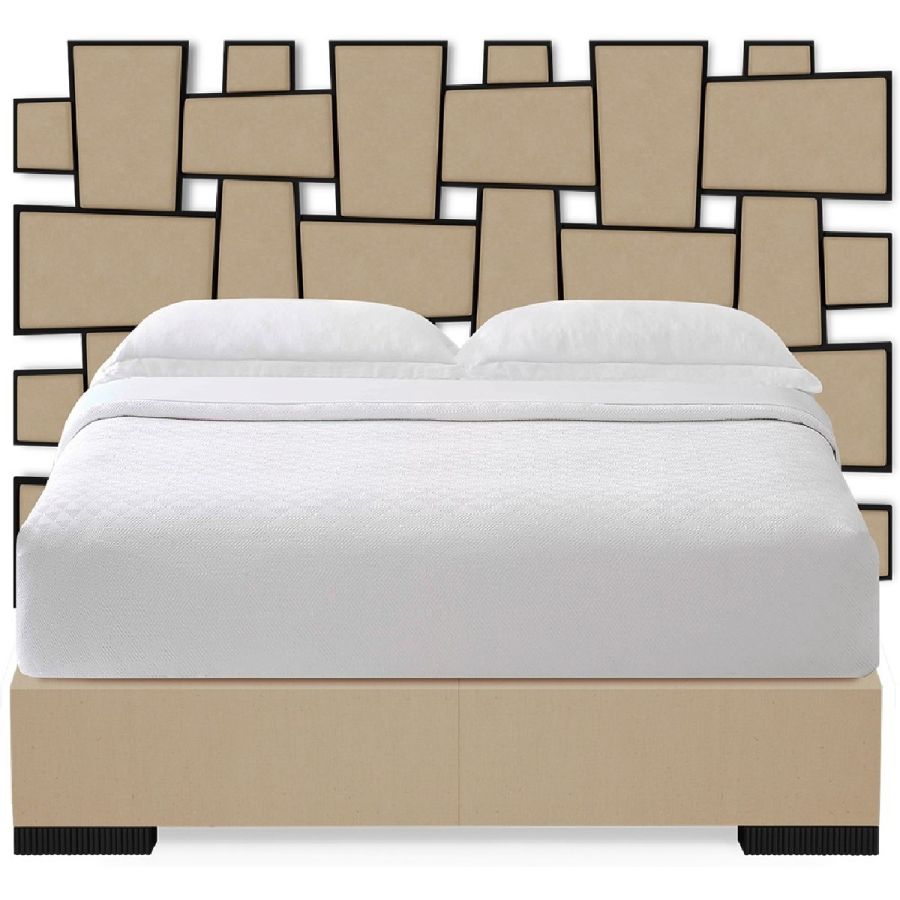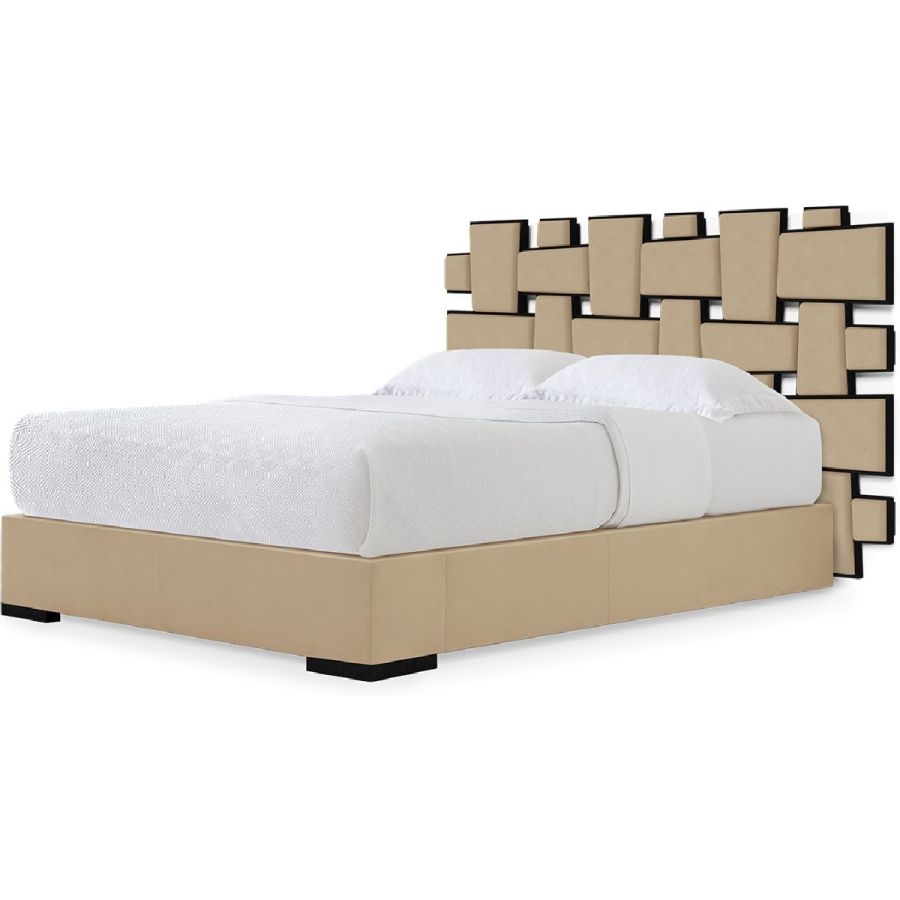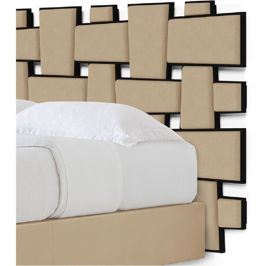 With a dramatic woven pattern featuring interlocking upholstered panels mounted in wooden frames, this spectacular bed is inspired by the mirror created by Christopher Guy for the Chanel No.5 commercial.