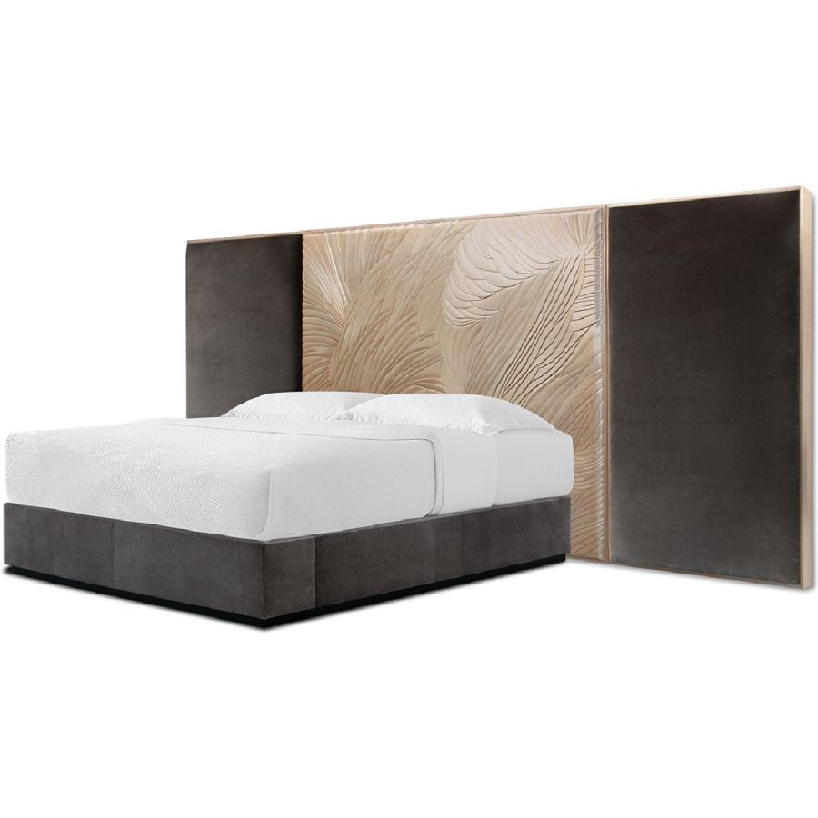 A stunning triptych headboard and divan bed base featuring two upholstered panels with a hand carved wood panel in the center. The relief carving on the central panel is expertly carved to resemble a painter's brush strokes, making this extraordinary piece a unique showstopper for any style of bedroom.