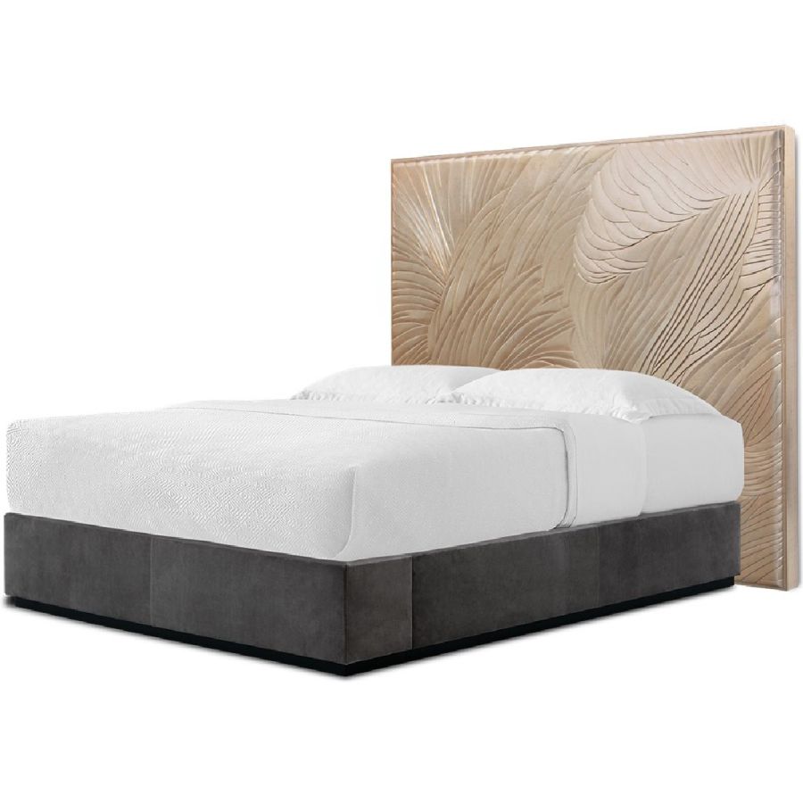 A stunning headboard and divan bed base featuring a hand carved wood panel. The relief carving is expertly crafted to resemble a painter's brush strokes, making this extraordinary piece a unique showstopper for any style of bedroom.