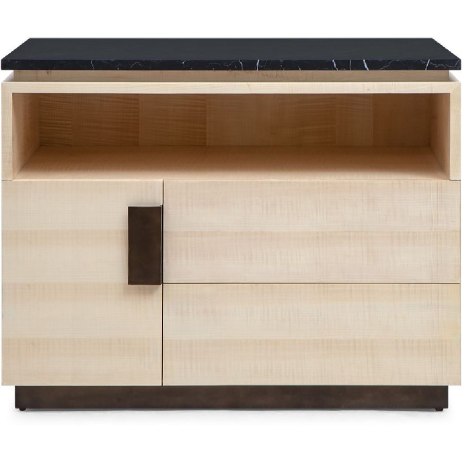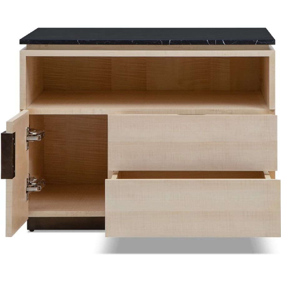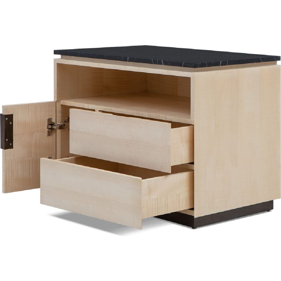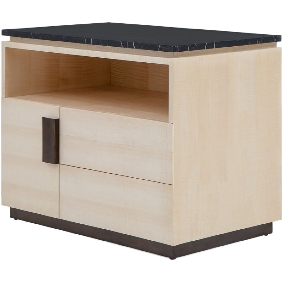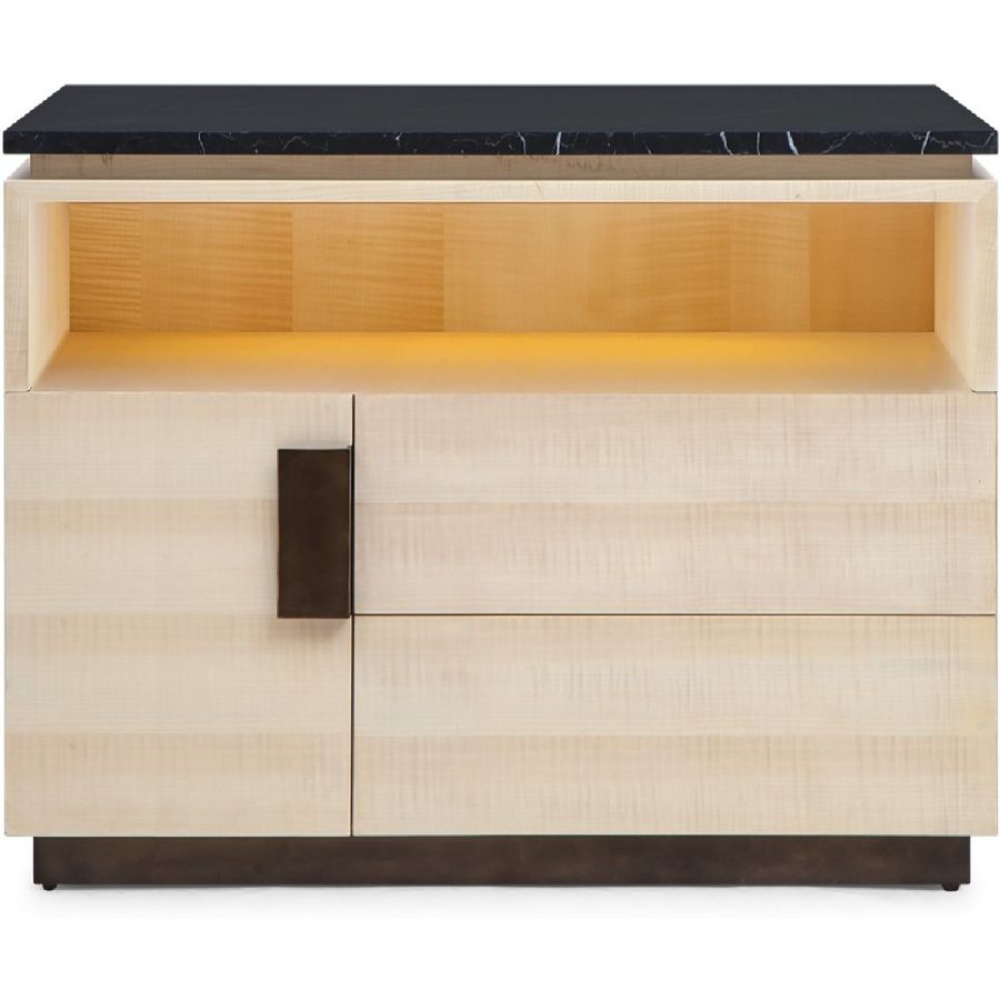 A stunning nightstand with contemporary styling. Hand crafted with an asymmetrical side-opening door, two drawers and a backlit shelf compartment, this striking piece also features an inset base and Nero Marquina Marble top.