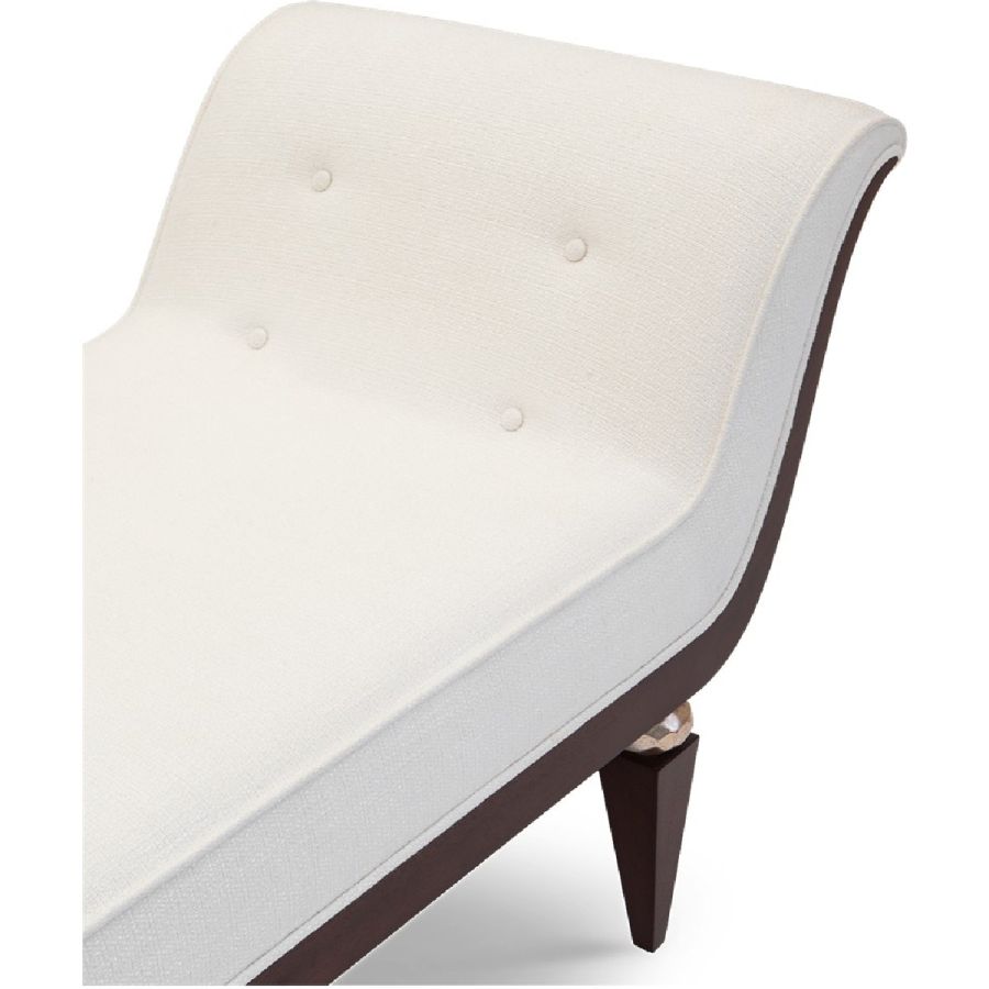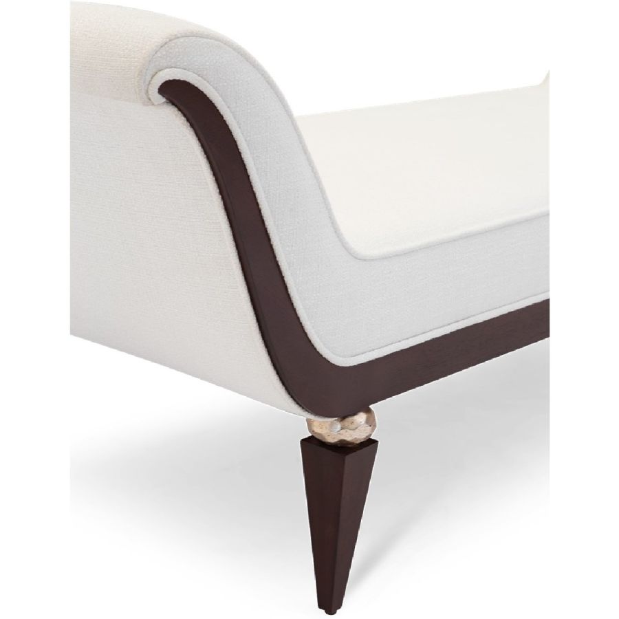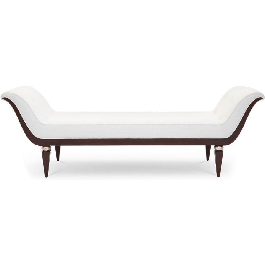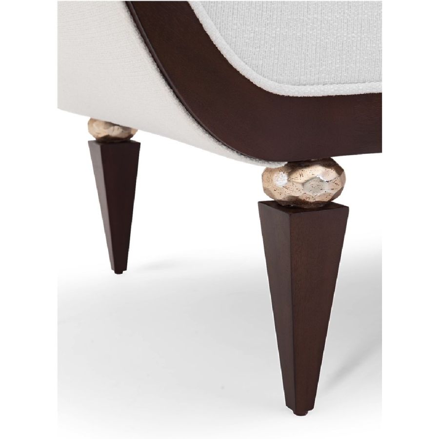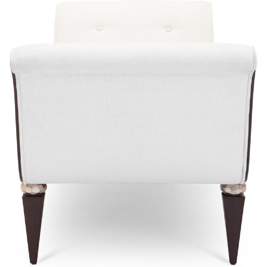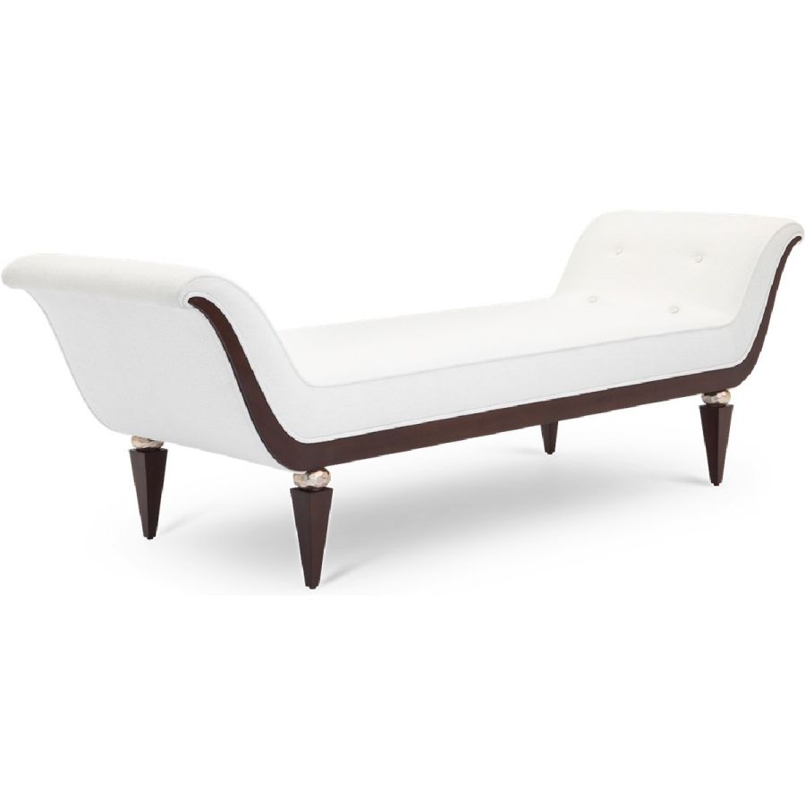 Featuring sleek lines, a single row of tufted buttoning and beautiful hand carved globe detailing on the legs, this banquette is a masterpiece of modern elegance and comfort.
