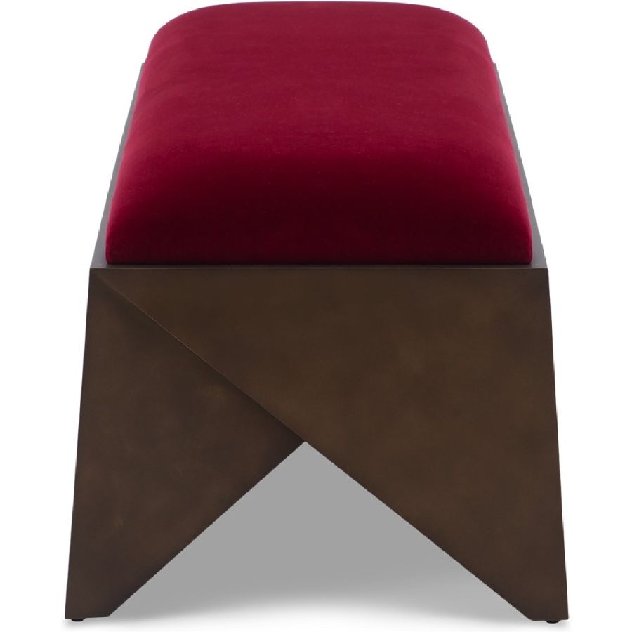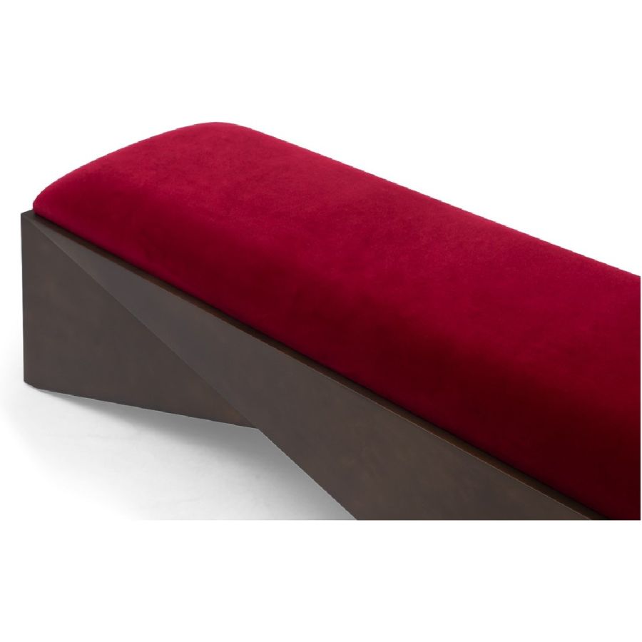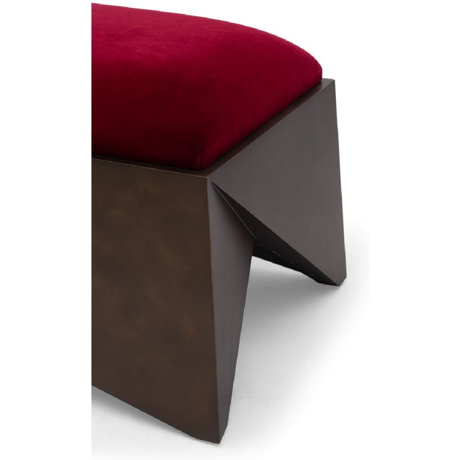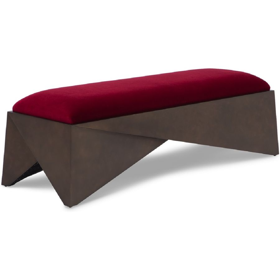 With angular trapezoids in hand carved wood forming a geometric base, the contemporary style of this rectangular bench is softened by the plush upholstered seat making it the perfect accent seat for any style of interior.