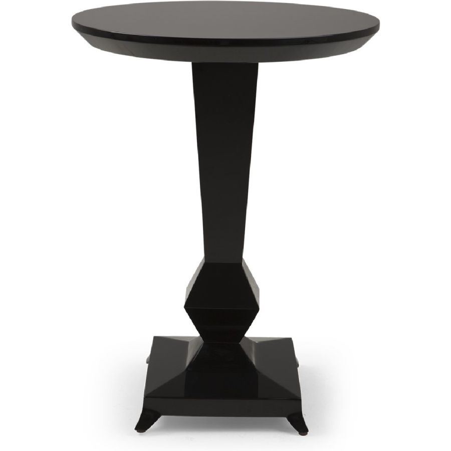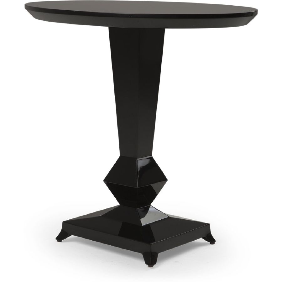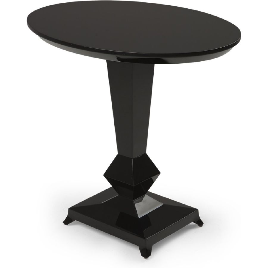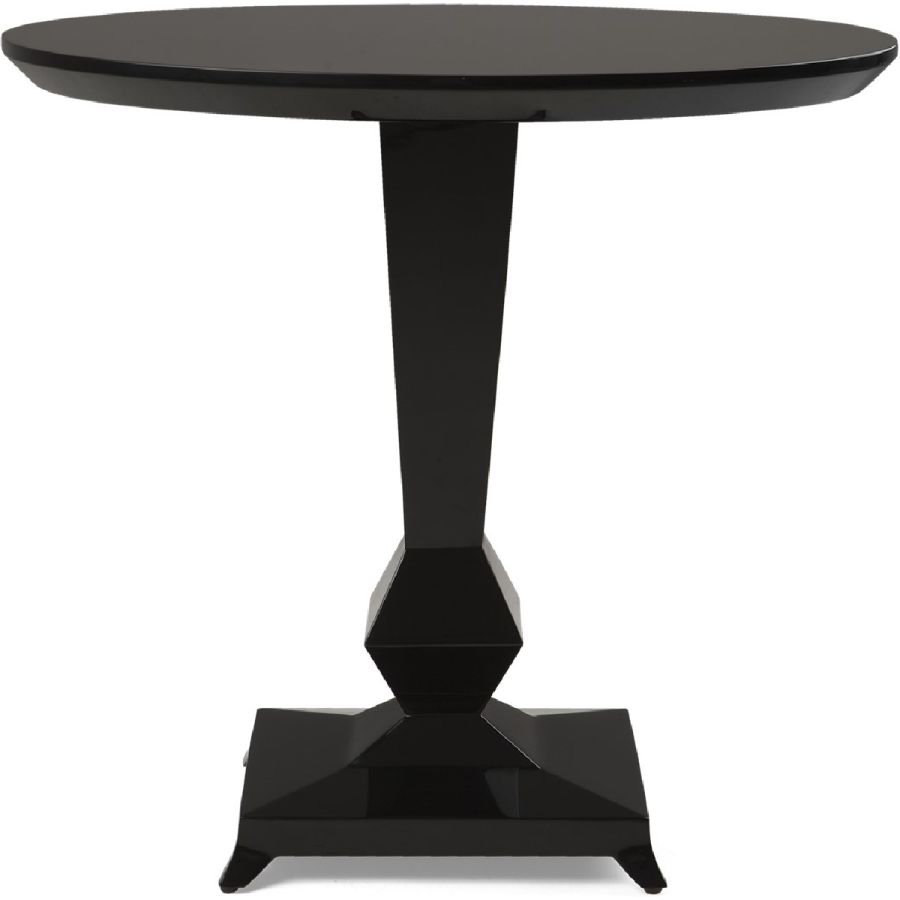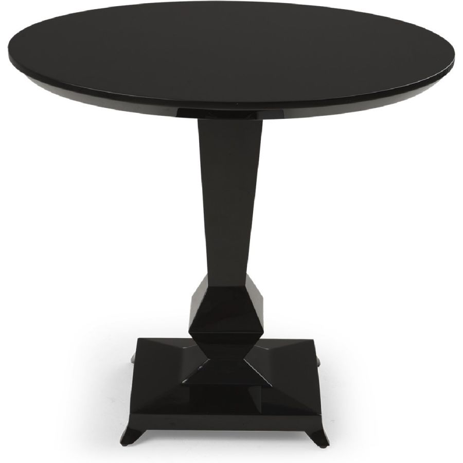 A sophisticated and impactful side/bistro table with strong lines and a single hand-carved leg that tapers into an eight-sided diamond above a gently curving base. The octagonal symbolism is redolent of the mirrors in Mademoiselle’s Rue Gambon apartment.