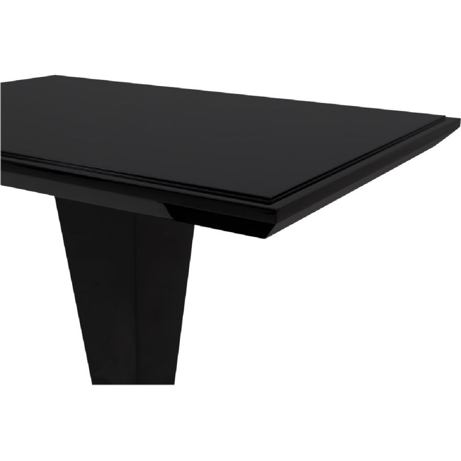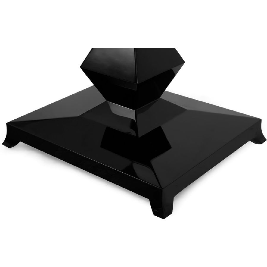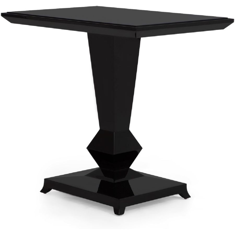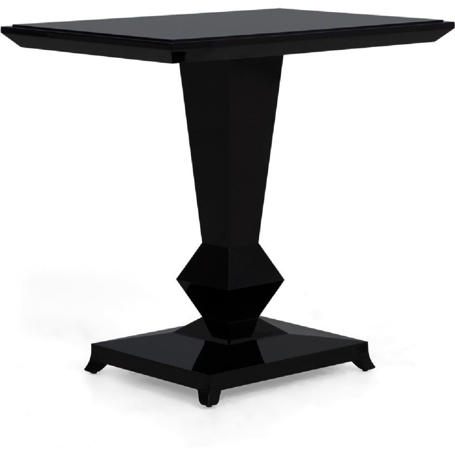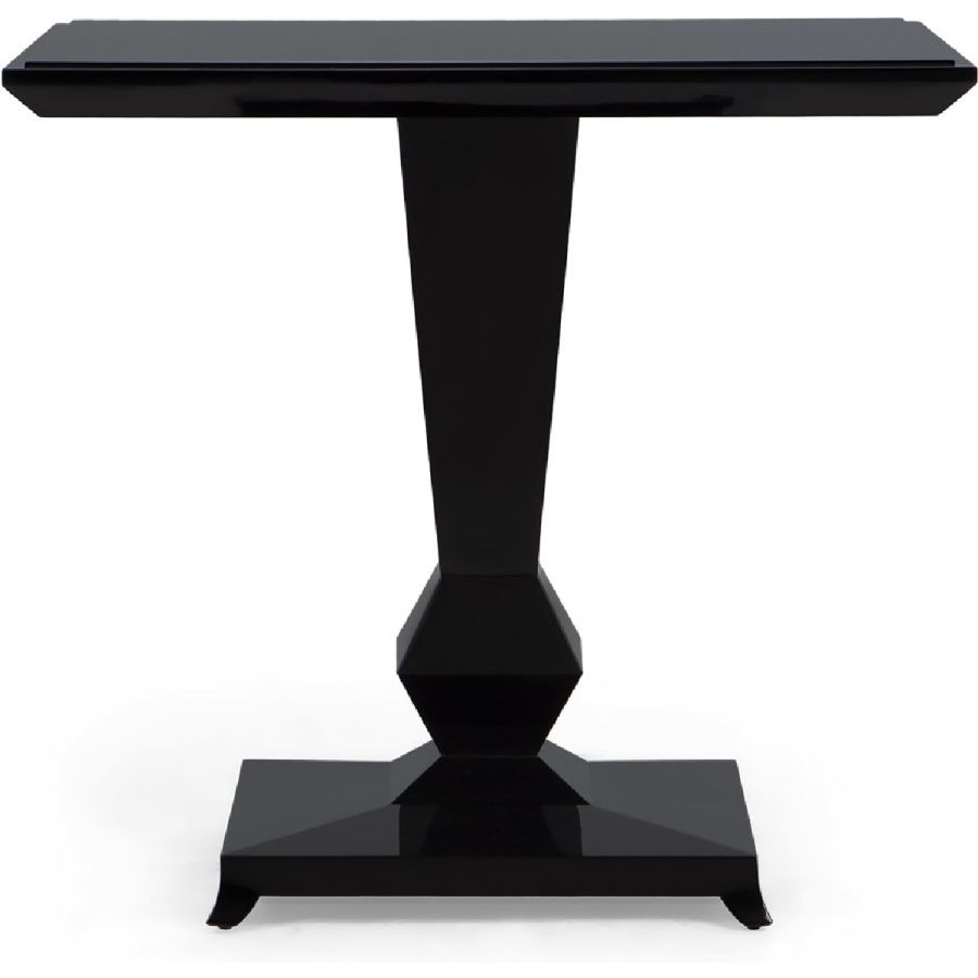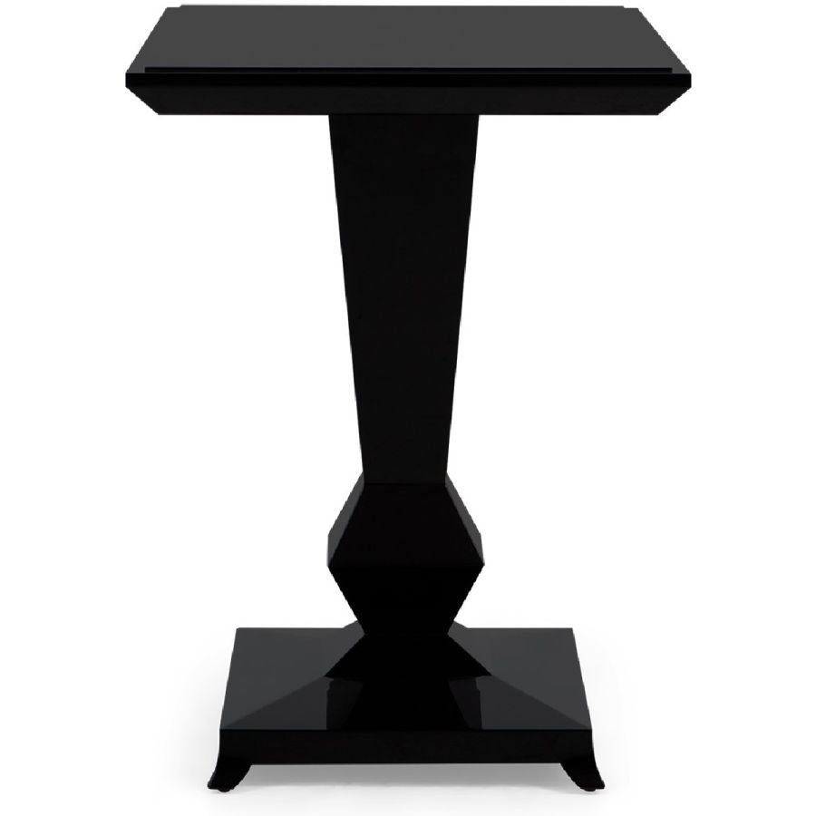 A sophisticated and impactful side table featuring a square stepped top and a single handcarved leg that tapers into an eight-sided diamond above the elegant base. The octagonal symbolism is redolent of the mirrors in Mademoiselle’s Rue Gambon apartment.