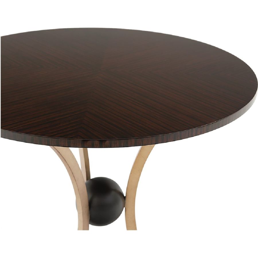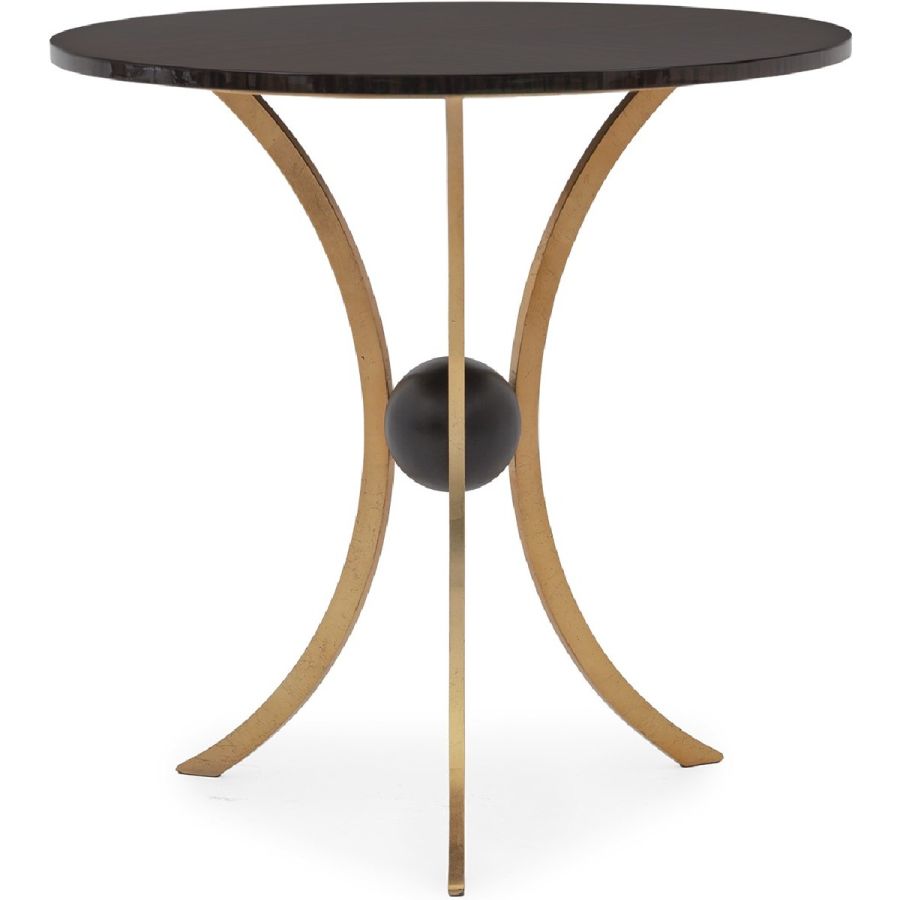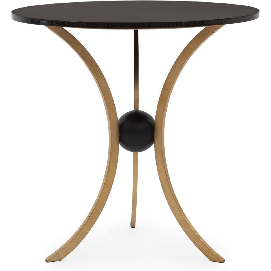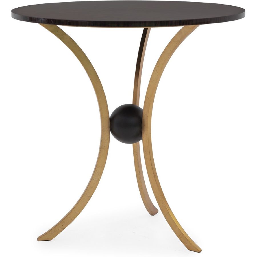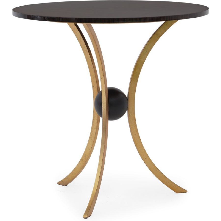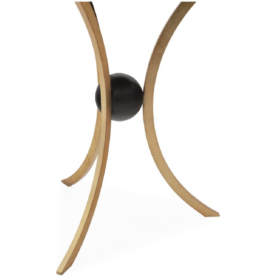 A side table featuring three symmetrically curved hand wrought legs that meet to cradle a single sphere, topped with a circular top. Understated styling imbued with elegance and grace, suitable for any classic or contemporary setting.