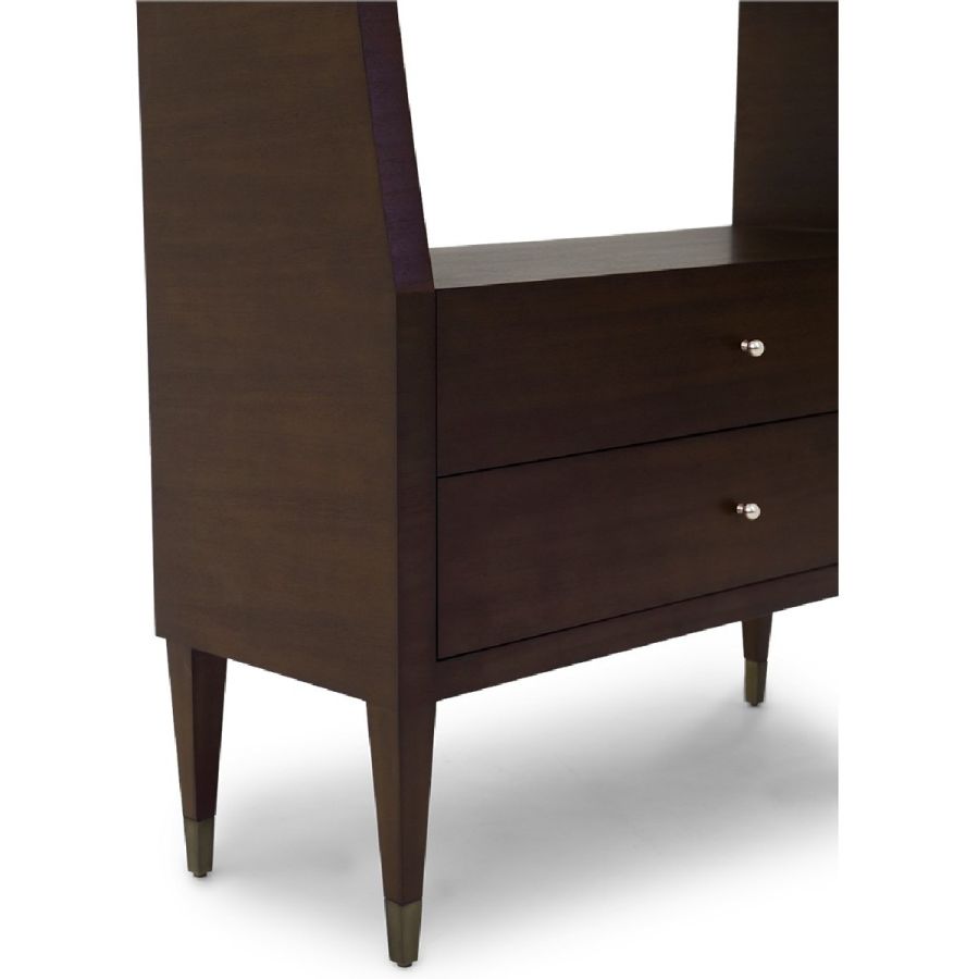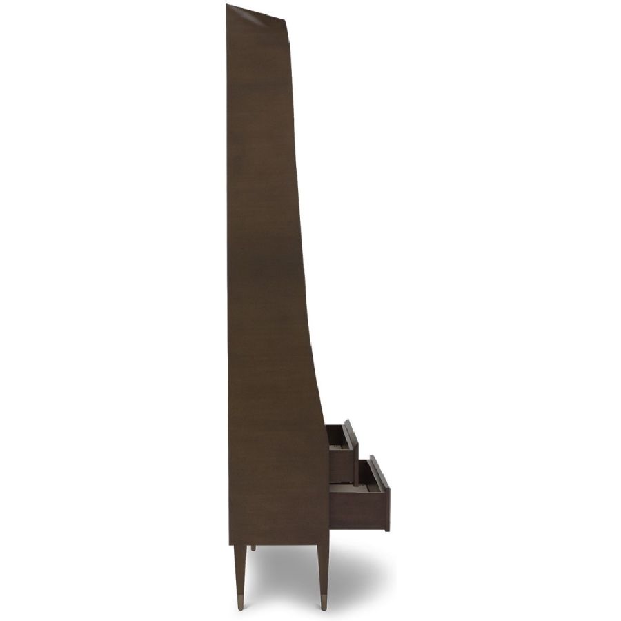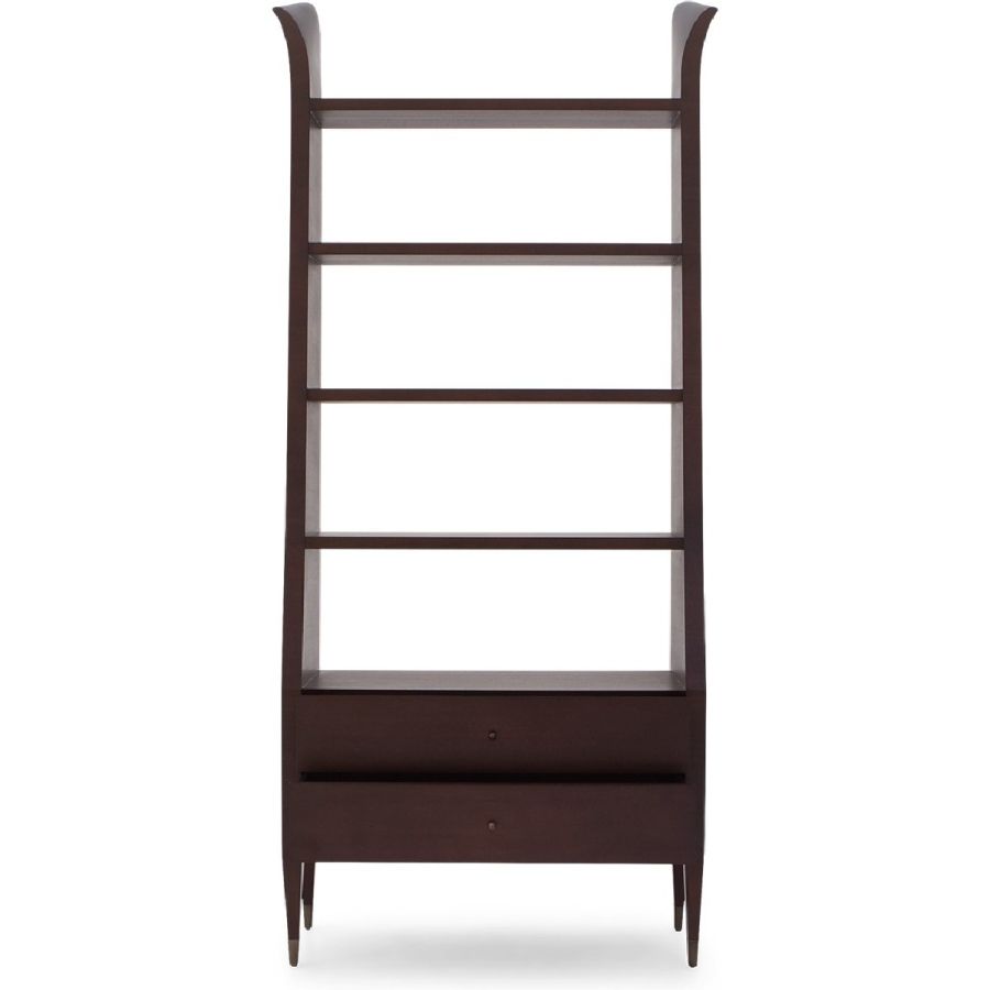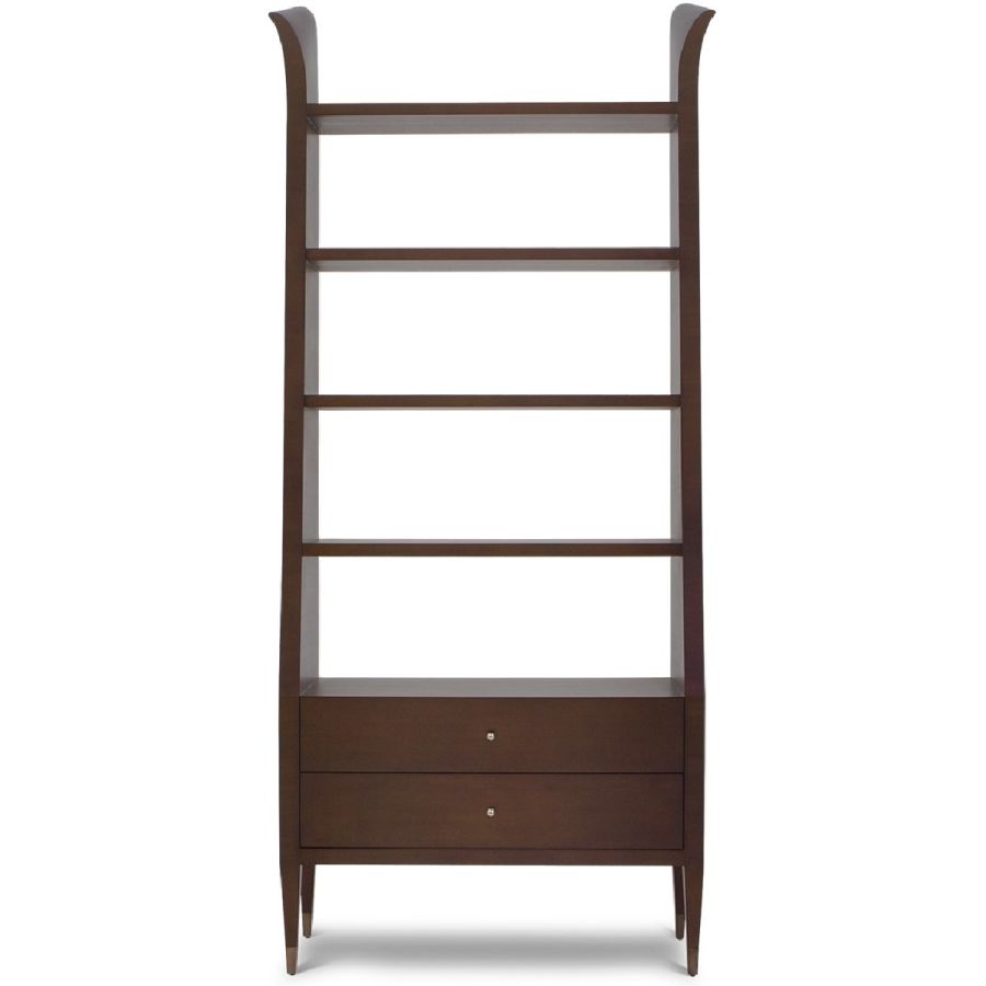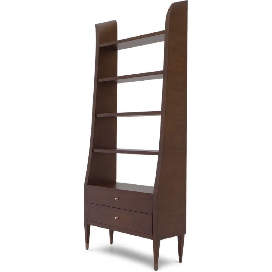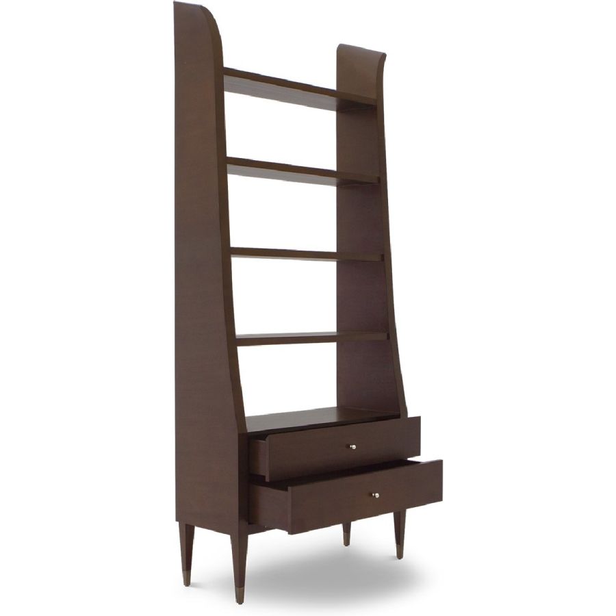 A superb tall and extra wide bookcase/display case with a slender outline, whose form raises into hand carved winglets. The case features five fixed shelves, two drawers and metal cap feet, providing the ultimate display elegance. Also available in alternative versions.