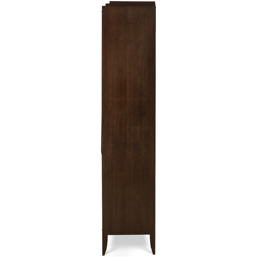 This sleek tall cabinet features three shelves and two drawers. The elongated carved drape handles, stepped top and metal finish tipped legs bring refined embellishment to a beautifully understated piece.
