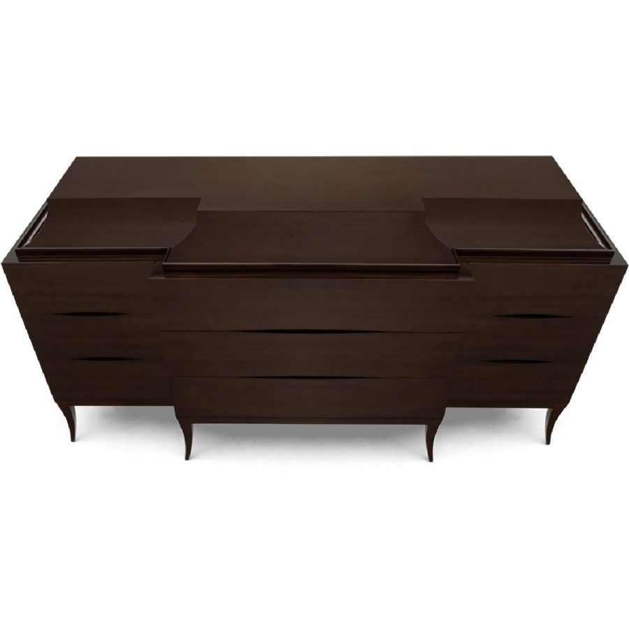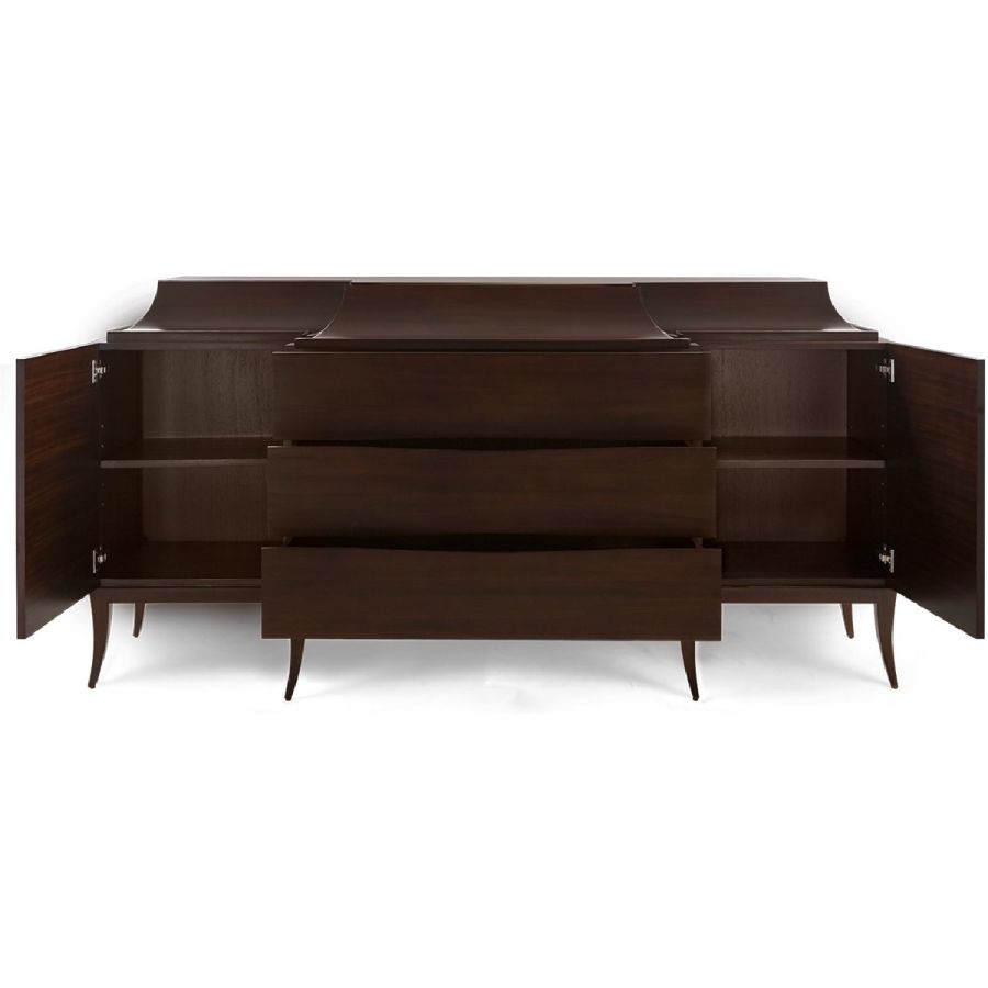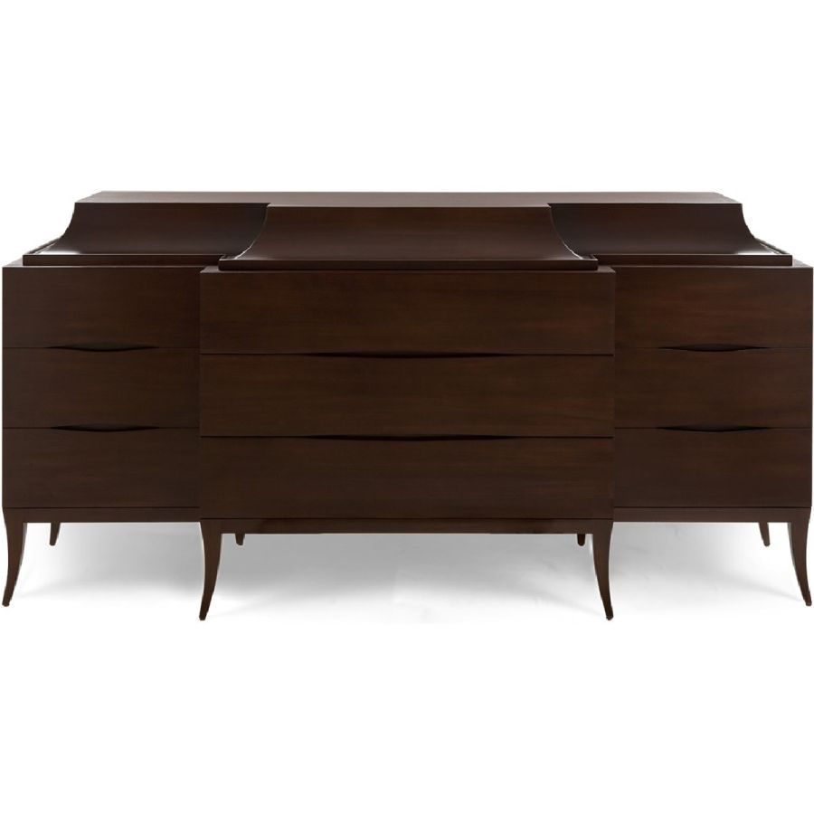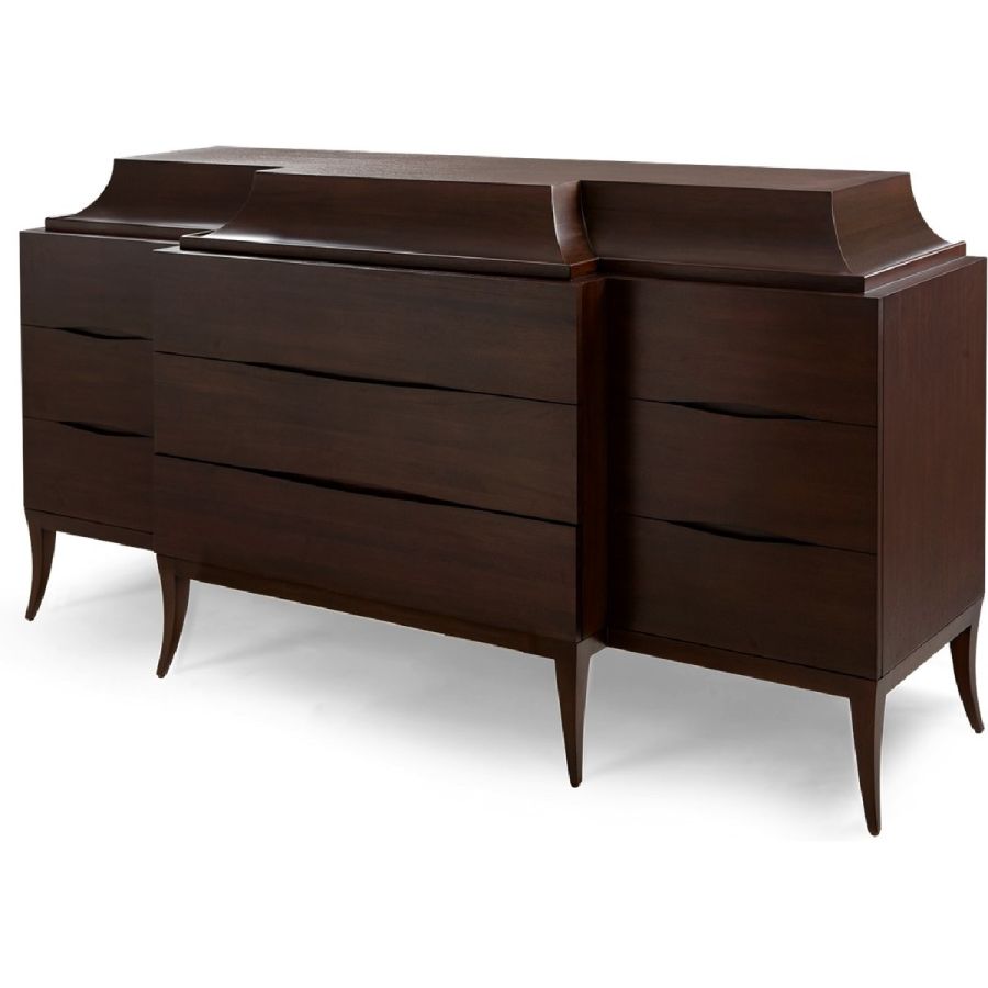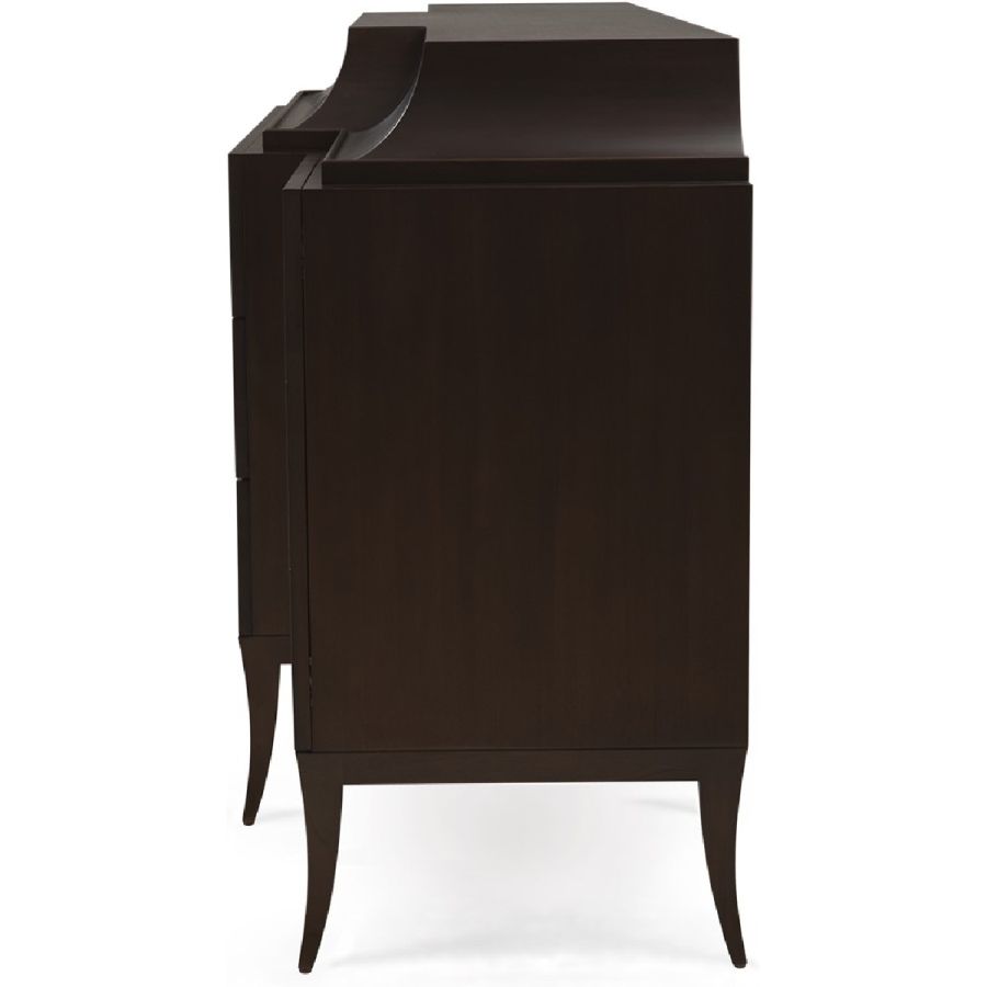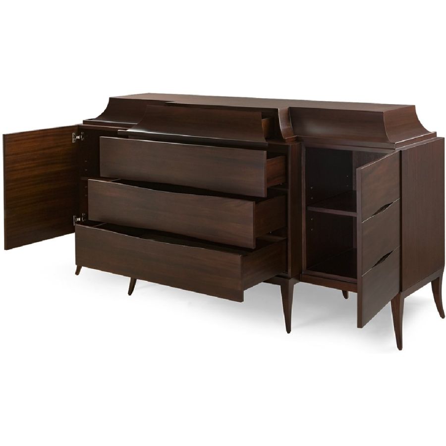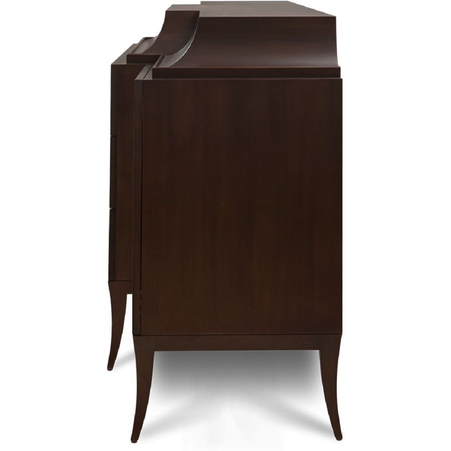 Handsomely hand carved from mahogany, this sleek cabinet is designed with two additional outer side doors with four-drawer chest, including one drawer concealed in the curved top section, also available in a single four-drawer chest version.