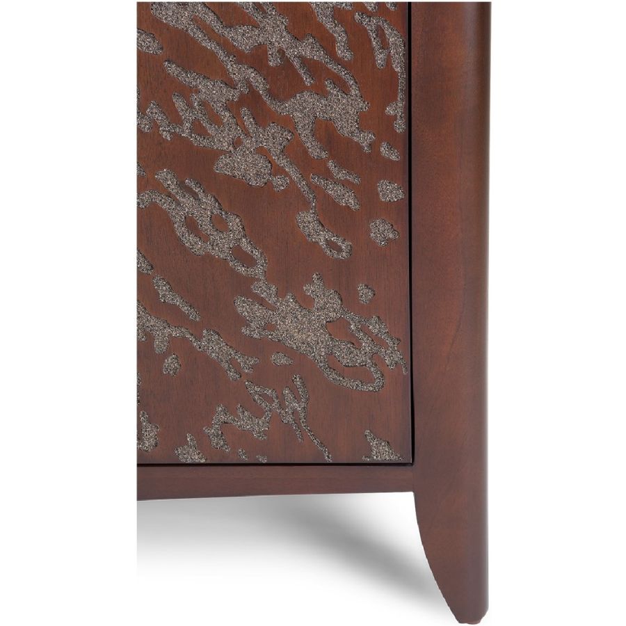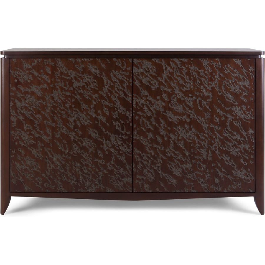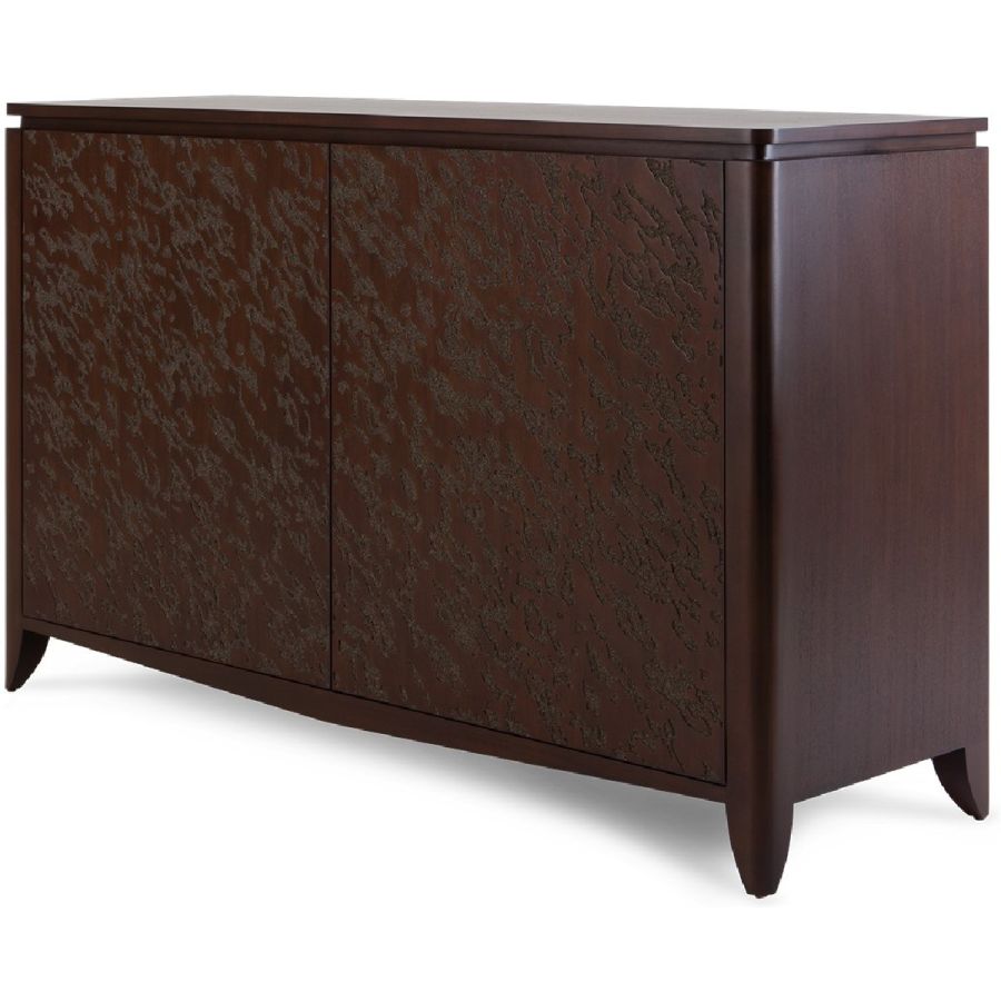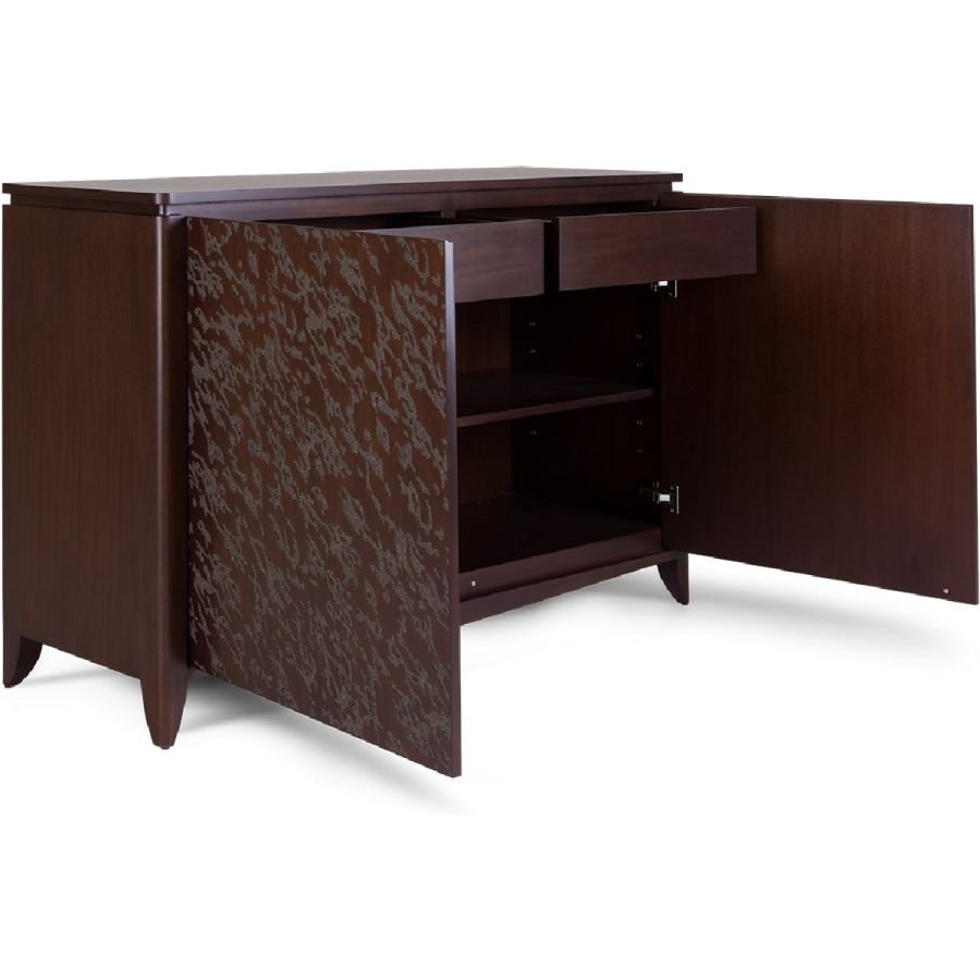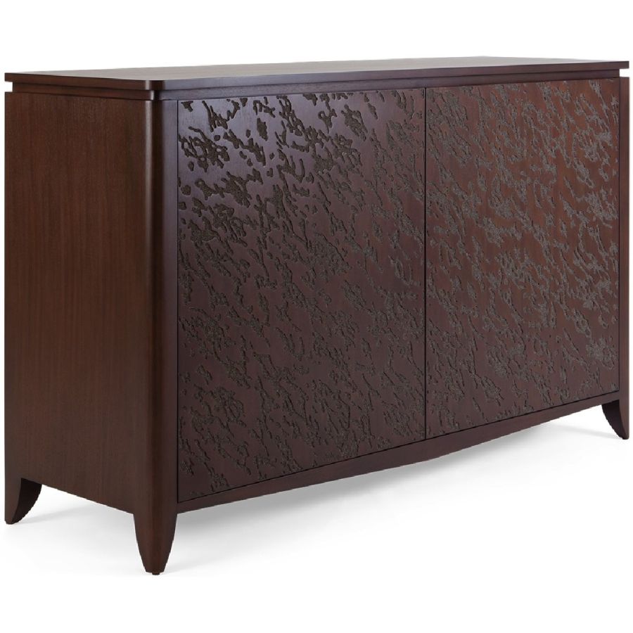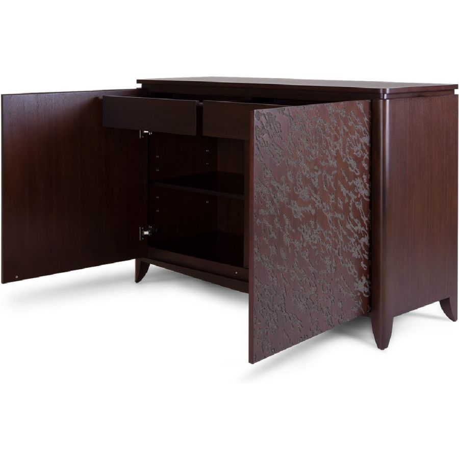 An absolutely spectacular cabinet with an abstract embossed pattern painstakingly hand carved into the 2 front-opening doors. Inside are 2 drawers and 4 adjustable shelves for the ultimate combination of beauty and practicality.