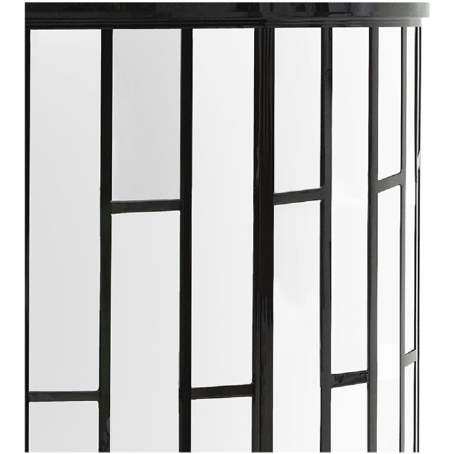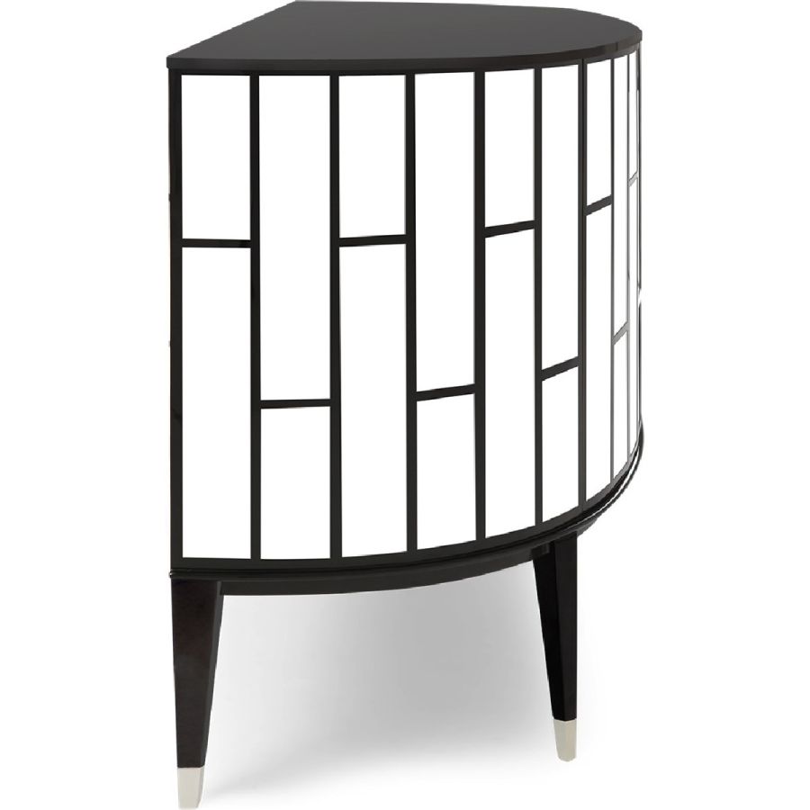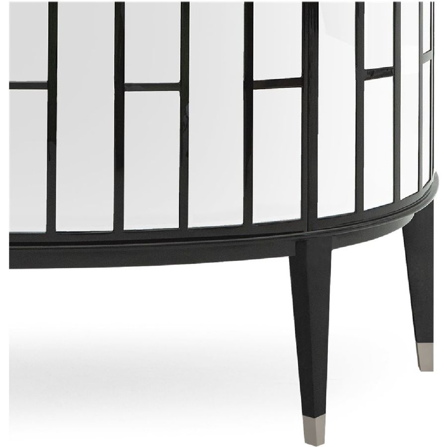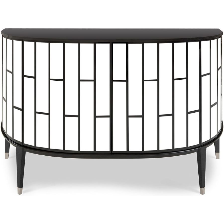 A beautiful mirrored two-door cabinet with metal finish tipped feet, reminiscent of a golden era.