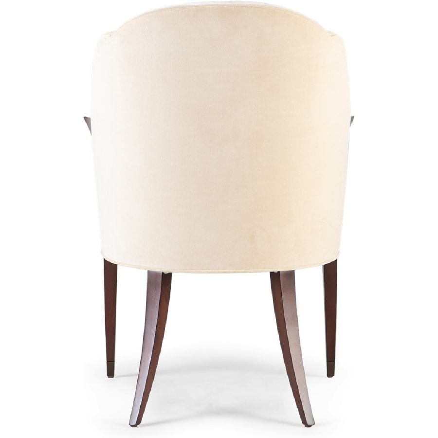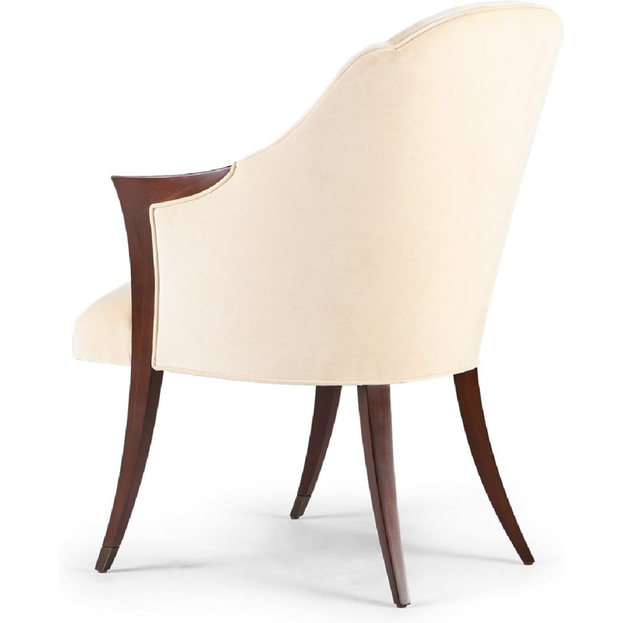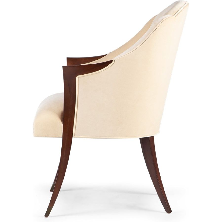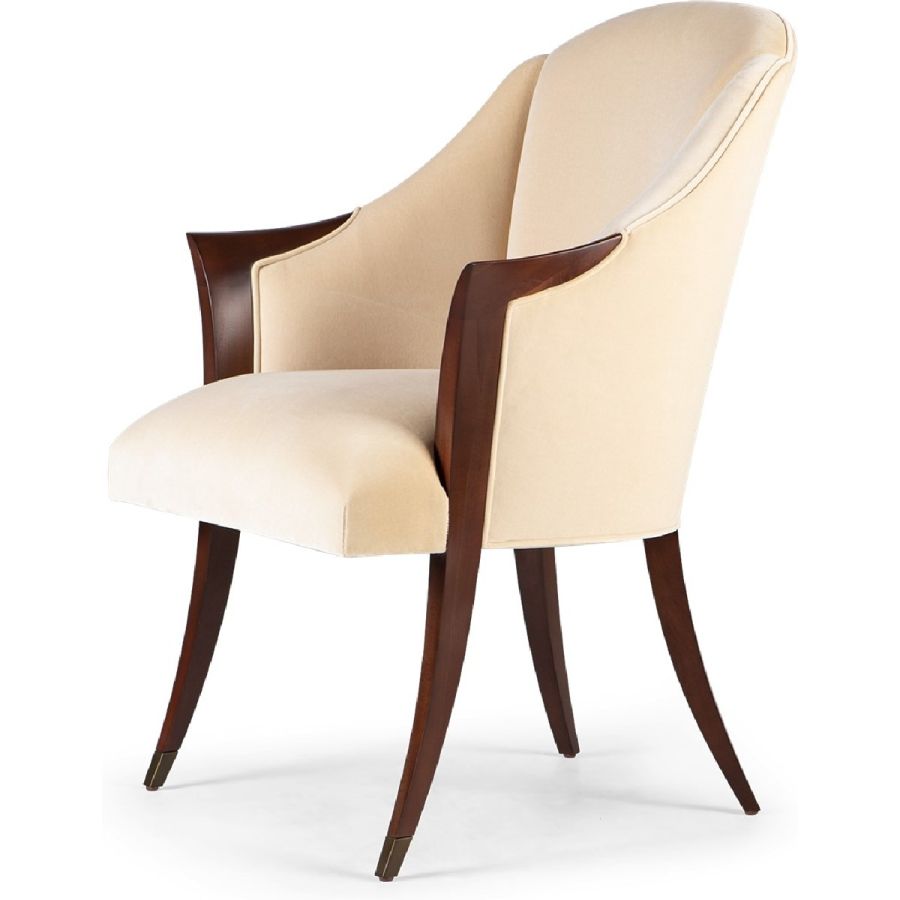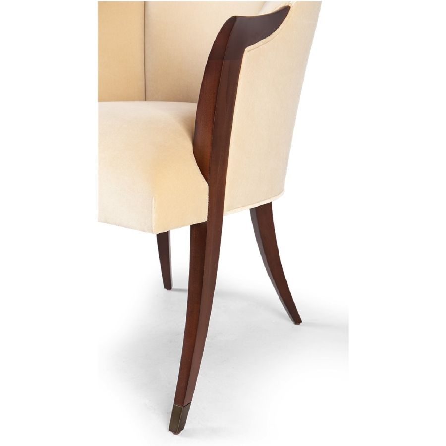 A delightful dining chair, inspired by the Deco furnishings of the 1940s. The lines of the seamed back extend the hand carved wooden sabre back legs, while the lines of the delicate arms extend to the straight front, metal finish tipped legs, to make a chair of ultimate harmony and grace.