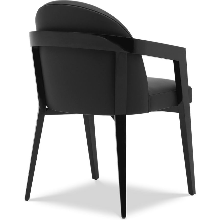 A truly delightful carved dining chair that seamlessly combines curves and geometric lines in perfect harmony. Featuring a gently elliptical half-moon back and a hand-carved wood frame with angular legs and armrests, this versatile piece is suited to any dining setting. Also available without armrests (30-0195).