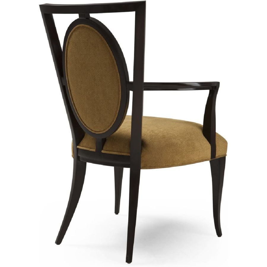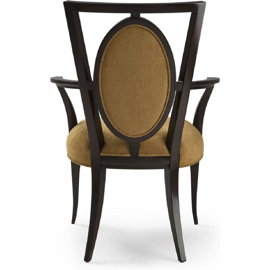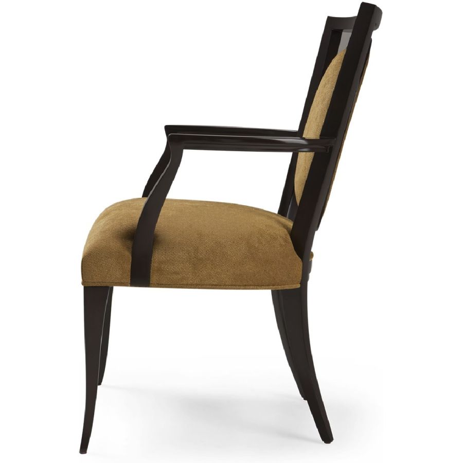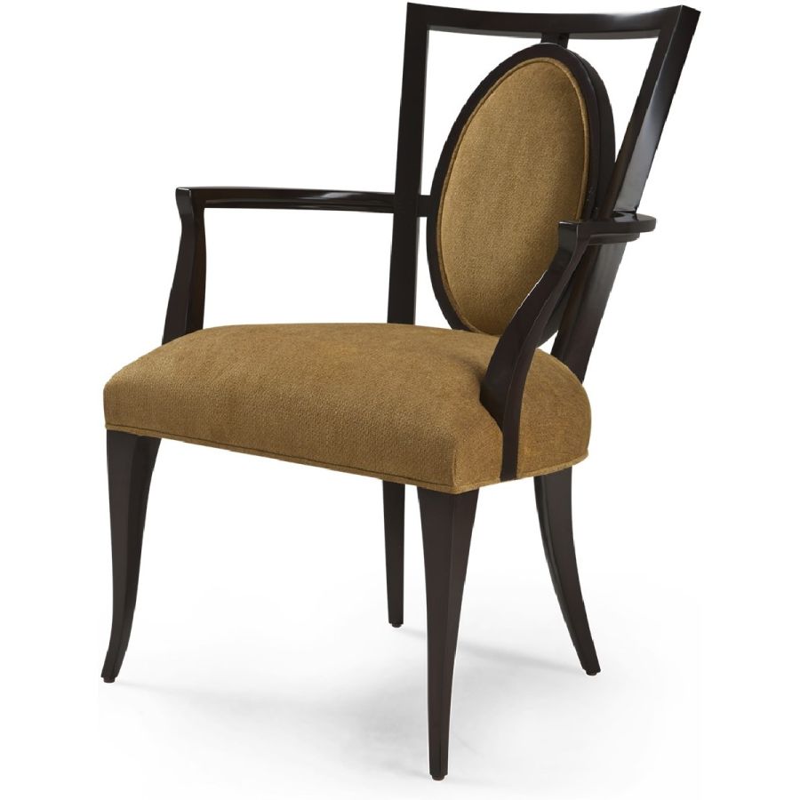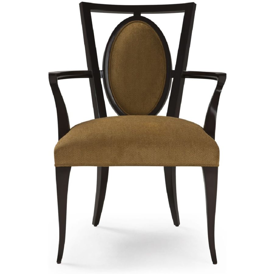 A sumptuously upholstered dining chair with bowed arms designed for maximum comfort and style. The arched upholstered oval backrest softens the geometric lines, as does an alternative model, whose backrest is woven in rattan (30-0102). Also available without arms ( 30-0115).