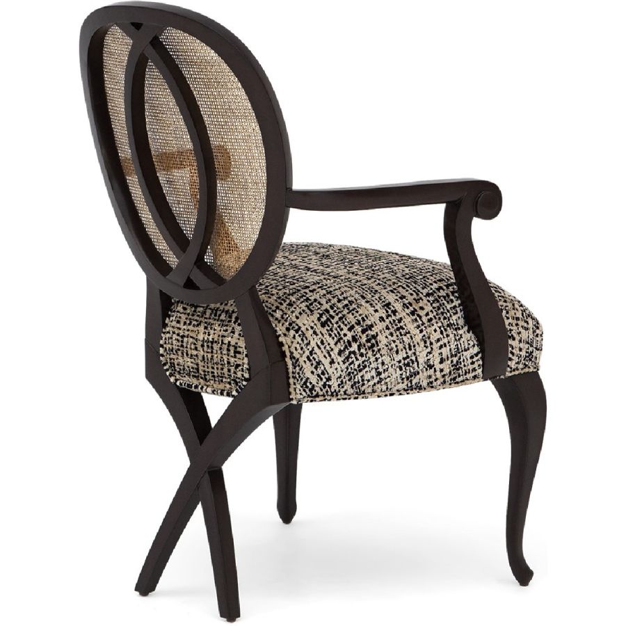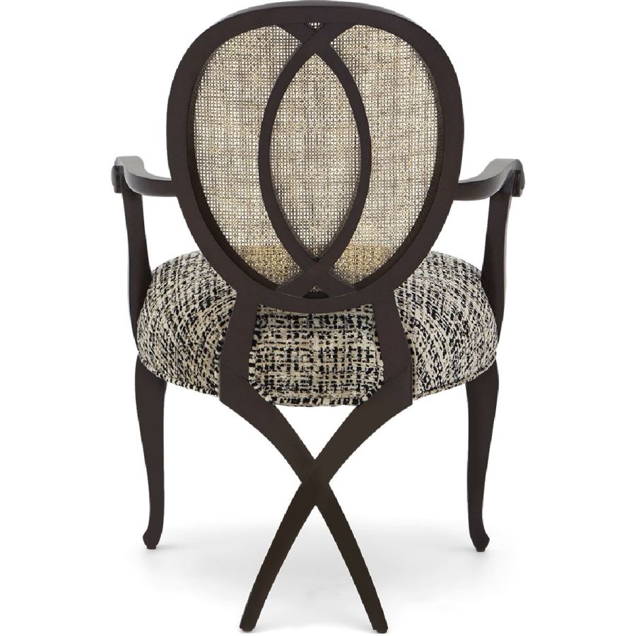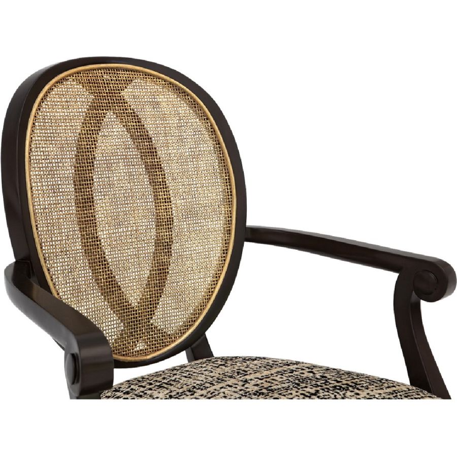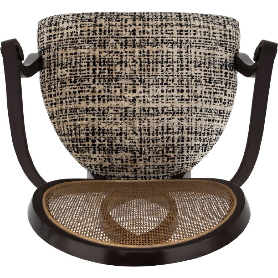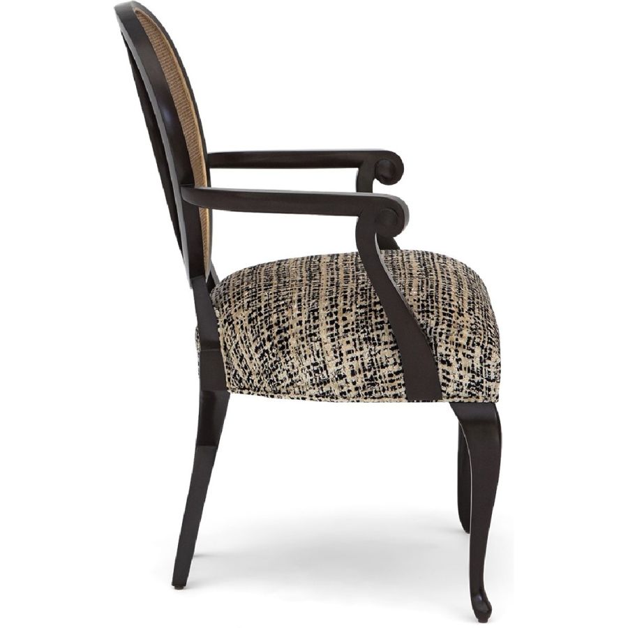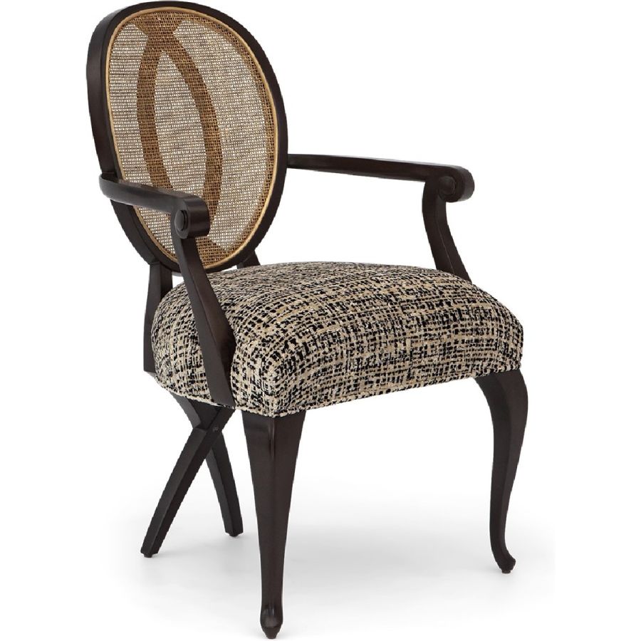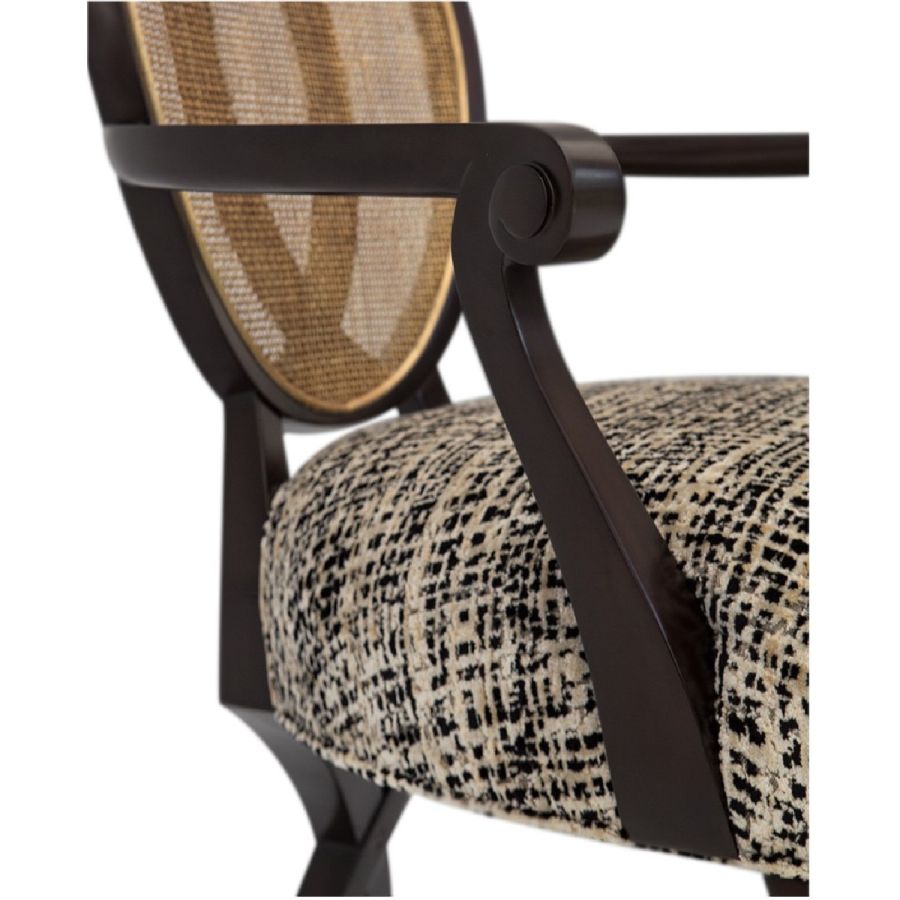 This captivating armchair features a rattan back applied over a mahogany frame. Its distinct and sumptuous upholstered silhouette is the ultimate in visual comfort. Also available without arms (30-0111).