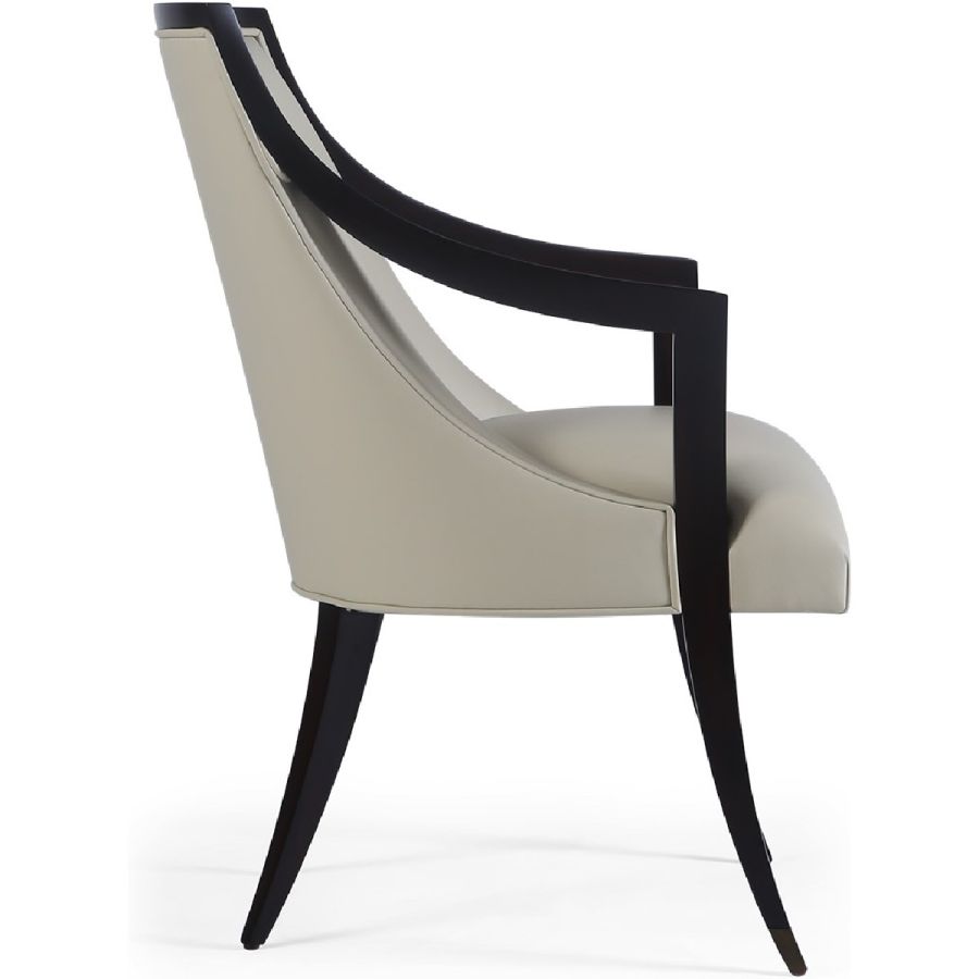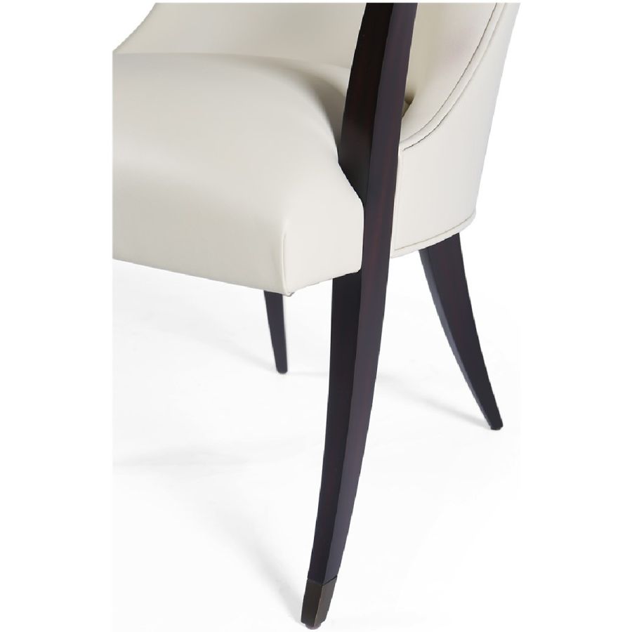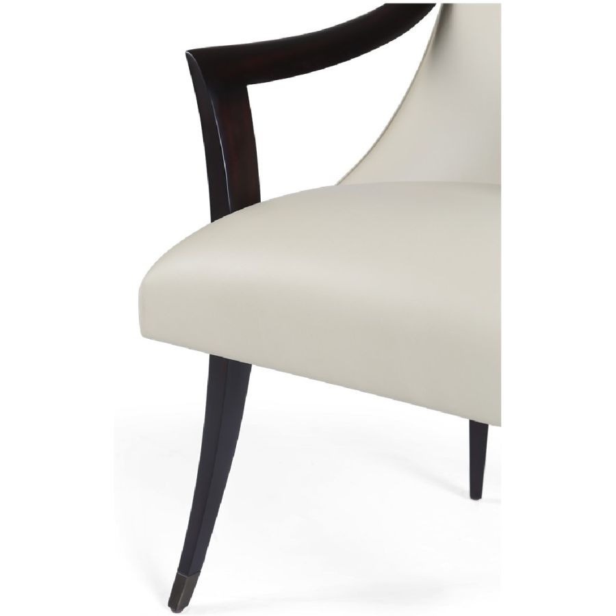 This supremely elegant dining chair features a squared back, sweeping cantilevered arms and metal finish tipped legs. A harmonious marriage of Art Deco styling and total comfort.
