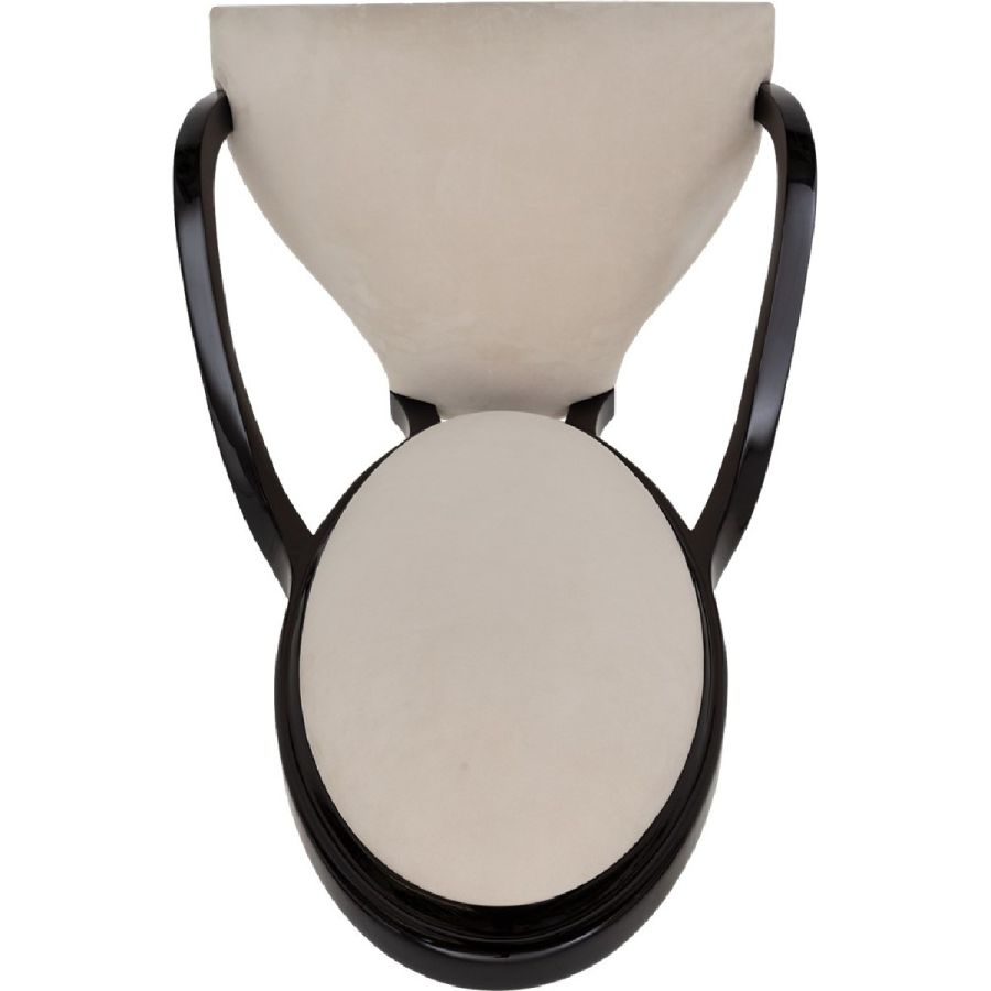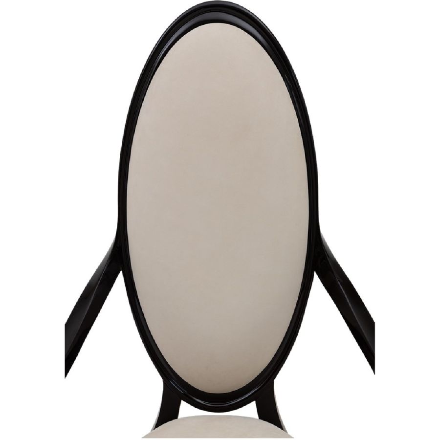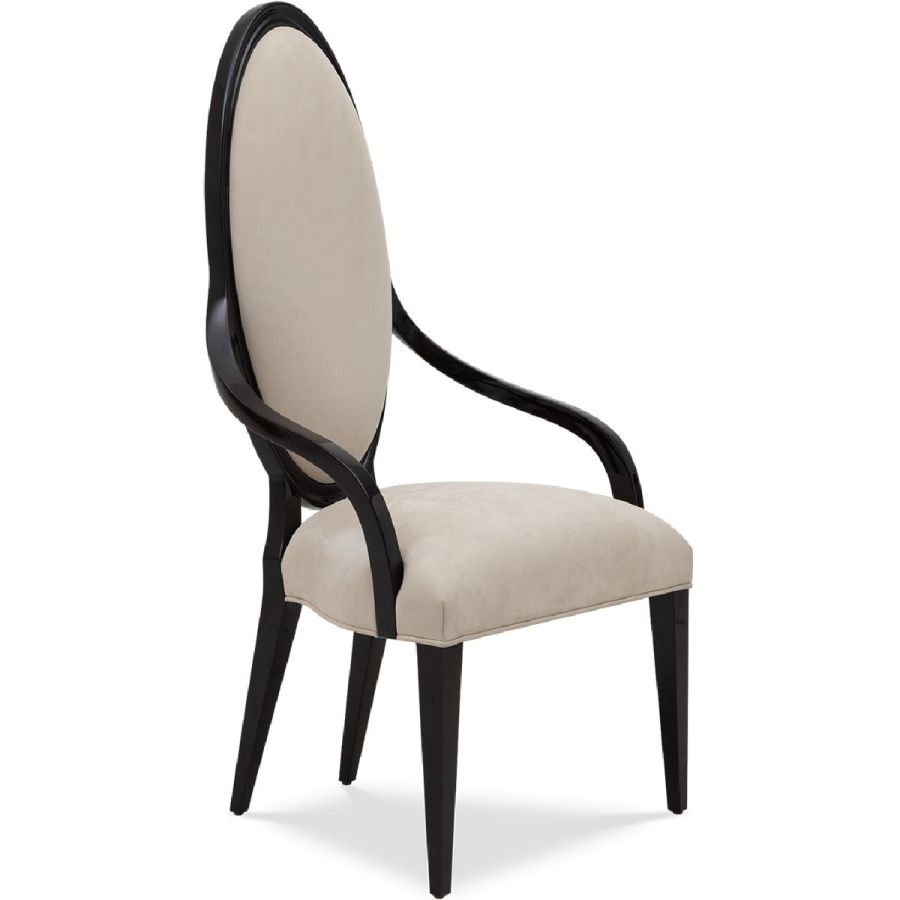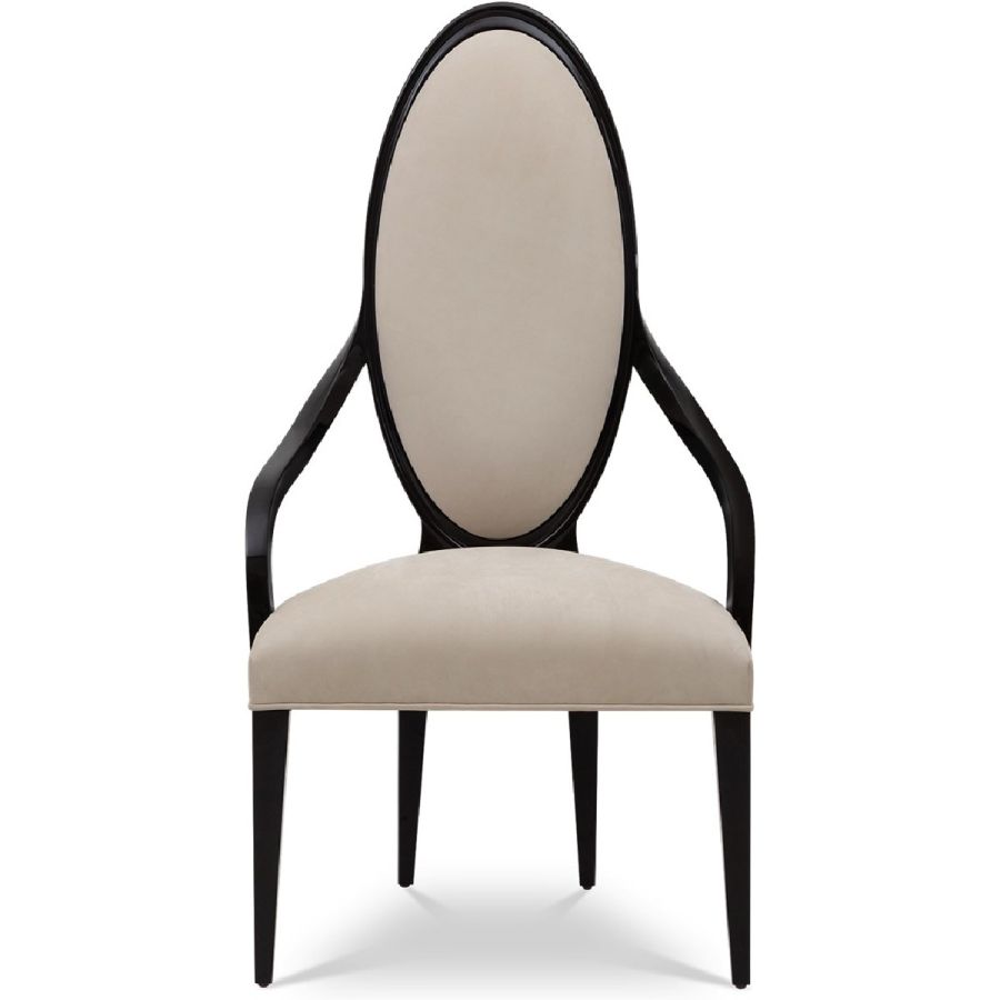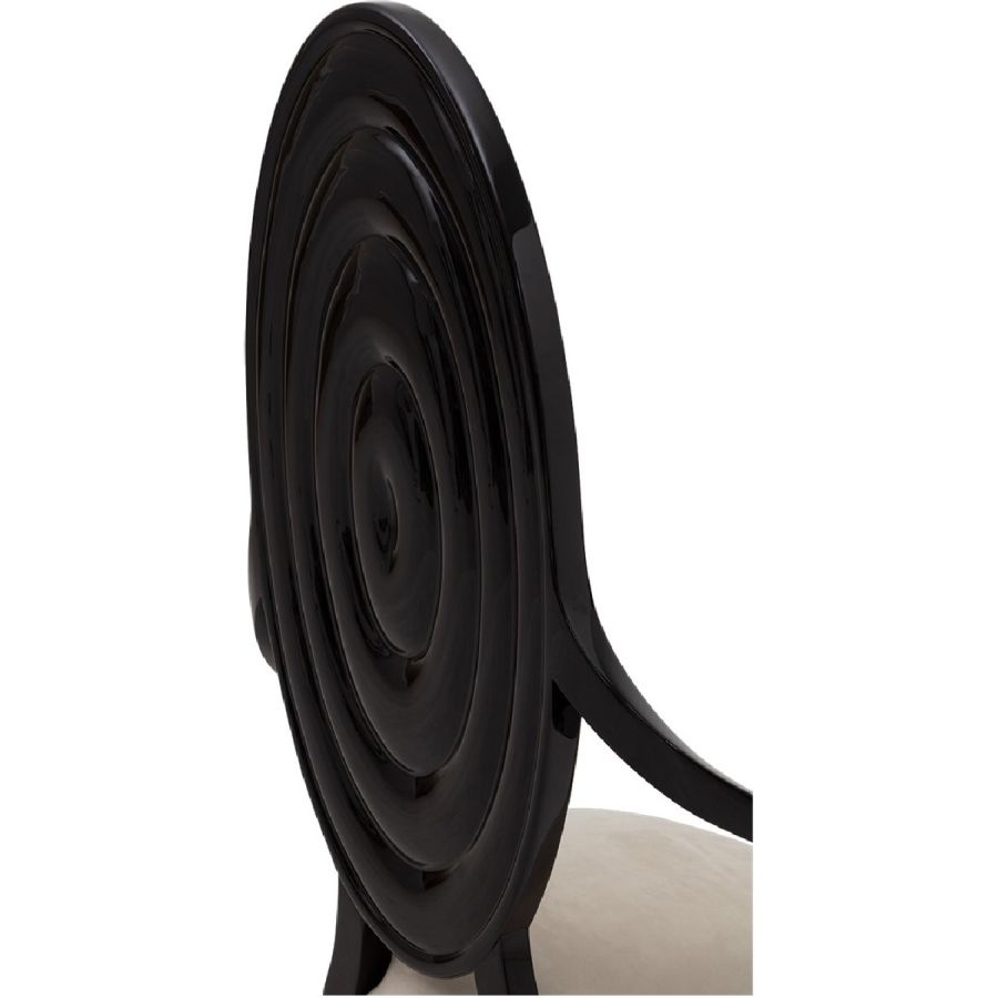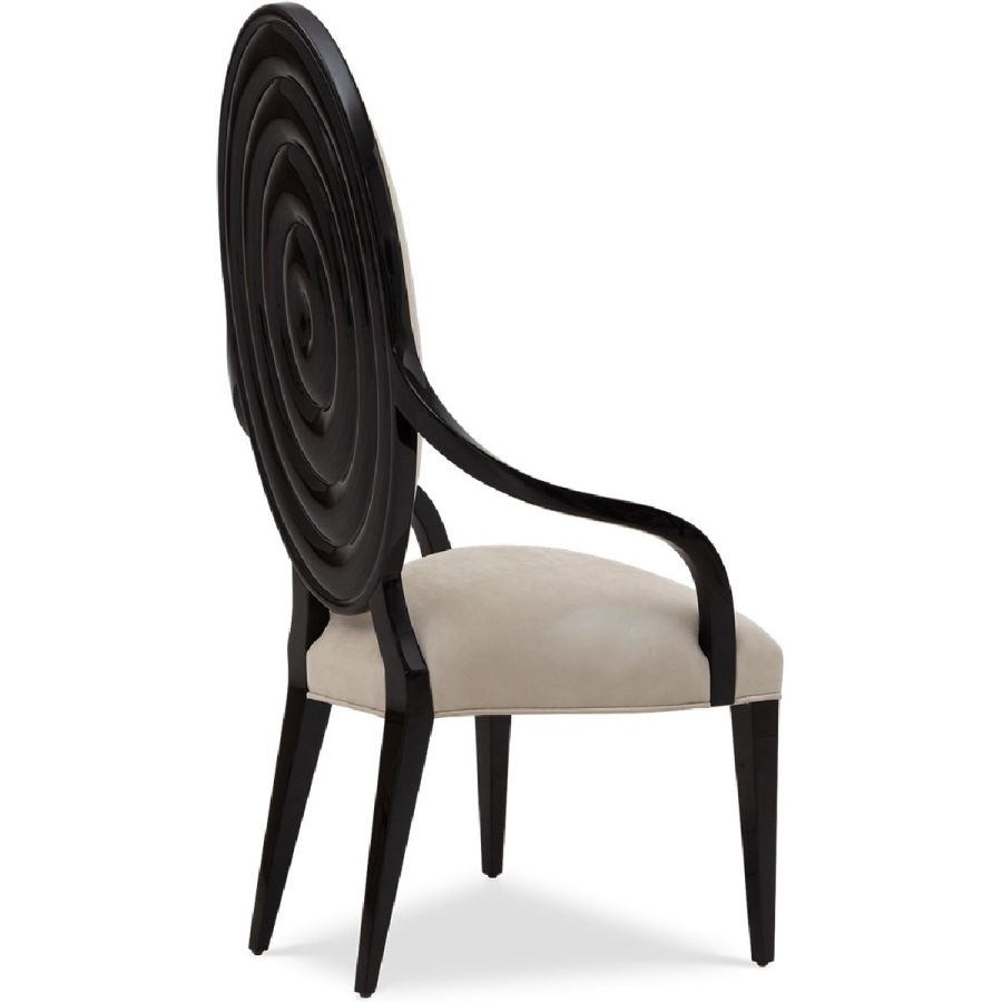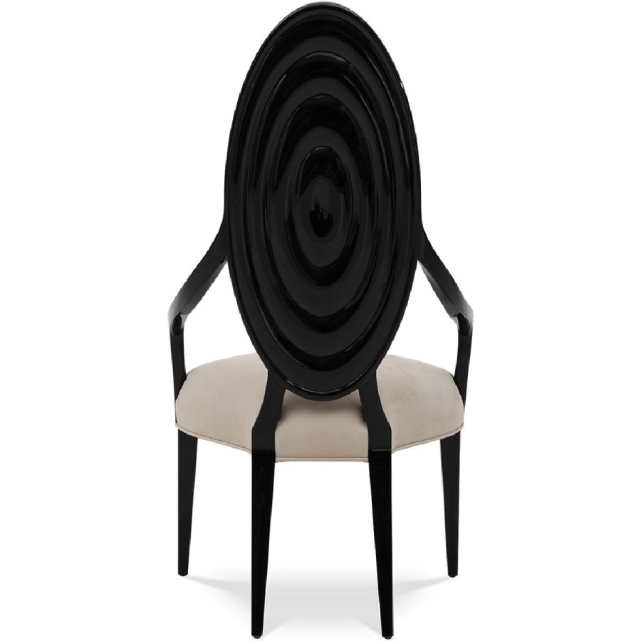 A striking dining chair featuring a tall oval upholstered backrest with the rear exquisitely hand carved into concentric circles. The back is supported on pivoted, slanting straight legs, and the arms descend in a curve for an elegant profile.