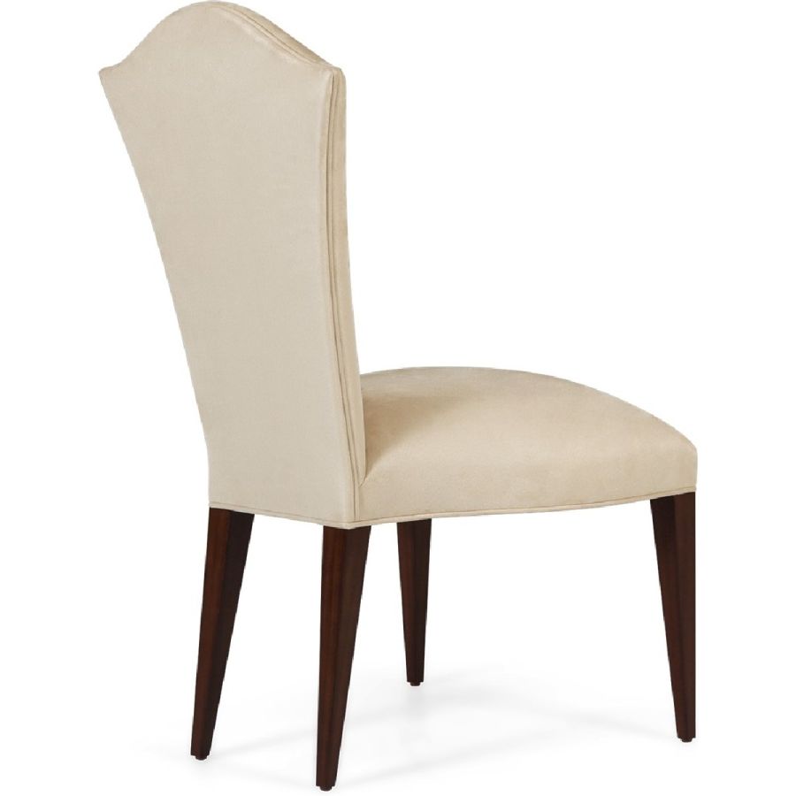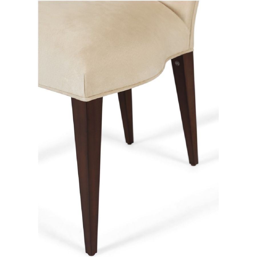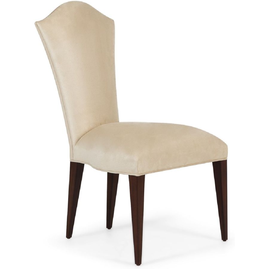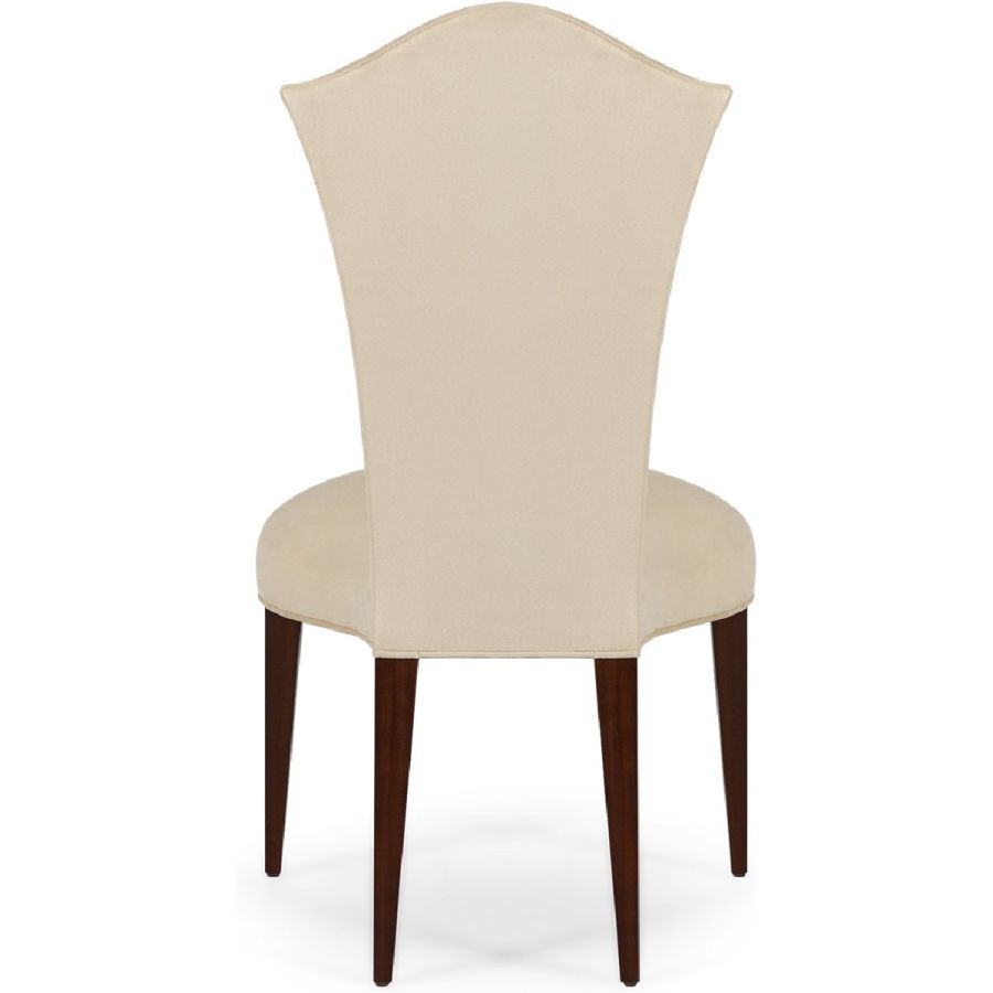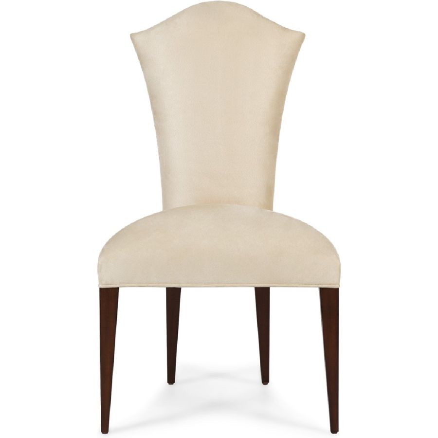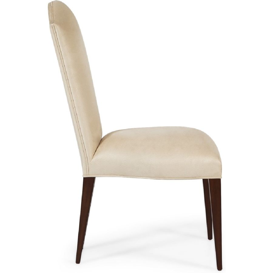 Simplicity and elegance characterize this beautiful upholstered dining chair, with straight hand carved legs, and a gently tapered back with curved top. The perfect piece to complement any dining table and setting. A new classic!
