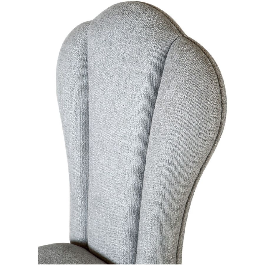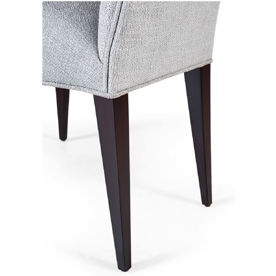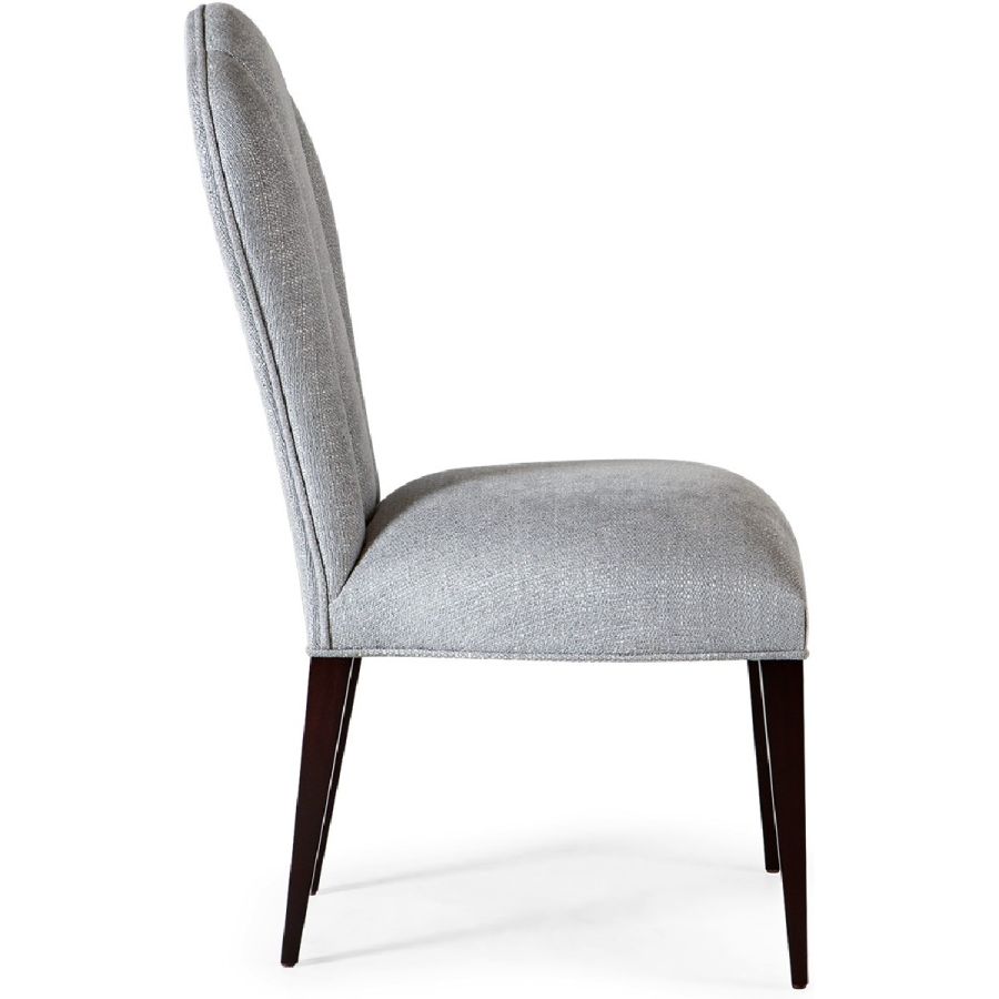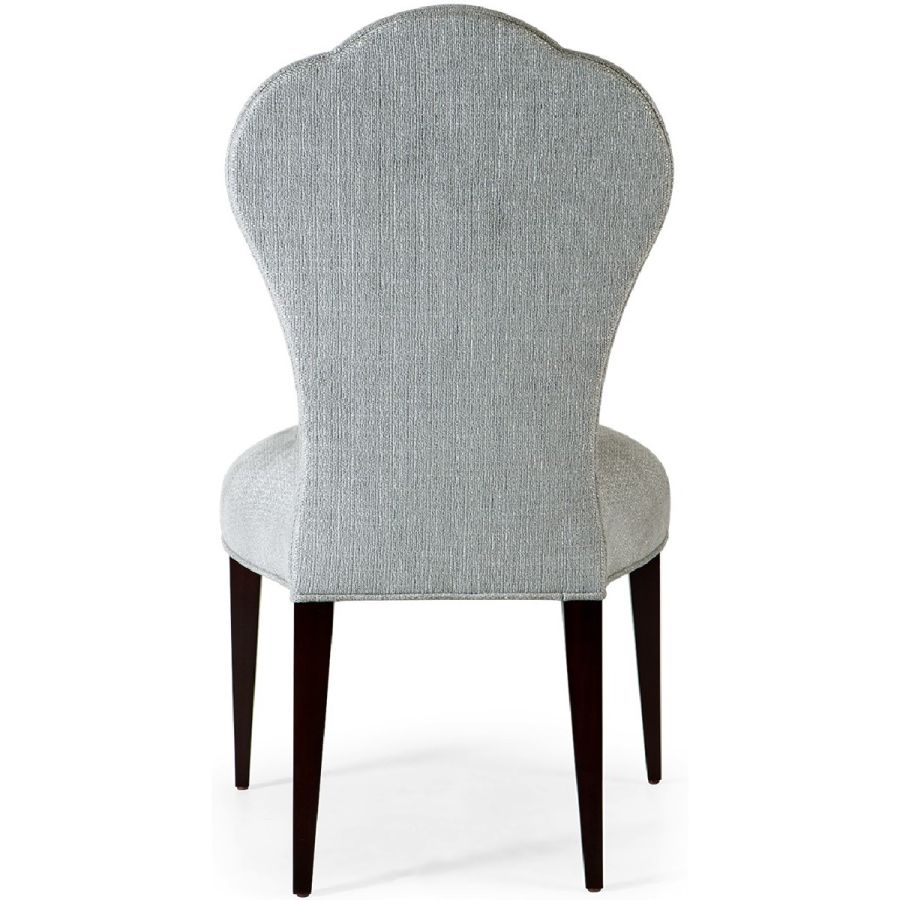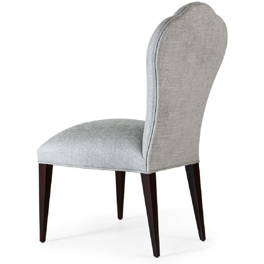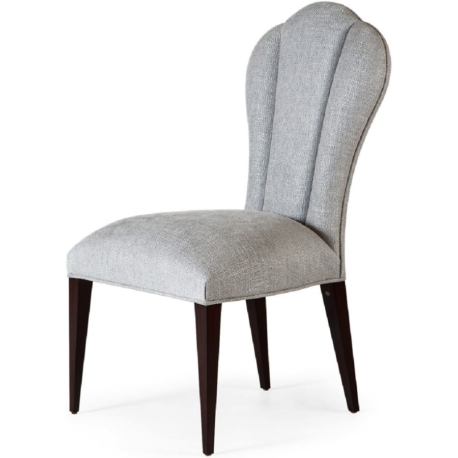 A charming dining chair in a boudoir chair style. The gently tapered upholstered back is divided into three sections by deep vertical seams, mirrored in the curved legs.