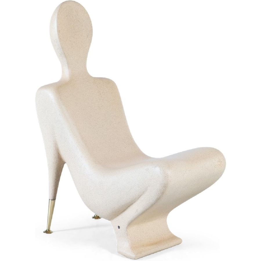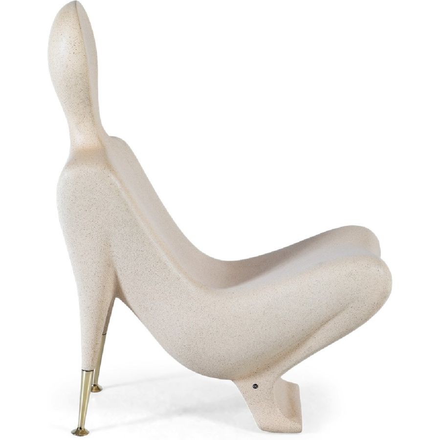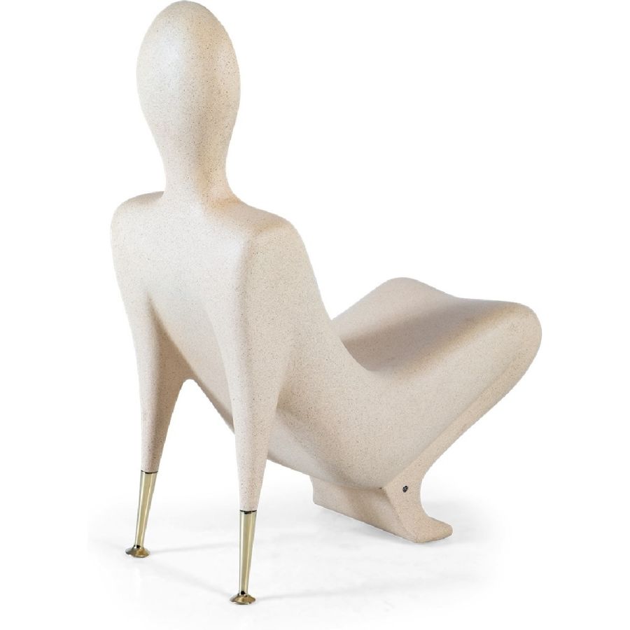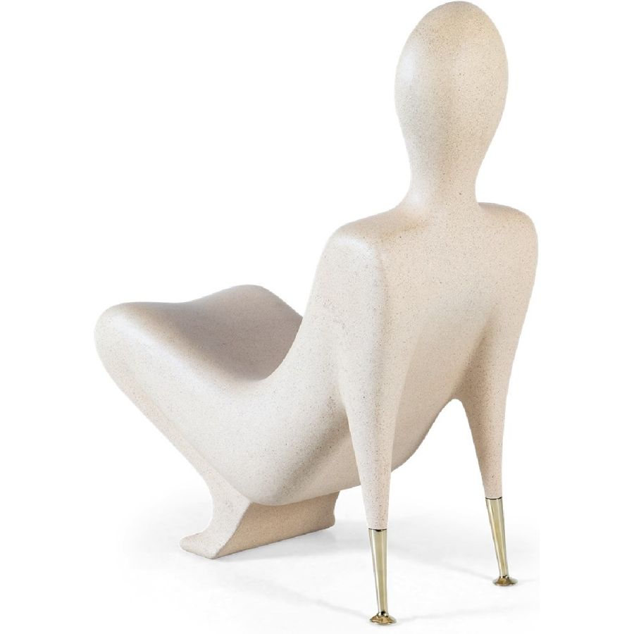A synthesized limestone figure transformed into a surprisingly comfortable Modernist style accent chair, beautifully hand cast and with subtle brass arm supports. Art has never been this practical.