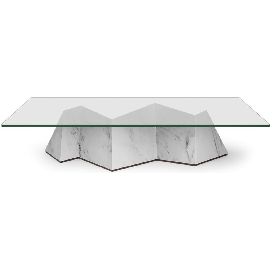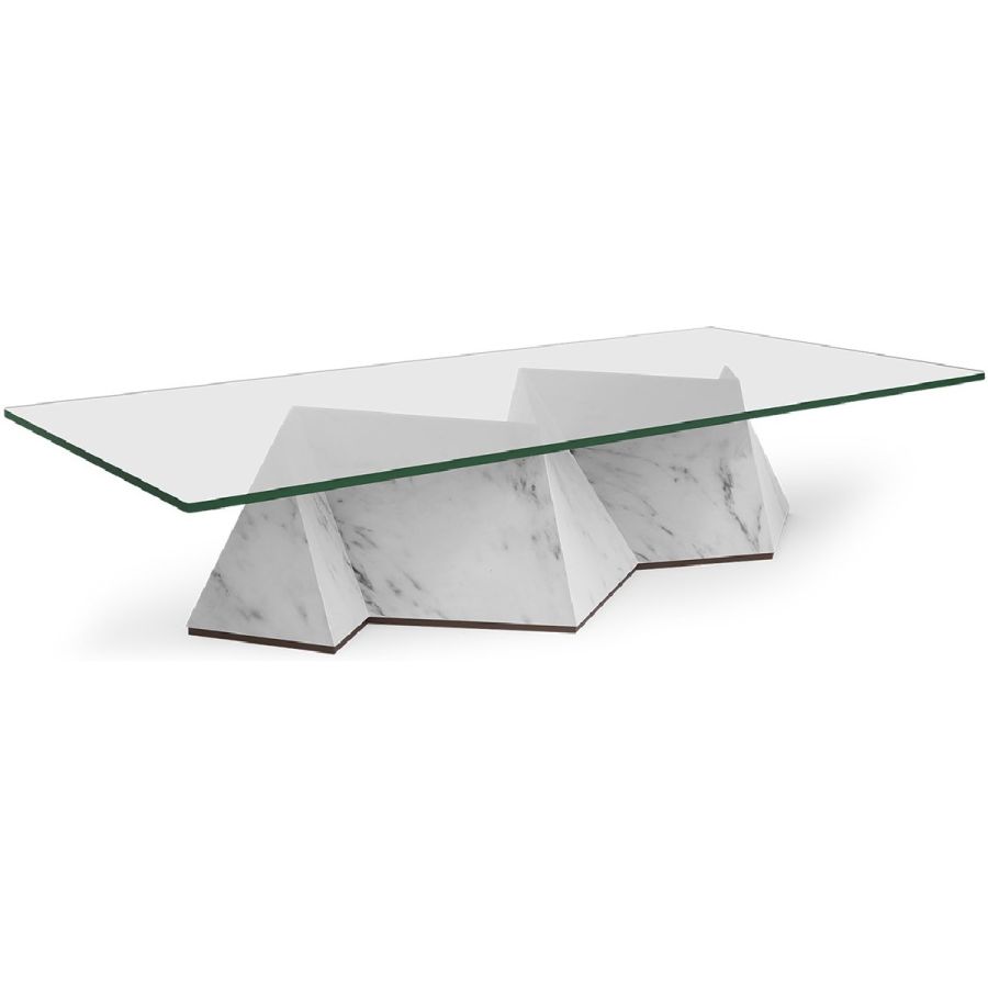 A monumental zigzagging block of wood with white Carrara marble facades forms the base of this striking contemporary coffee table. The prisms of the base are topped with clear glass to bring lightness to this stunning piece.