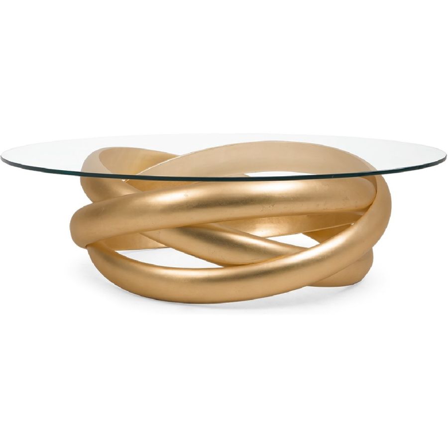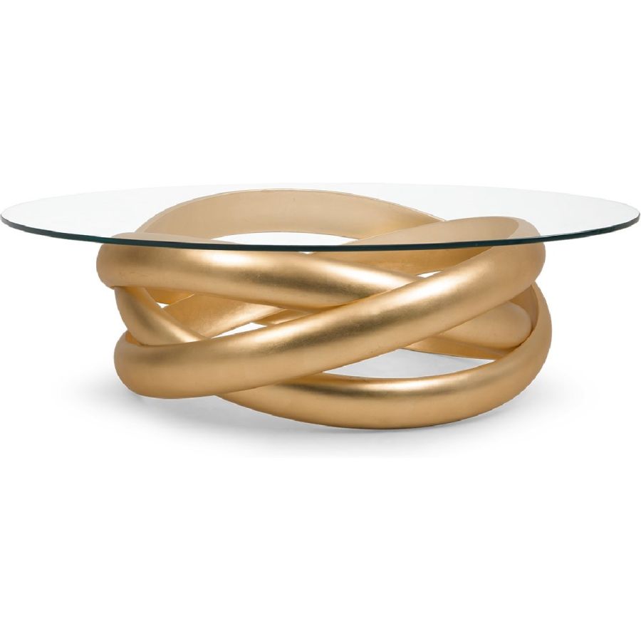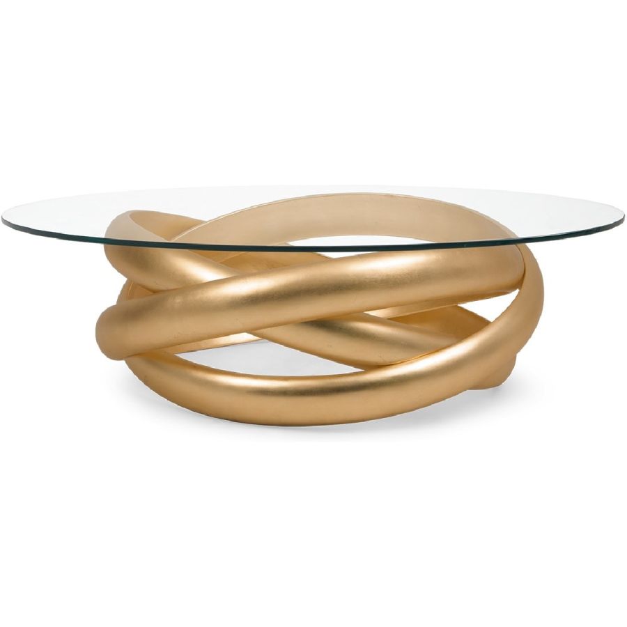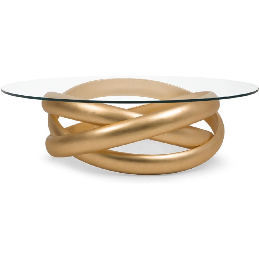 Three intertwining hand carved wooden rings form the base of this stunning coffee table, with a clear tempered glass tabletop to allow the beauty of the base to show through. A statement piece to bring a touch of timeless glamour to any living room setting.