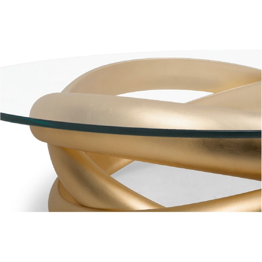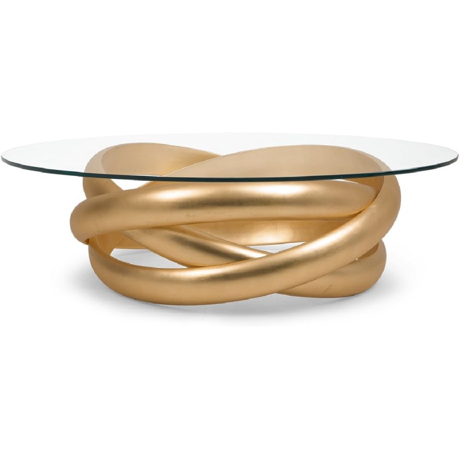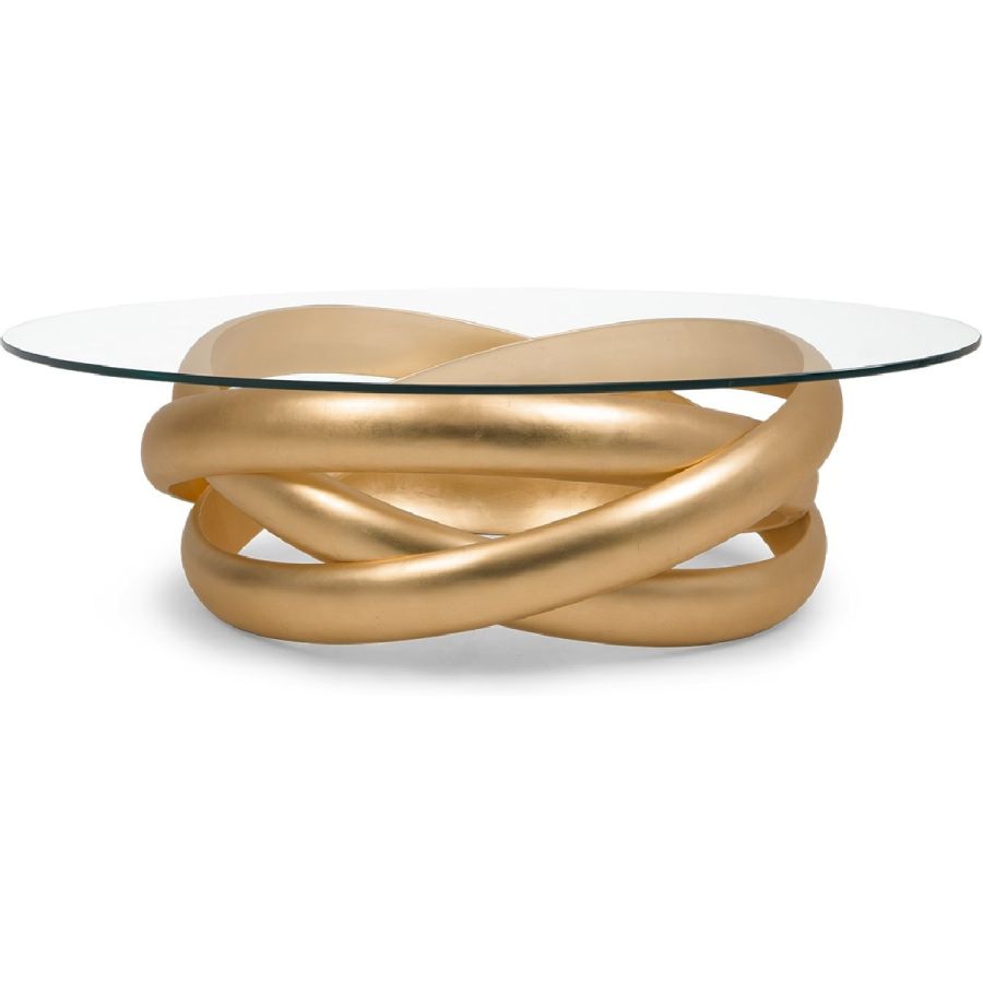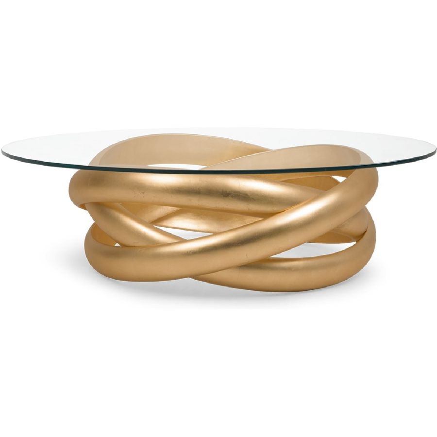 Three intertwining hand carved wooden rings form the base of this stunning coffee table, with a clear tempered glass tabletop to allow the beauty of the base to show through. A statement piece to bring a touch of timeless glamour to any living room setting.