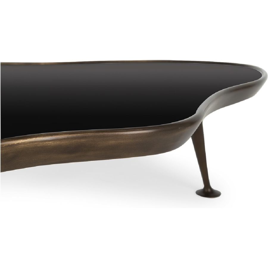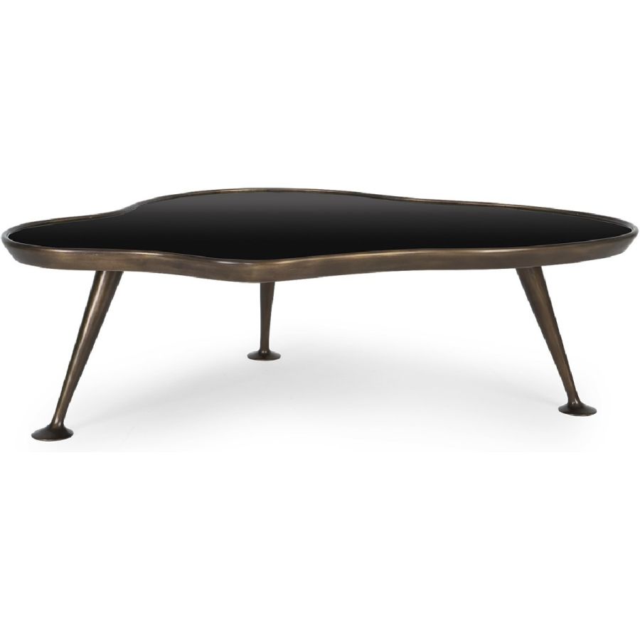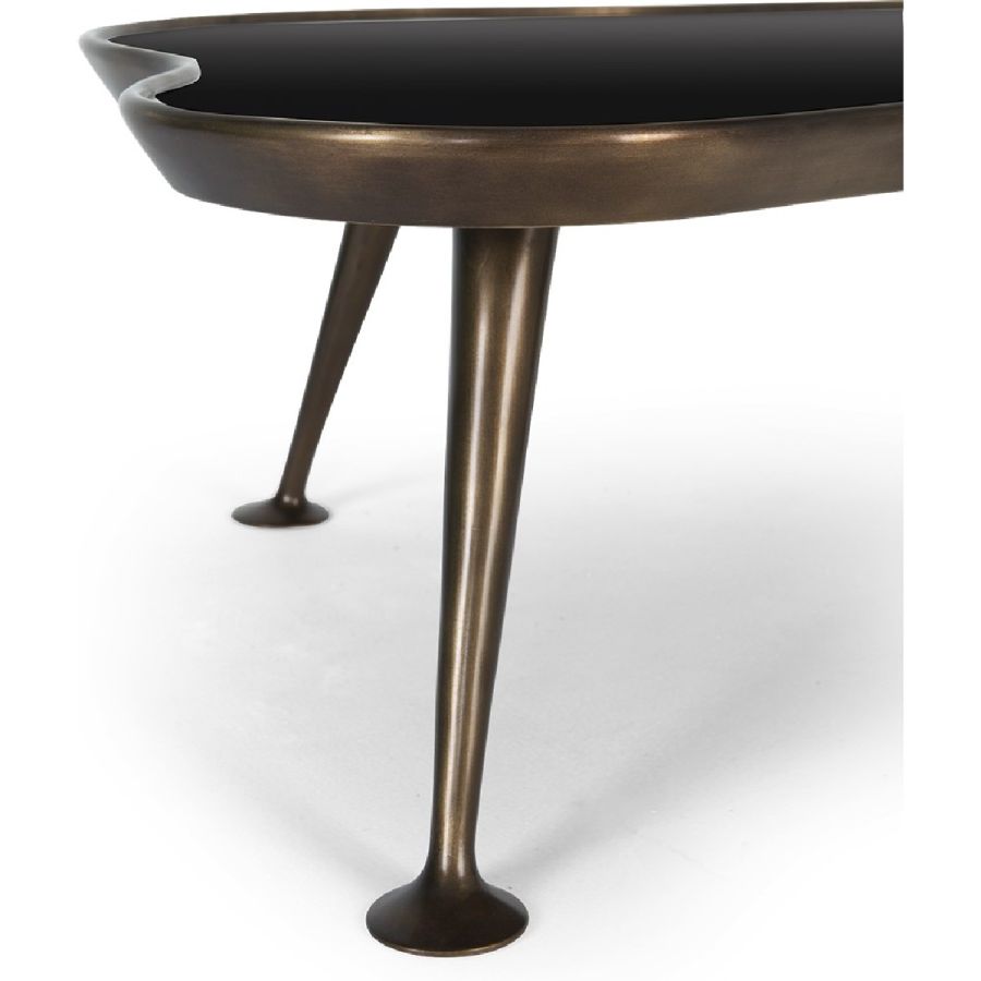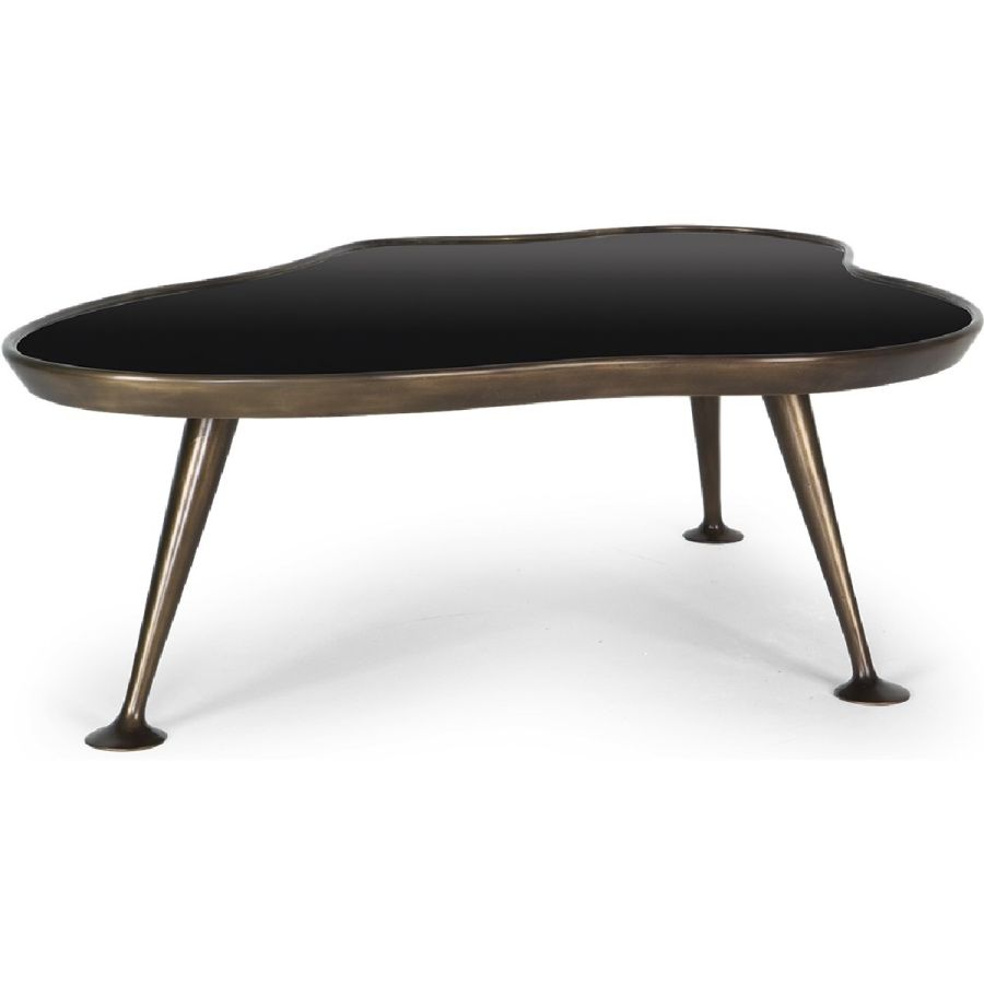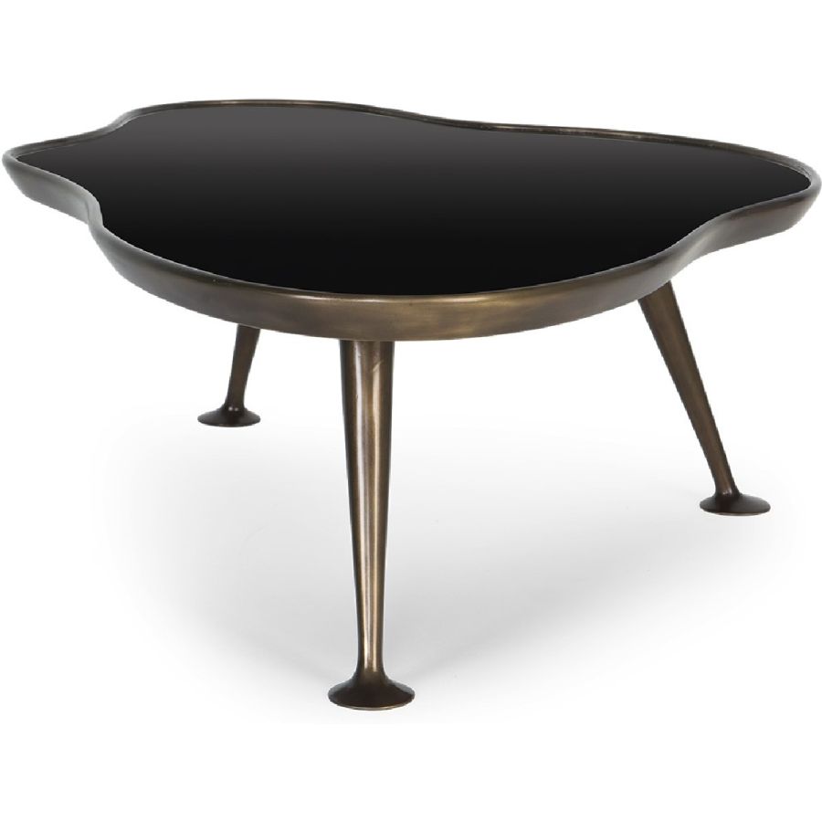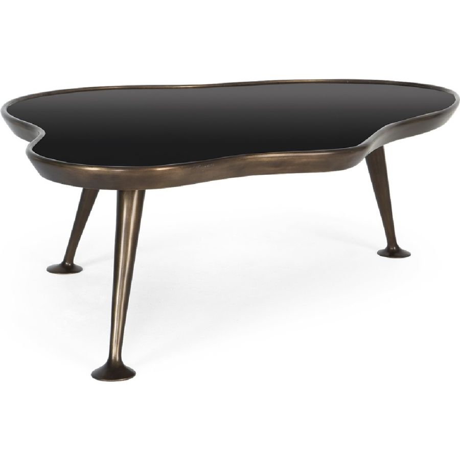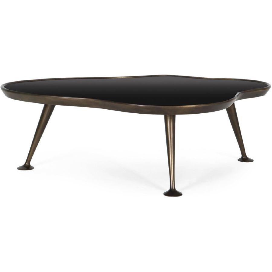 A charming Mid-Century Modern retro styled coffee table with organic shaped top in hand carved wood, and dansette legs crafted in metal and finished in the CG bronzage.