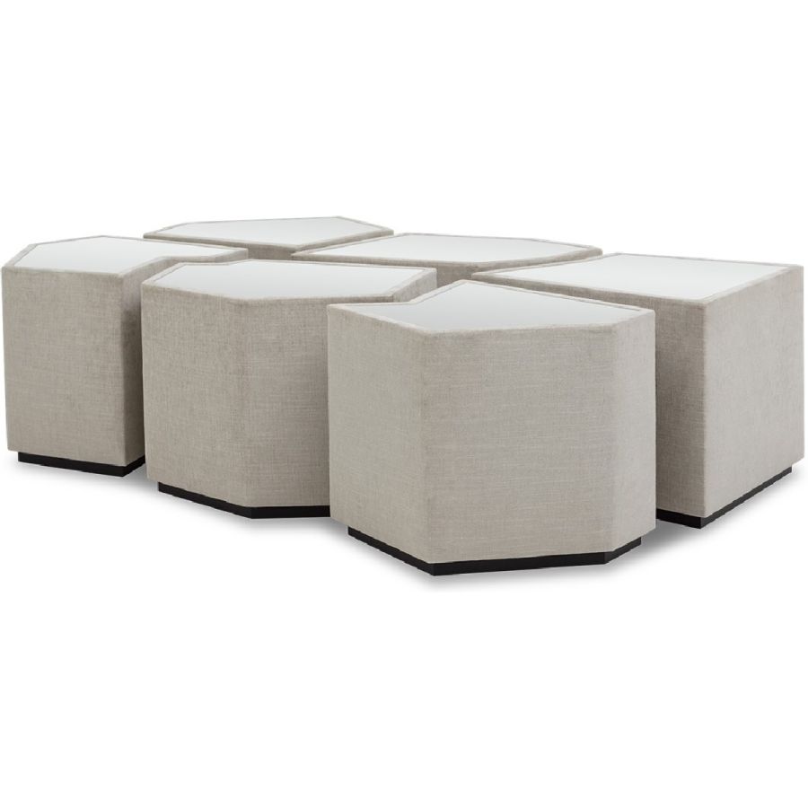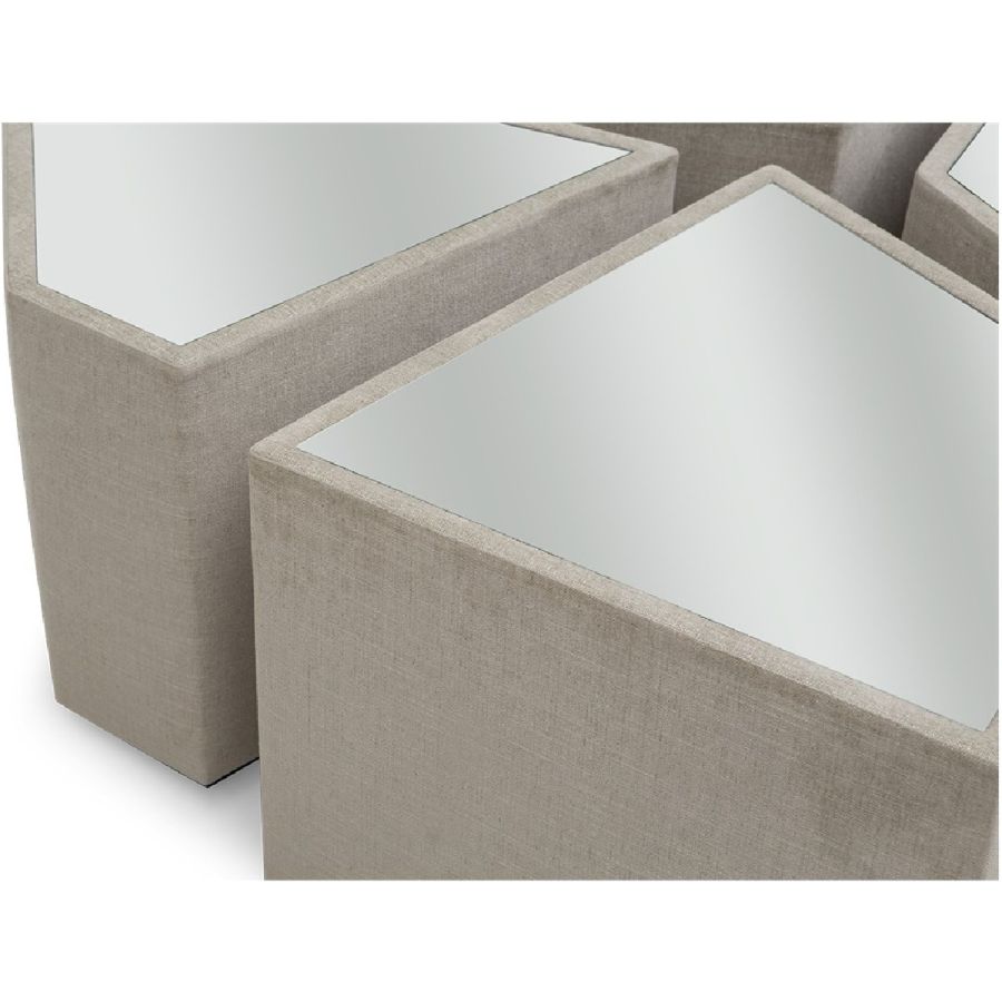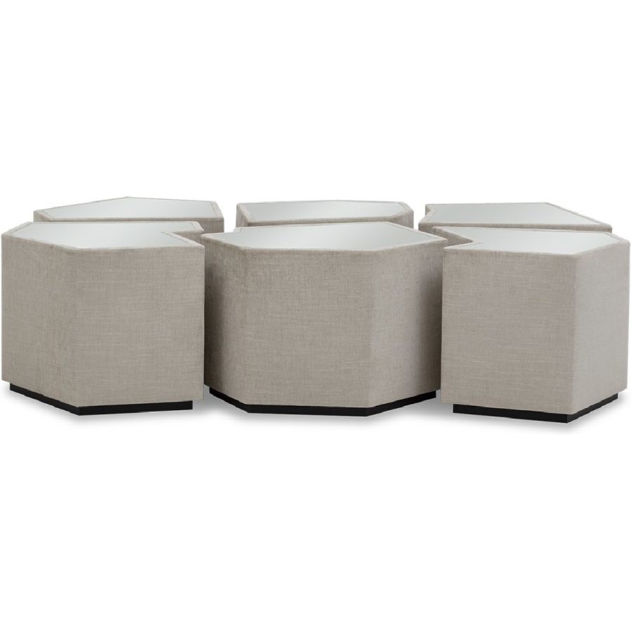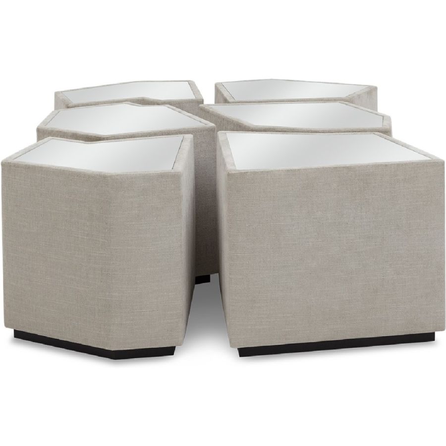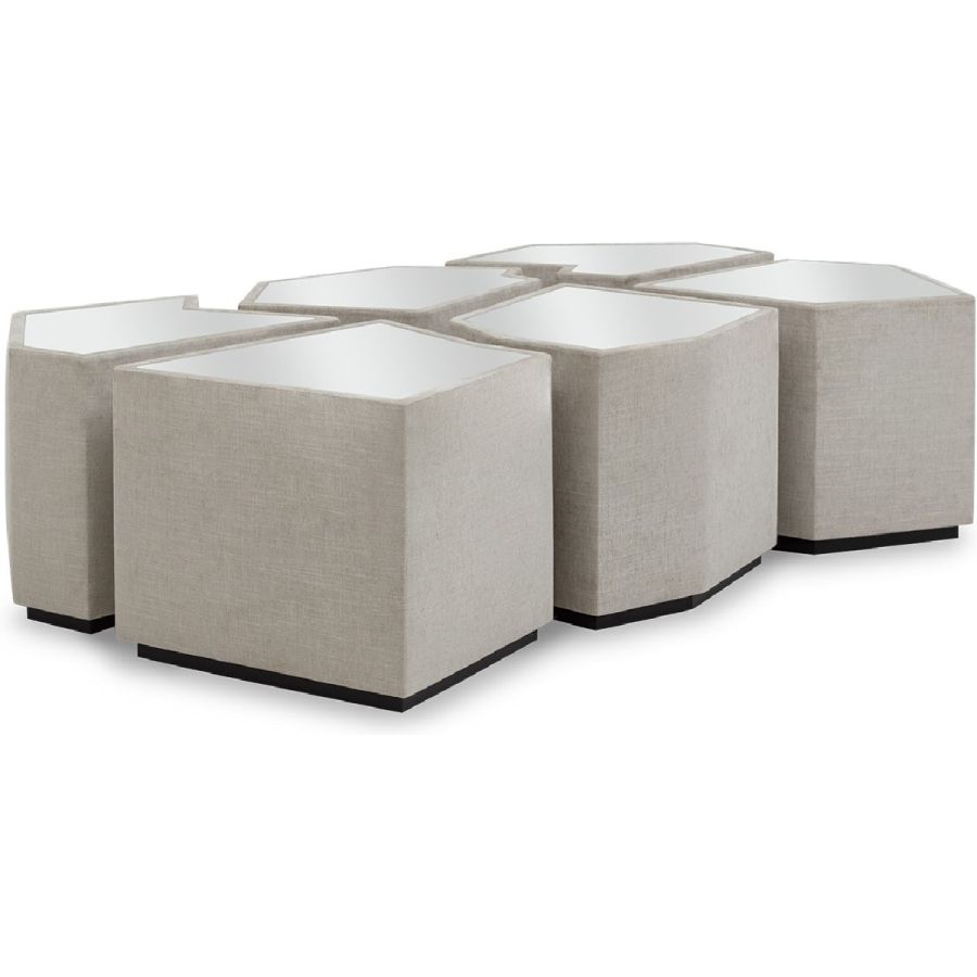 A set of six irregular gem-shaped side or accent tables with mirror tops that can be positioned together to form a coffee table. Practical and beautiful, this set is perfect for any style of living room, and makes for a flexible and unusual table solution.