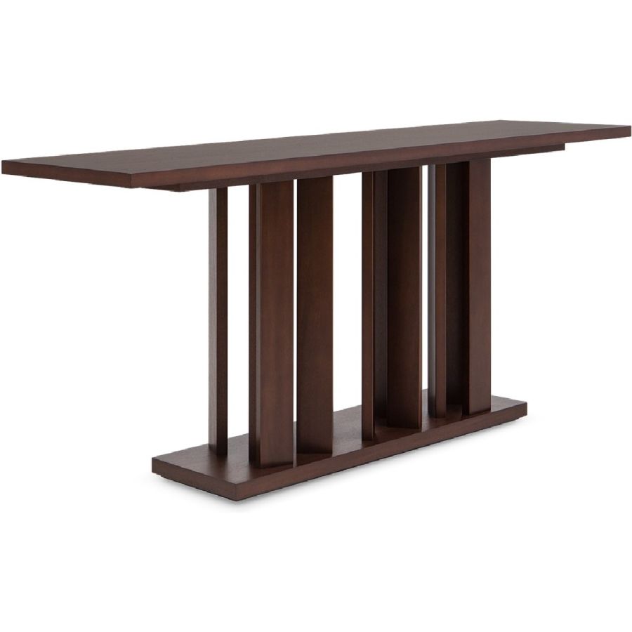 An exceptional grand console table featuring a base with 15 stilts supporting a sleek rectangular top.