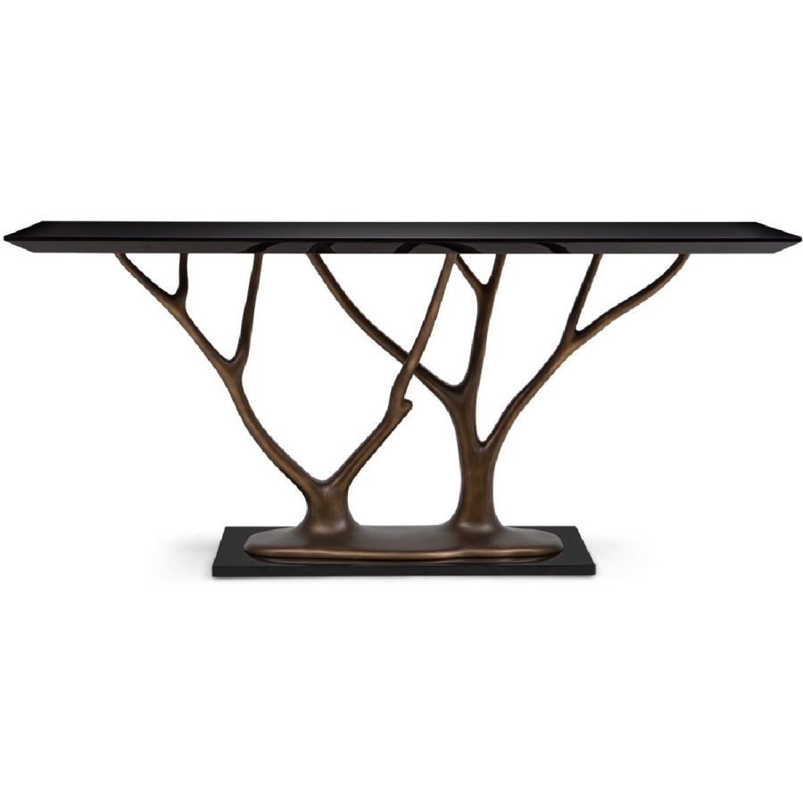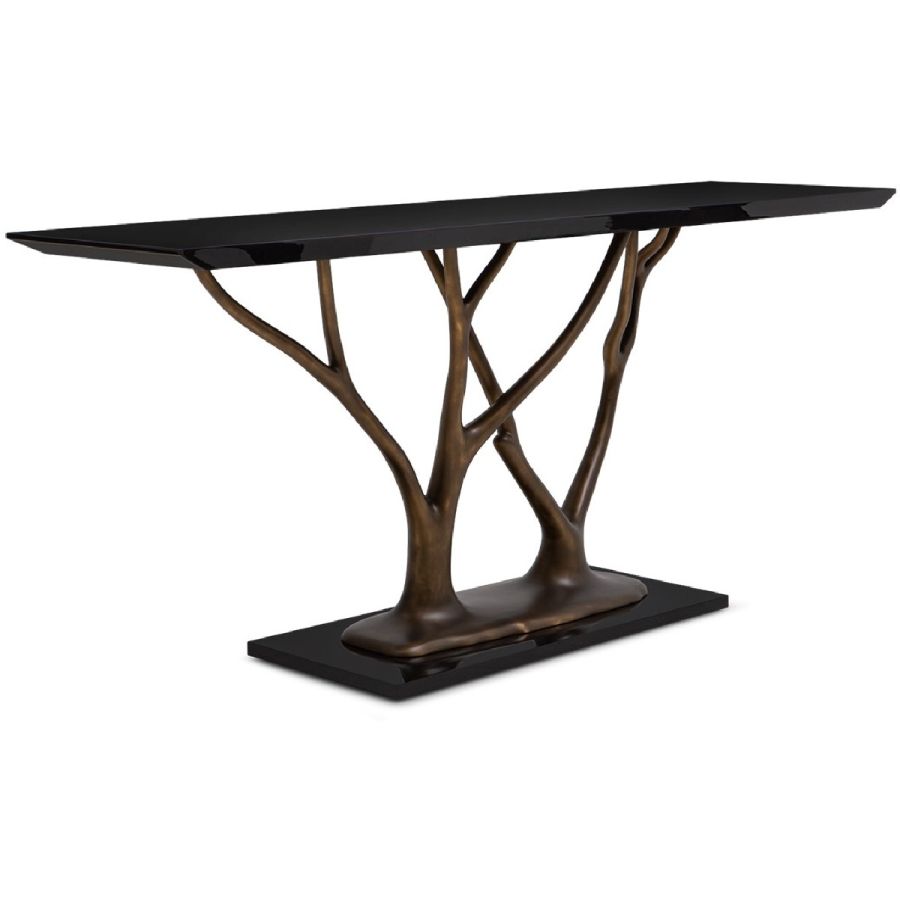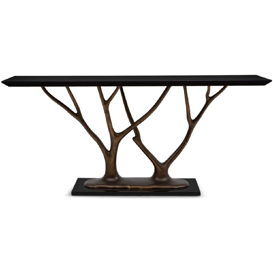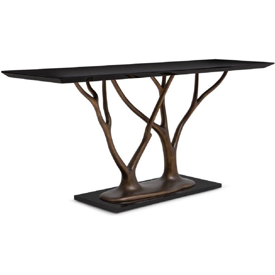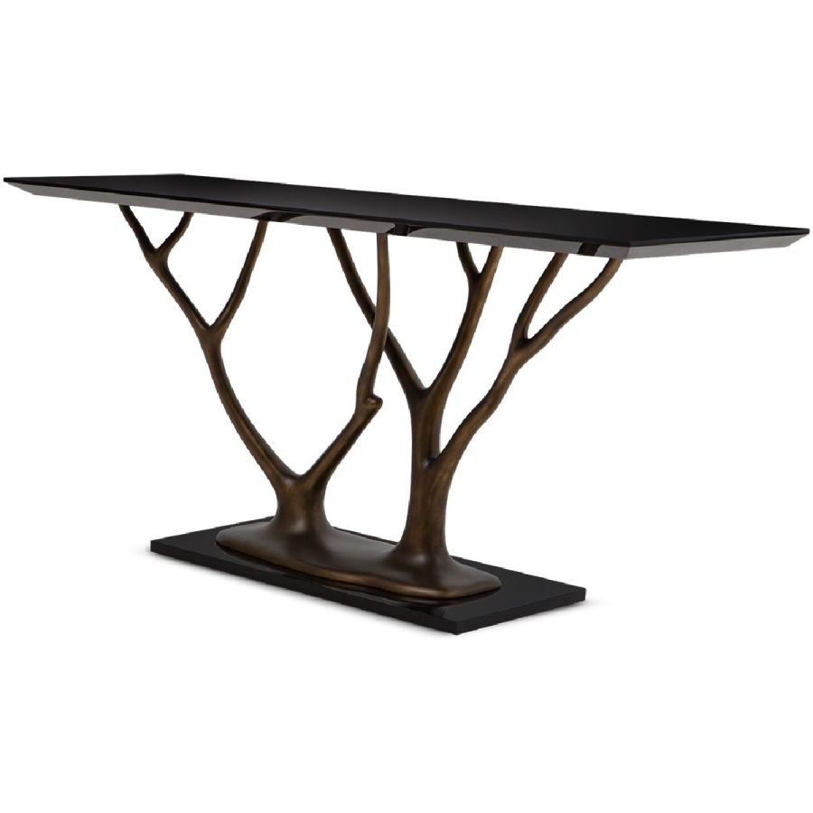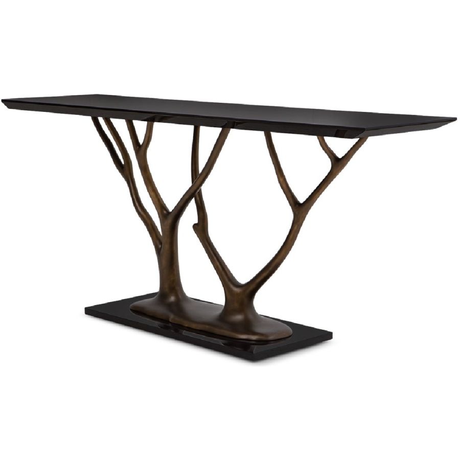 With gracefully stretching hand carved wood ‘branches’ and rectangular top, this exquisite console table makes a truly beautiful statement piece for any entrance or living room setting. Also available with tempered glass top as a center or dining table (76-0604) and side table (76-0607).