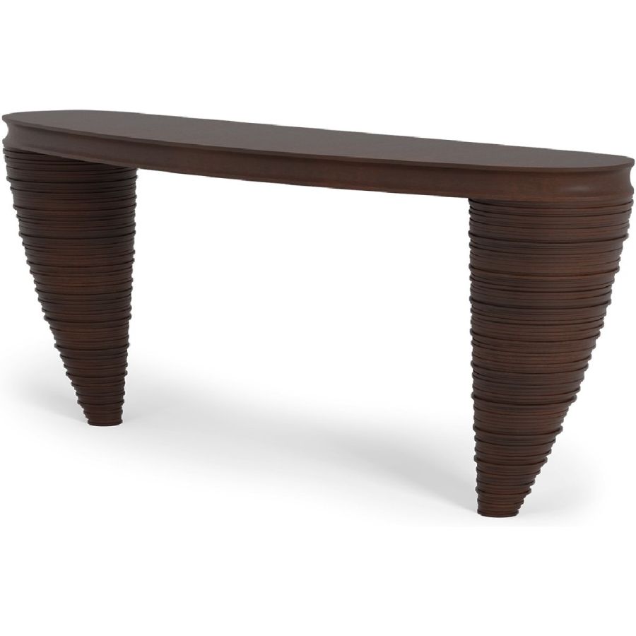 A highly original console table, inspired by a child’s French spinning top, ‘toupie’. The two tapering supports are expertly hand carved with ridges to create the impression of movement, finished with a sleek ovalesque tabletop. A one of a kind design!