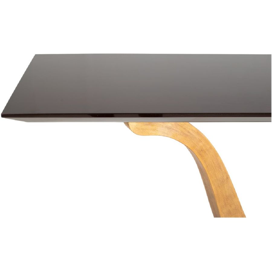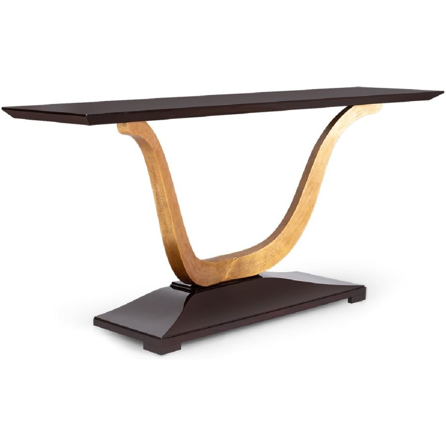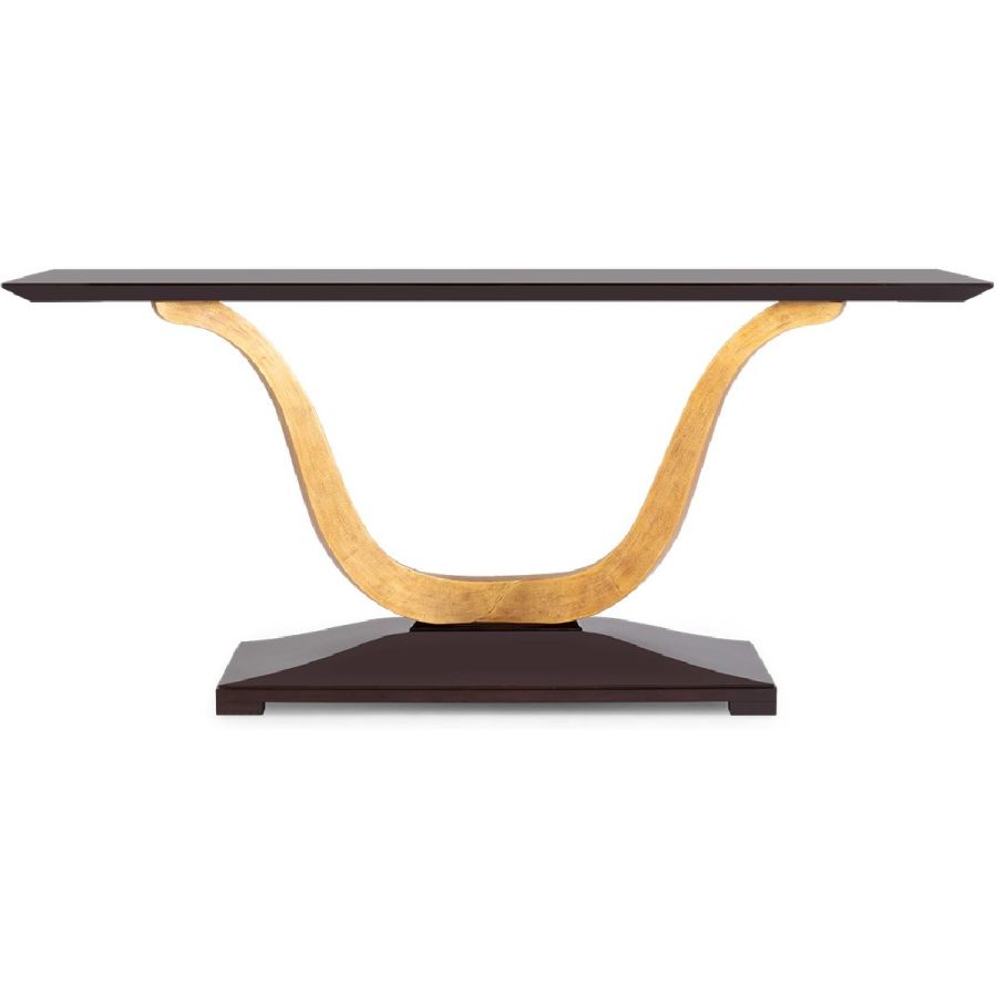A breathtakingly elegant twin support freestanding console table, crafted from solid and veneered mahogany.