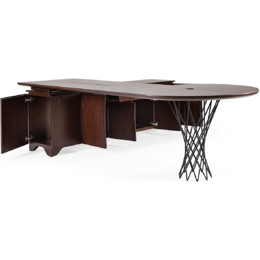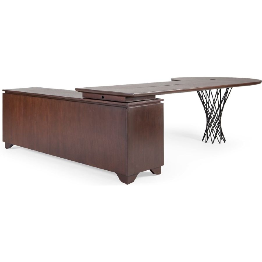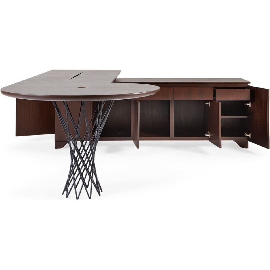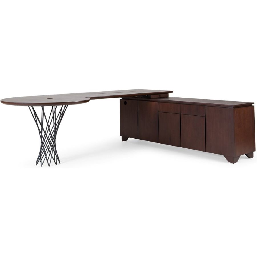 This beautifully crafted L-shaped bureau features storage cupboards, drawers and the signature silk-cut cleverly carved through the desk top to pass through laptop cables.