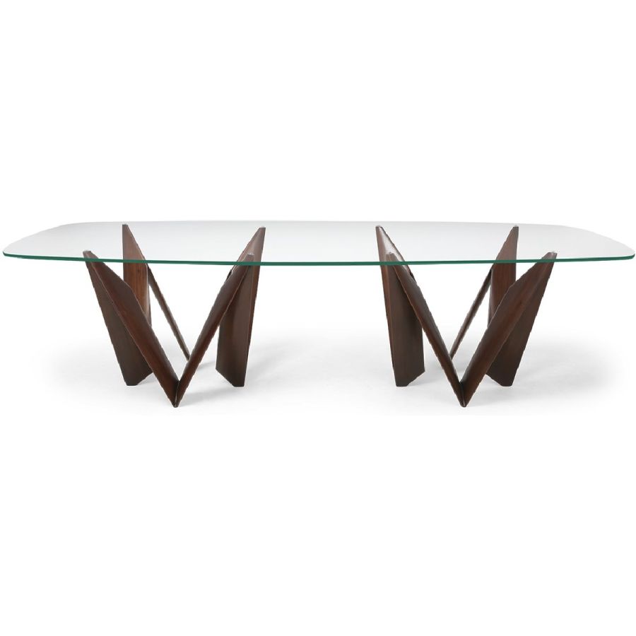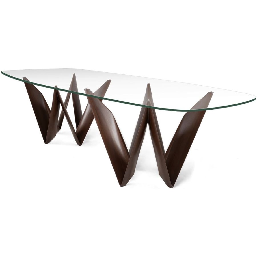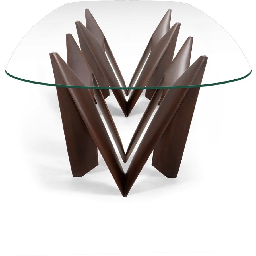 Flared hand carved wood supports in symmetrical kaleidoscope shapes form the base of this ultra-sleek, contemporary style dining table. A glass top brings lightness to the piece, as though floating above the outstretched stars of the base. A true statement piece!