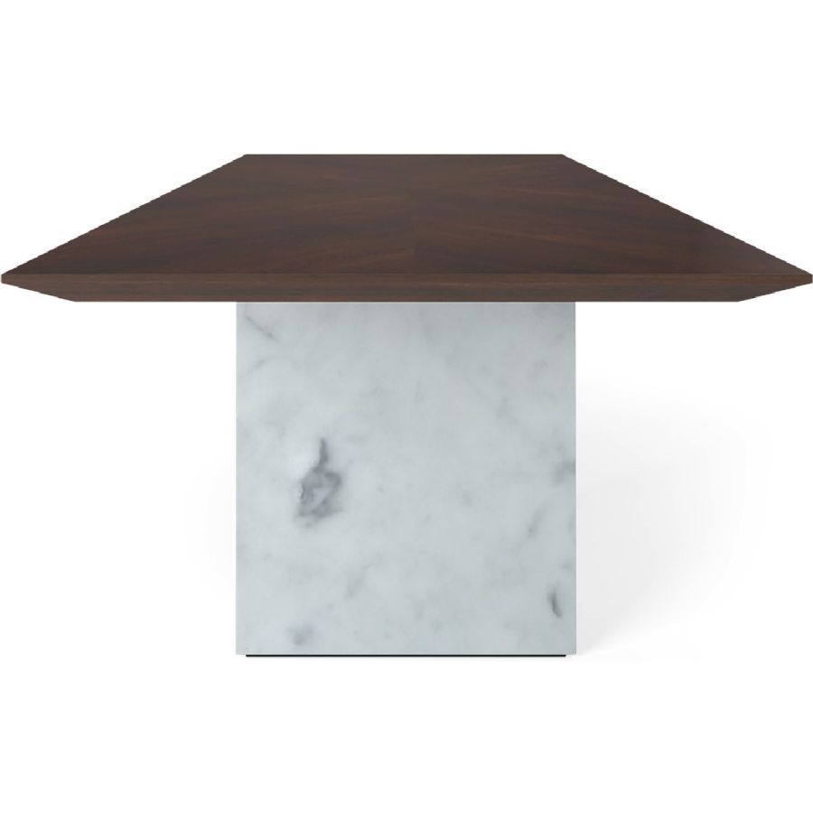 A sleek Modernist dining table featuring two L-shaped white Carrara marble blocks as the base, with a hand carved wood top. Simplicity and stylishness to suit any contemporary interior.