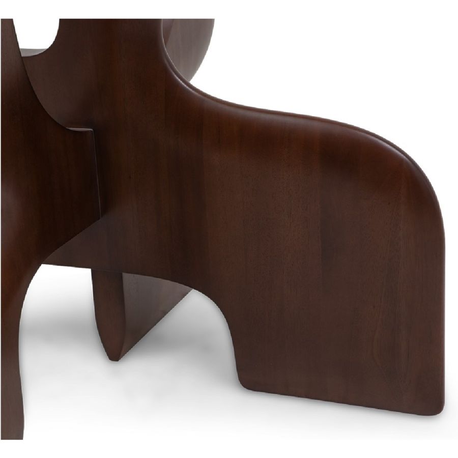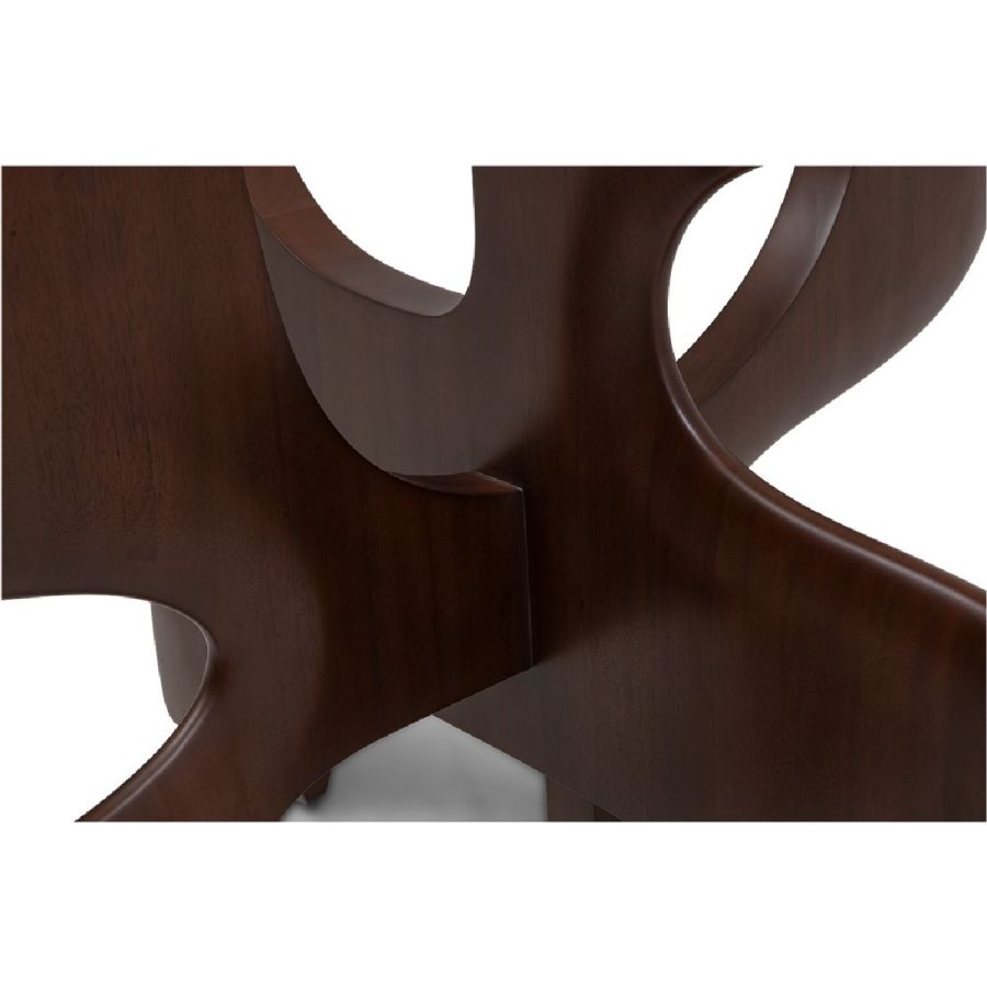 With a hand carved wood base crafted in a slotted abstract pattern inspired by Picasso’s paintings of faces, this extraordinary dining table is crowned with a tempered glass top. Also available with a wood top (76-0633) and as a side table (76-0610).