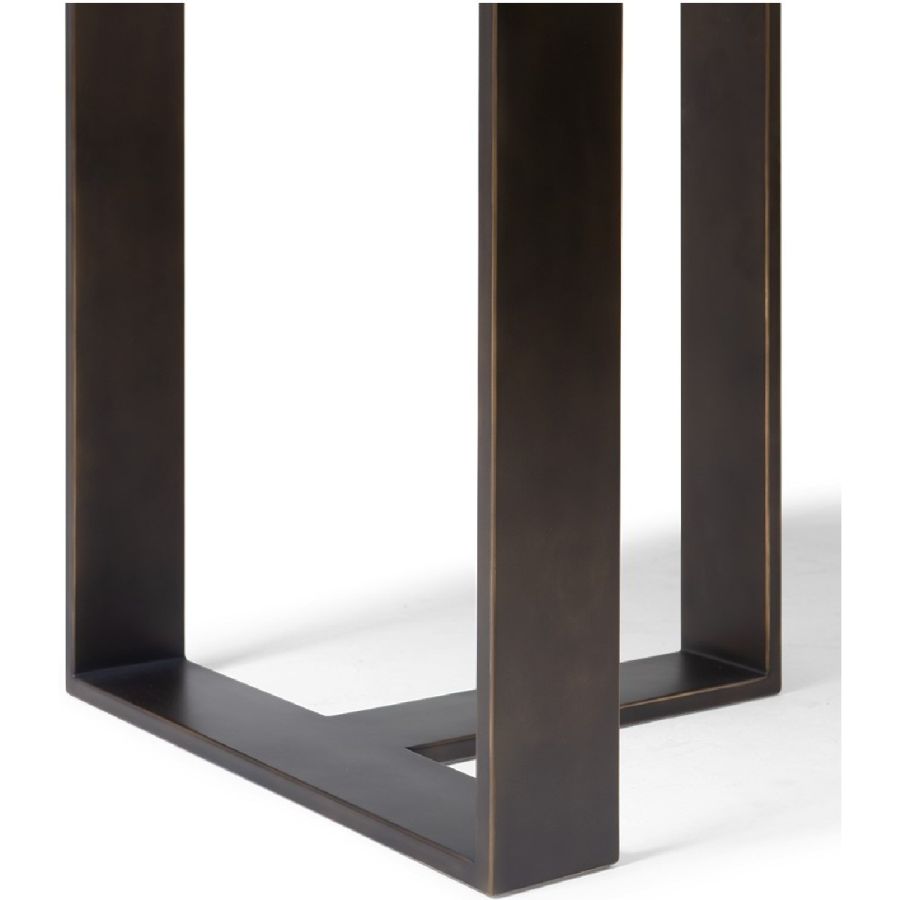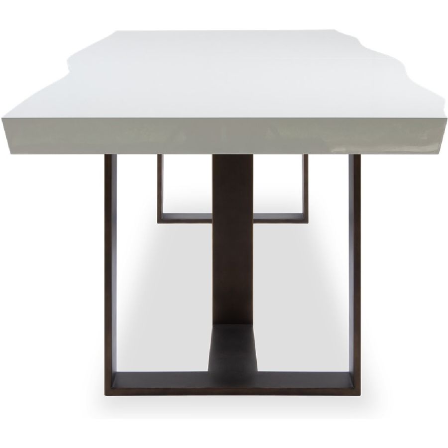 This highly impressive dining table, mimics the sawn plank of an oak tree with natural uneven edges. The base consists of two bronzed steel supports.